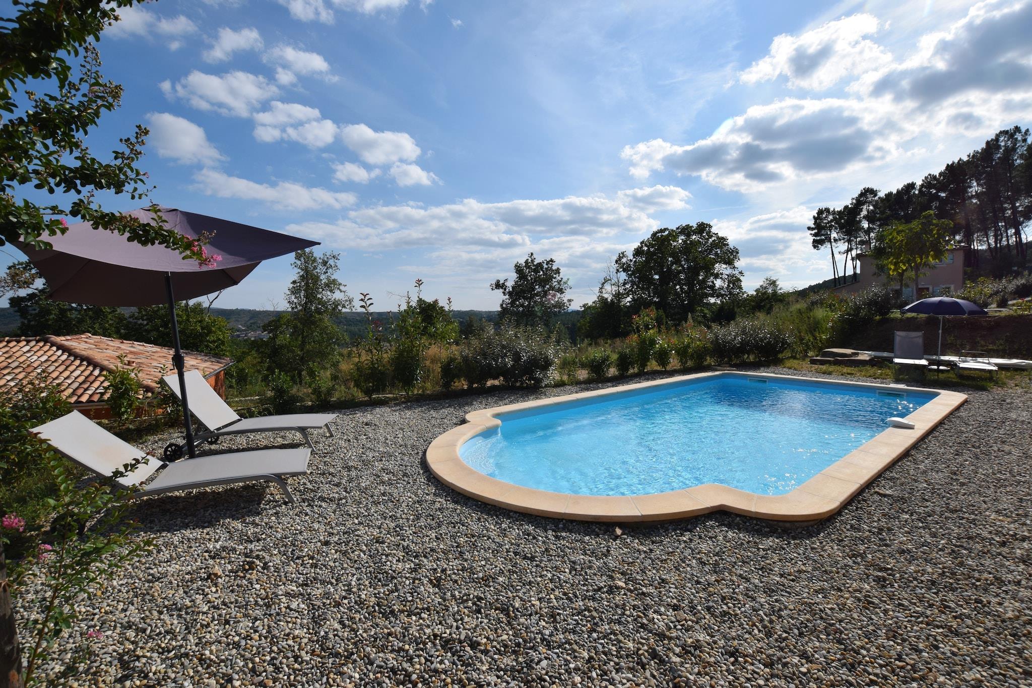 Dette moderne feriehus med en fantastisk indretning er beliggende på en ejendom og bygget mod en bakke i 2016. Villaen og privat swimmingpool byder på fantastisk udsigt over det omkringliggende område og den hyggelige lille by Joyeuse. Indretningen af ??alle villaer er moderne, hyggeligt med en dejlig pejs i stuen. Joyeuse har en rig kulturel og historisk arv, herunder et slott fra det 16. århundrede, Tour de la Recluse og kastanjemuseet