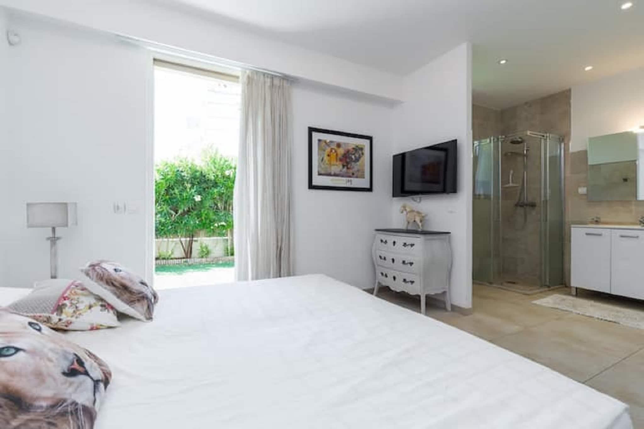 Denne ekspansive villa i Juan-les-Pins tilbyder en luksuriøs kystflugt for op til 14 gæster, kun 100 m fra sandstranden. Stueetagen har en stilfuld stue med pejs, cd-afspiller og tv, en rummelig spiseplads og et fuldt udstyret åbent køkken med espressomaskine, blender og opvaskemaskine. Fire soveværelser og tre badeværelser sikrer komfort og privatliv, mens første sal tilføjer yderligere to stuer, yderligere fire soveværelser, to badeværelser og en opvarmet terrasse. Udendørs kan gæsterne nyde en privat indhegnet swimmingpool (9×5m) med vandalarm, liggestole, BBQ og en lounge i haven. Faciliteterne inkluderer aircondition, fitnessudstyr, bordfodbold og et dampbad. Villaen har også et udendørs køkken, terrasse og flere terrasser til at slappe af eller underholde. Villaen ligger kun 1 km fra Juan-les-Pins centrum og 8 km fra Cannes, tæt på Juan-les-Pins togstation og Nice Lufthavn. Der er masser af spisemuligheder i nærheden, herunder L'escale, Le Bistrot og La Mamma, der tilbyder alt fra klassisk fransk mad til italienske favoritter. Med sin førsteklasses beliggenhed og eksklusive faciliteter er denne villa perfekt til store familier eller grupper, der søger sol, stil og charme ved havet.