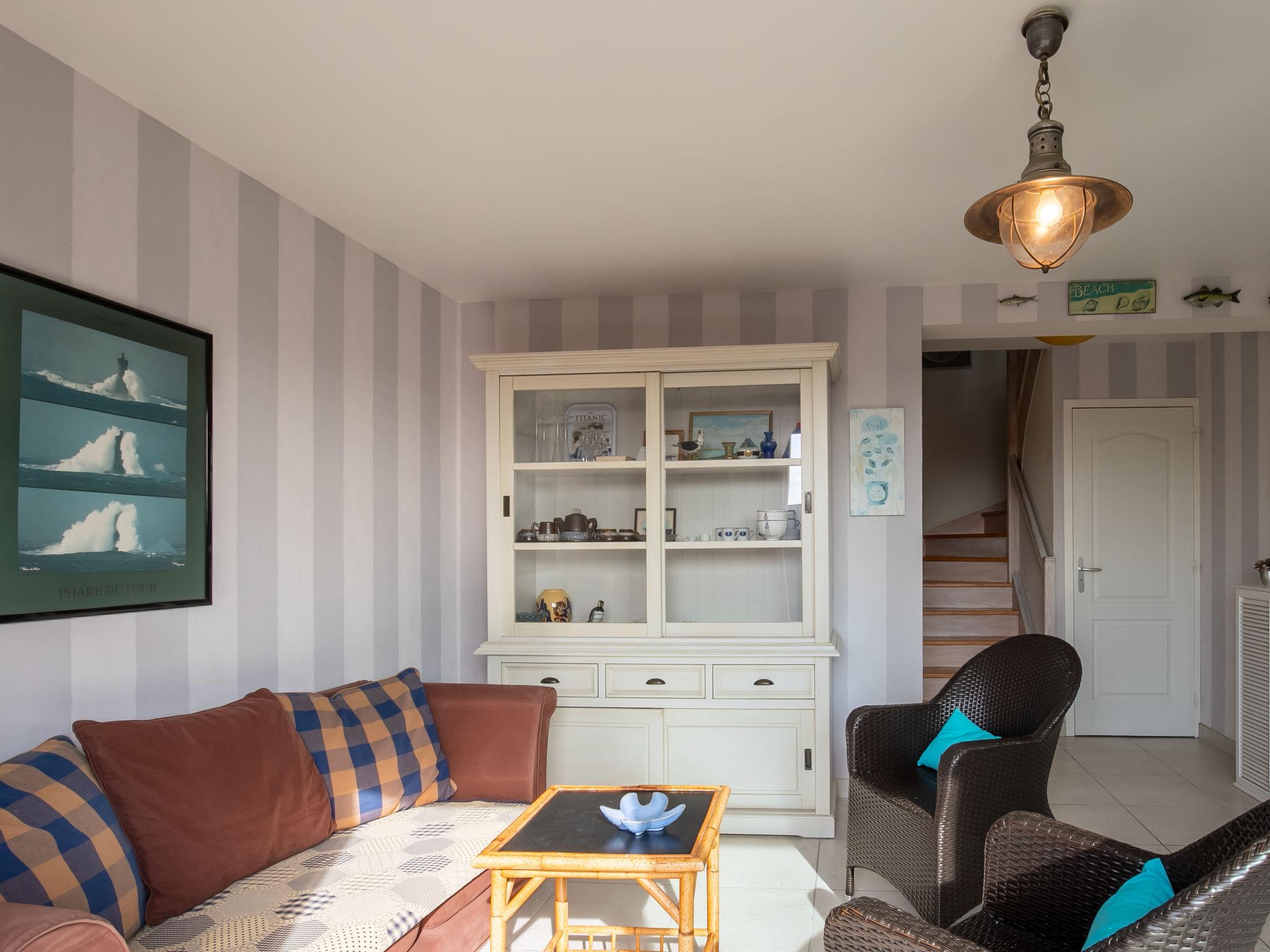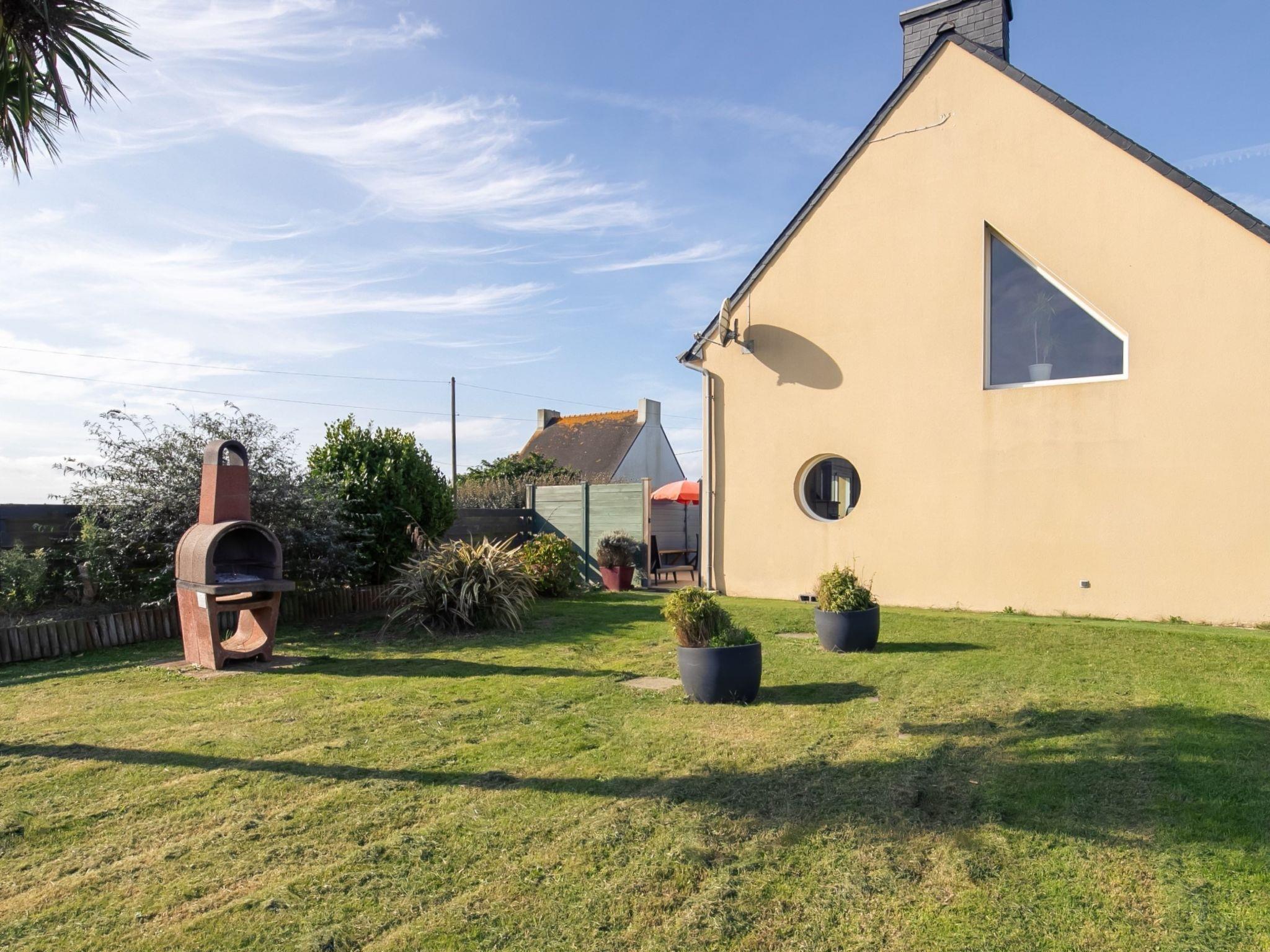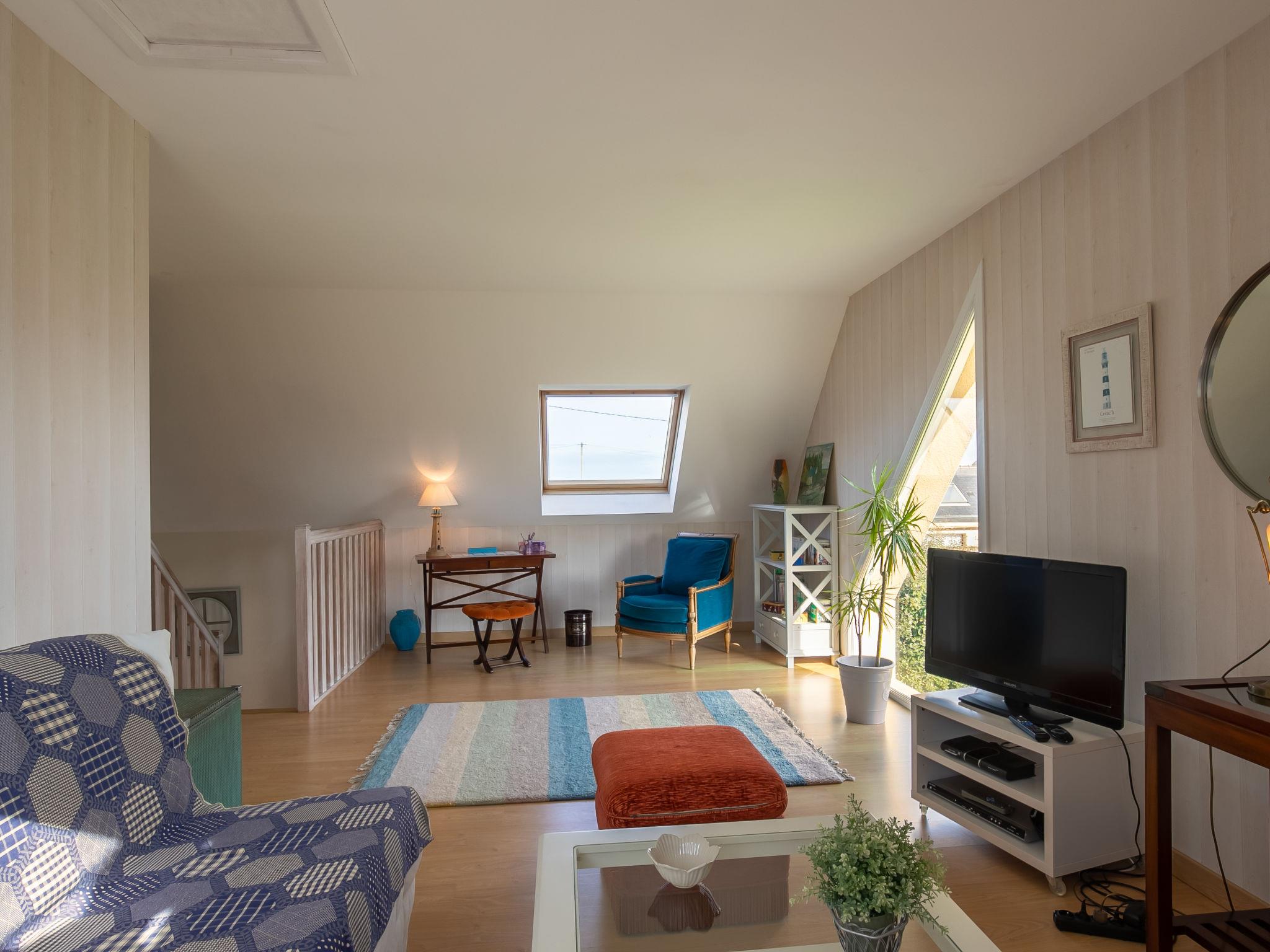 "Sterenn Vor", 5-room semi-detached house 80 m2 on 2 levels. Bright, tasteful and cosy furnishings: living/dining room with dining table, satellite TV, radio, CD-player and DVD. Exit to the terrace. 1 room with sliding door with 1 bed (80 cm, length 190 cm), 1 pull-out bed (2 x 80 cm, length 190 cm). Open kitchen (oven, dishwasher, 3 induction hot plates, toaster, kettle, microwave, freezer, electric coffee machine). Shower, sep. WC, double hand-basin. Electric heating. Upper floor: open living room with sloping ceilings with satellite TV, radio, CD-player and DVD. 1 room with sloping ceilings with 2 beds (80 cm, length 190 cm). 1 room with sloping ceilings with 1 french bed (140 cm, length 190 cm). Parquet floors. Terrace, garden 400 m2, lawn. Terrace furniture, barbecue, deck chairs (2). Facilities: washing machine, iron, children's high chair, baby cot. Please note: non-smoking house. Smoke alarm. Bed layout is flexible. There are more sleeping options available than the maximum number of people allowed which may, however, not be exceeded.