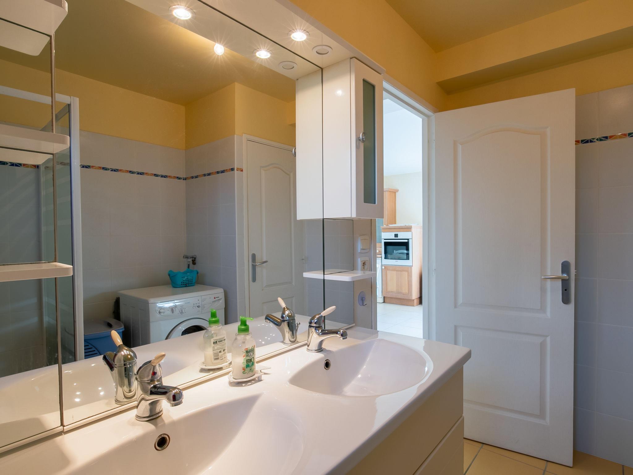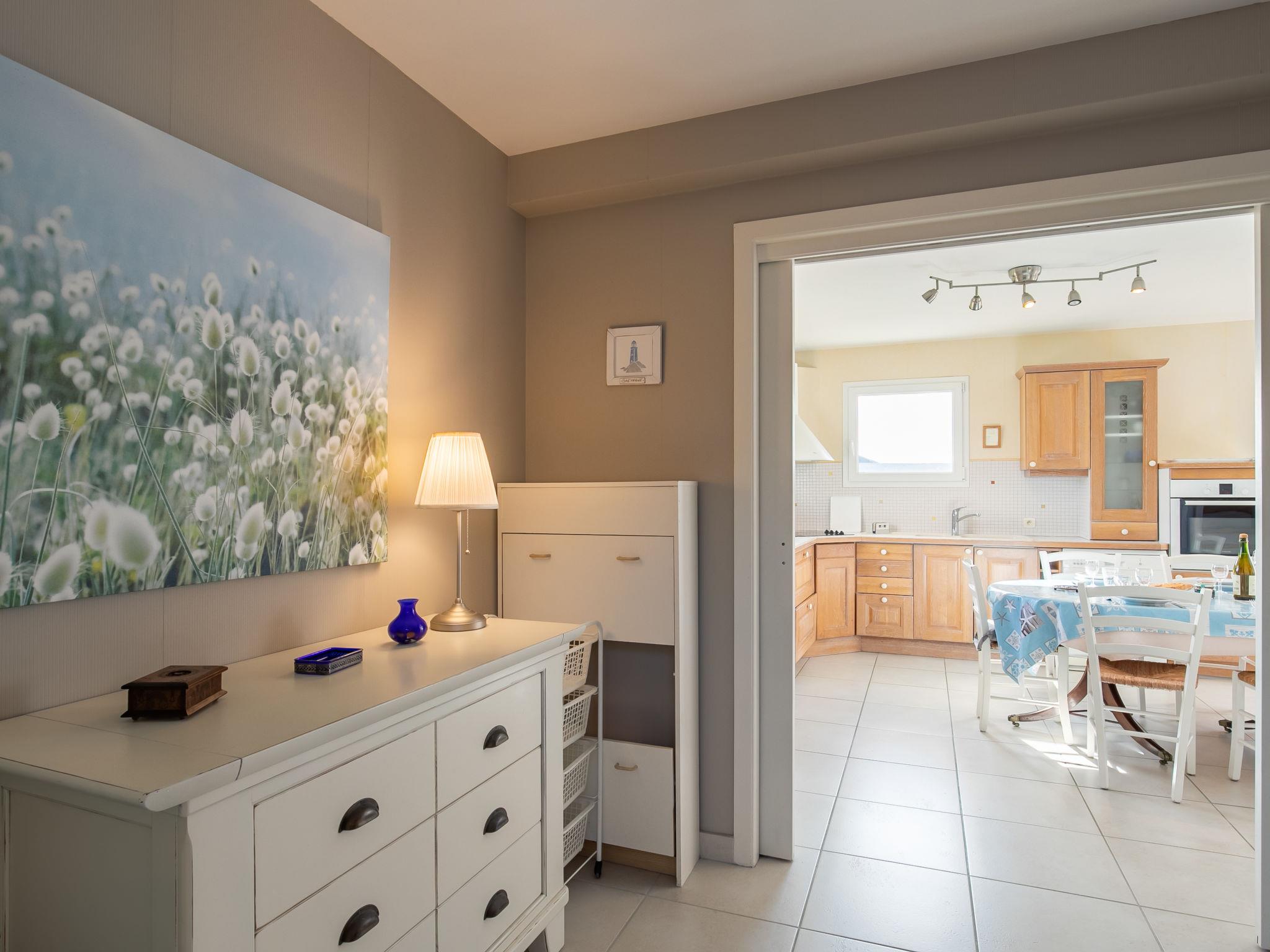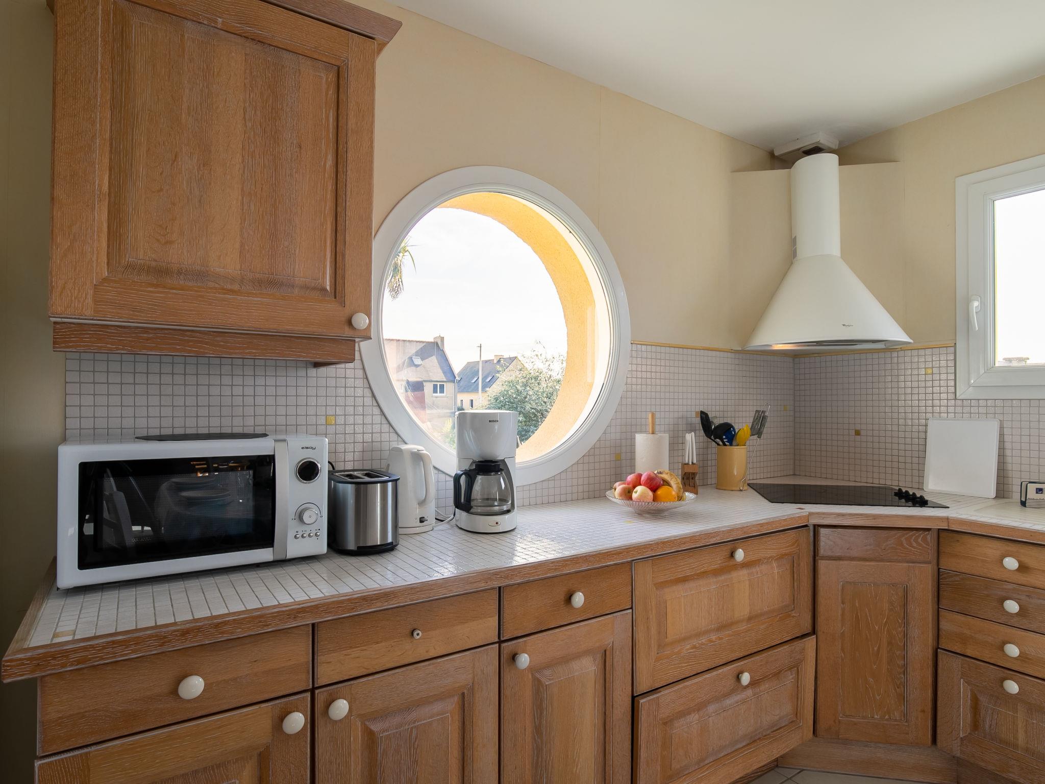 "Sterenn Vor", 5-room semi-detached house 80 m2 on 2 levels. Bright, tasteful and cosy furnishings: living/dining room with dining table, satellite TV, radio, CD-player and DVD. Exit to the terrace. 1 room with sliding door with 1 bed (80 cm, length 190 cm), 1 pull-out bed (2 x 80 cm, length 190 cm). Open kitchen (oven, dishwasher, 3 induction hot plates, toaster, kettle, microwave, freezer, electric coffee machine). Shower, sep. WC, double hand-basin. Electric heating. Upper floor: open living room with sloping ceilings with satellite TV, radio, CD-player and DVD. 1 room with sloping ceilings with 2 beds (80 cm, length 190 cm). 1 room with sloping ceilings with 1 french bed (140 cm, length 190 cm). Parquet floors. Terrace, garden 400 m2, lawn. Terrace furniture, barbecue, deck chairs (2). Facilities: washing machine, iron, children's high chair, baby cot. Please note: non-smoking house. Smoke alarm. Bed layout is flexible. There are more sleeping options available than the maximum number of people allowed which may, however, not be exceeded.