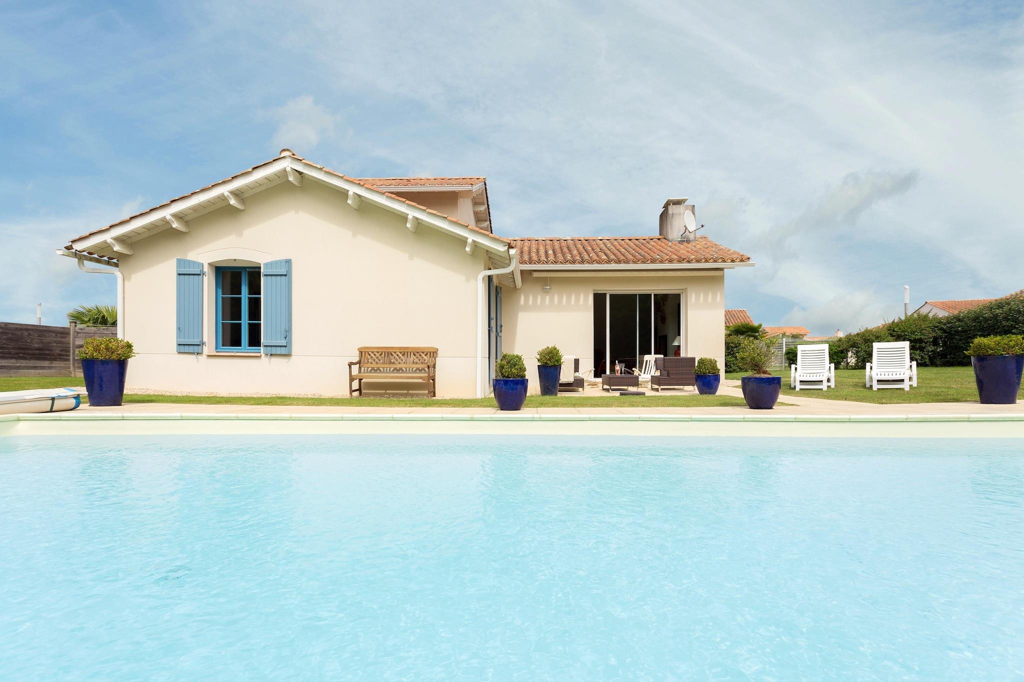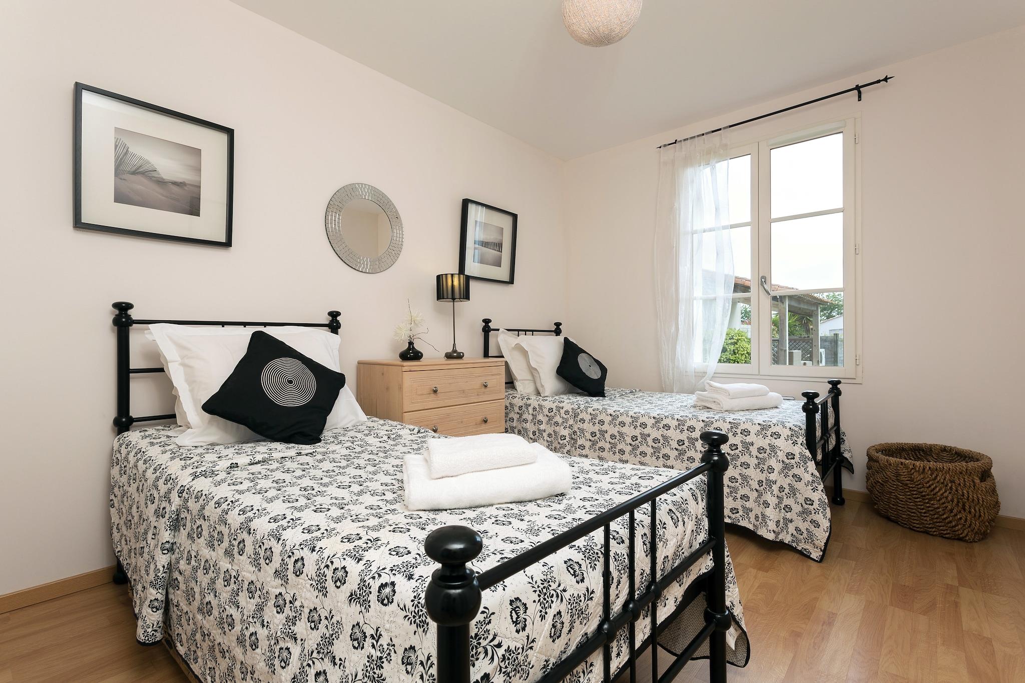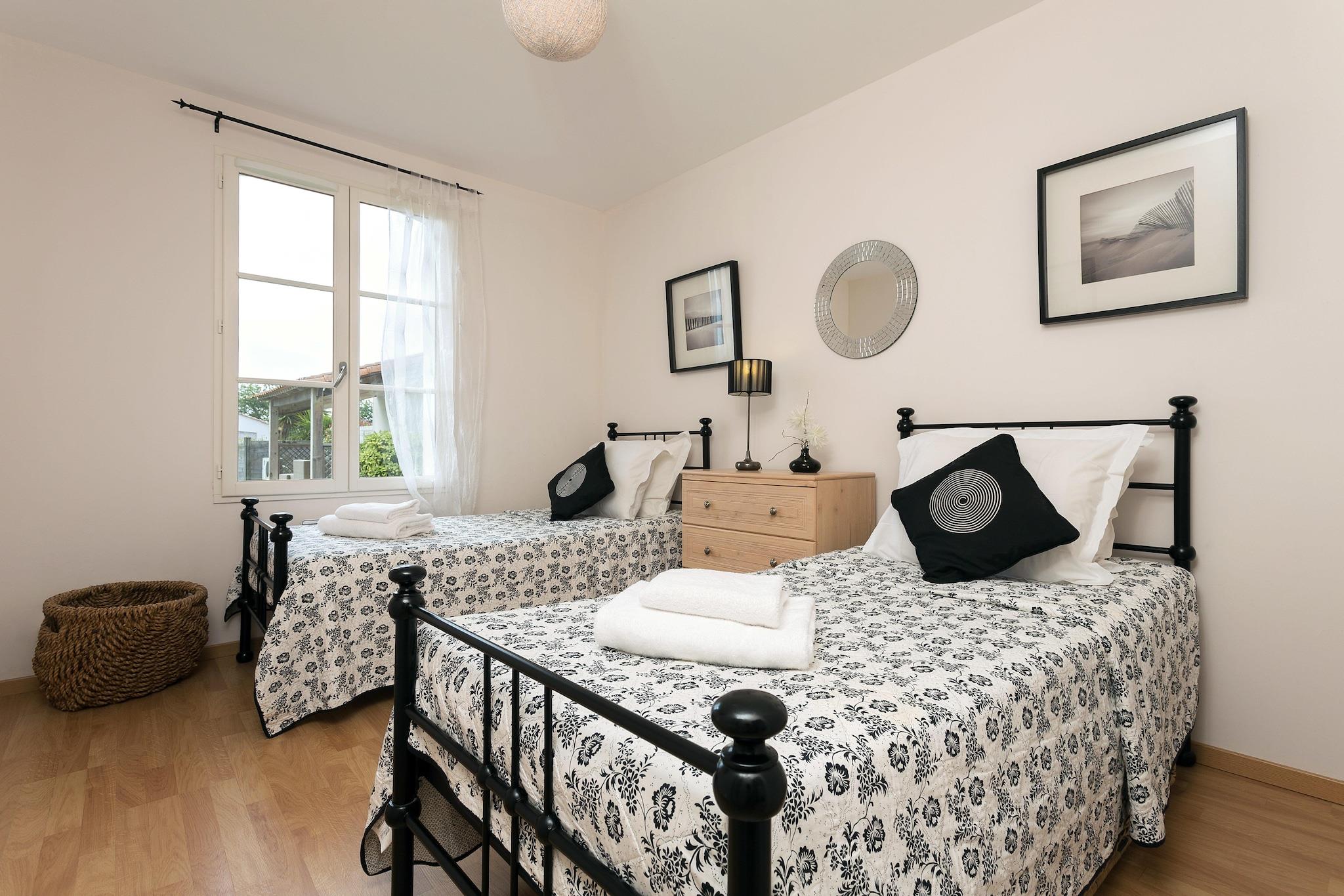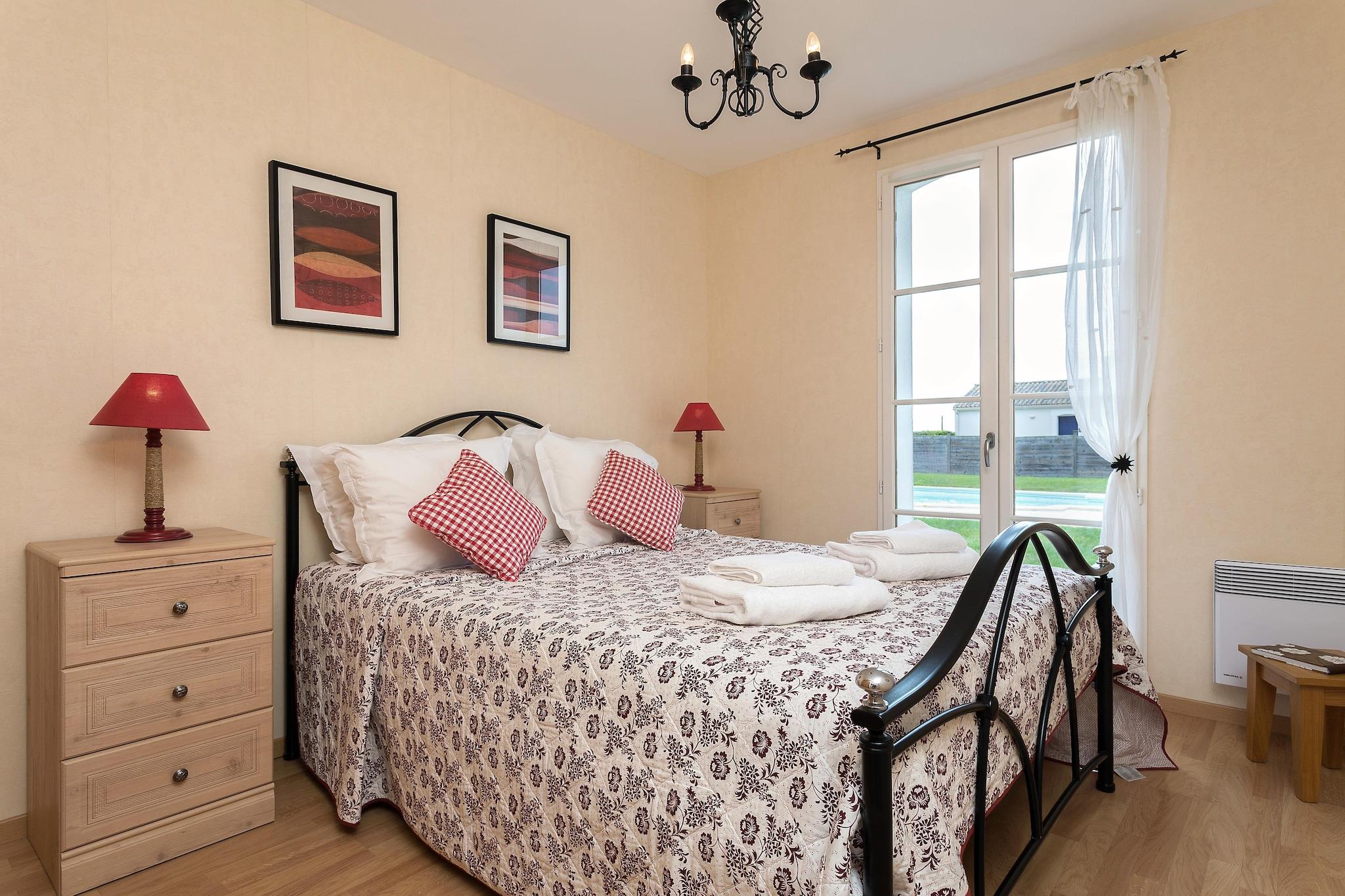 Stilfuld komfort med privat pool Træd ind i dit eget stykke fransk landskabslykke. Denne solbeskinnede villa har et åbent køkken, en luftig stue/spisestue og tre hyggelige soveværelser med fleksibelt sengetøj, der passer til enhver gruppe. Franske døre åbner til en privat, indhegnet have med en rummelig terrasse og en smuk 9x4m privat pool - perfekt til dovne morgener eller stjerneklare aftendukker. Med to badeværelser og masser af plads på ét plan, kommer komfort og lethed naturligt her. Ideelle omgivelser mellem natur og kyst Beliggende i det fredelige hjerte af Loire-regionen, er du kun få minutter fra sandstrande, naturskønne cykelstier og golfbaner. Tag din lodne ven i snor til en naturtur langs Val de Vie-stierne, eller nyd en afslappet eftermiddag ved Plage des Dunes, en af områdets kæledyrsvenlige strande. Med udsigt over landskabet og nærliggende skove byder dit ophold på ro til dig og halelogrende eventyr for dit kæledyr. Nyd det lokale liv og smag Nyd friske råvarer fra Coëx-markedet, eller spis ved havet i Saint-Gilles-Croix-de-Vie, hvor fisk og skaldyr og solnedgange er stjernerne. For en afslappet aften, snup en flaske lokal Muscadet og fyr op til grillen på terrassen. Uanset om du er her for familietid, et golfferiested eller en kæledyrsvenlig flugt, blander denne villa stil, komfort og beliggenhed til et uforglemmeligt ophold.