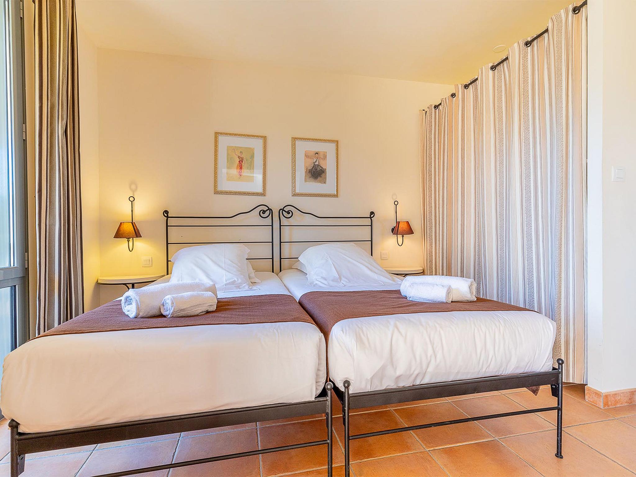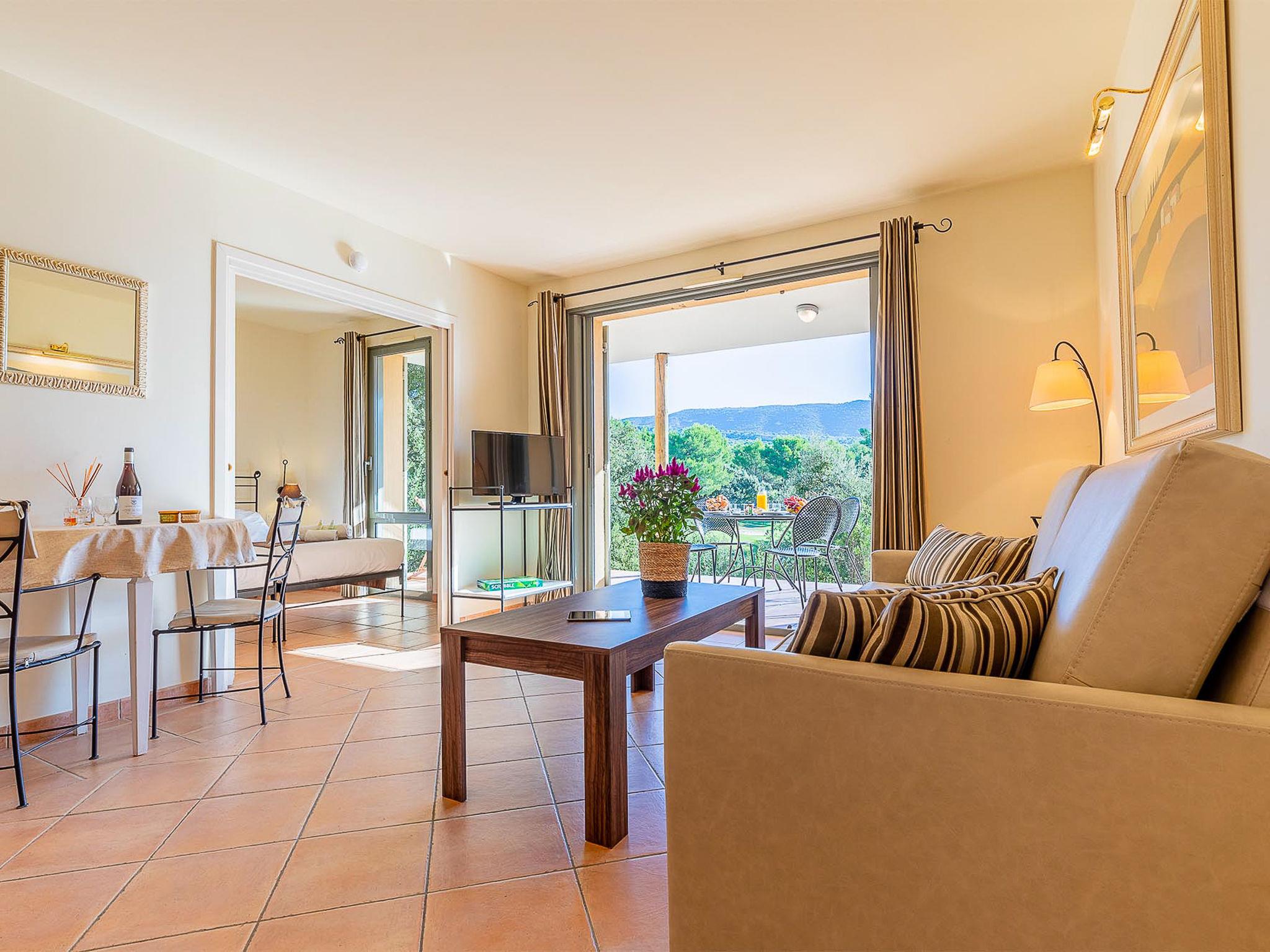 "Provence Country Club", 3-room apartment 46 m2. Beautiful furnishings: living/sleeping room with 1 sofabed, 1 pull-out bed, dining table and TV. 1 room with sliding door with 2 beds. 1 small room with 1 sofabed and 1 pull-out bed. Kitchenette (dishwasher, 4 ceramic glass hob hotplates, toaster, kettle, microwave, electric coffee machine). Bathroom, sep. WC. Electric heating. Balcony or terrace. Terrace furniture, balcony furniture. Facilities: safe (extra), children's high chair, baby cot. Internet (WiFi, extra). Parking. Please note: non-smokers only. Maximum 2 pets/ dogs allowed. Smoke alarm, fire extinguisher.