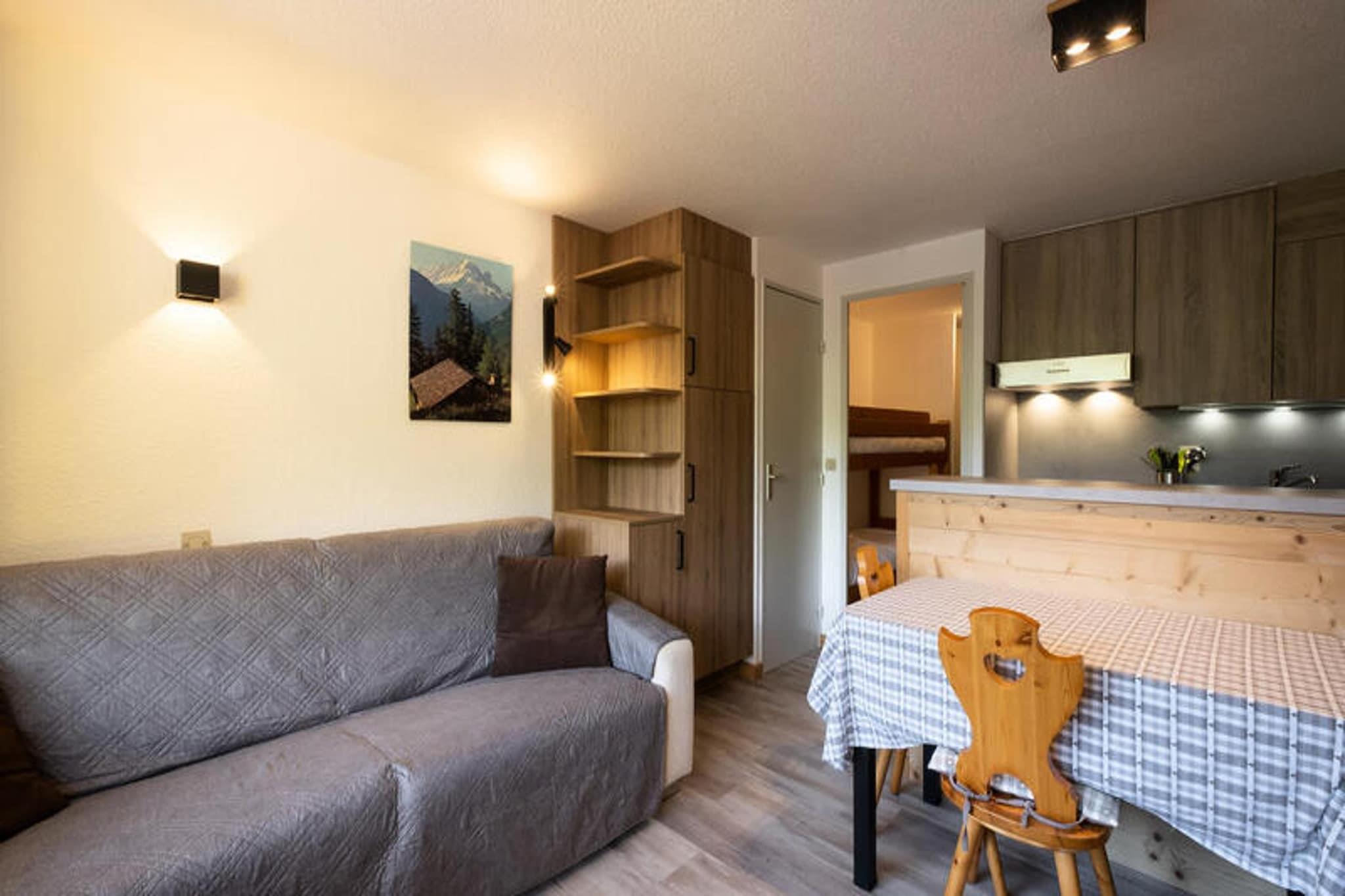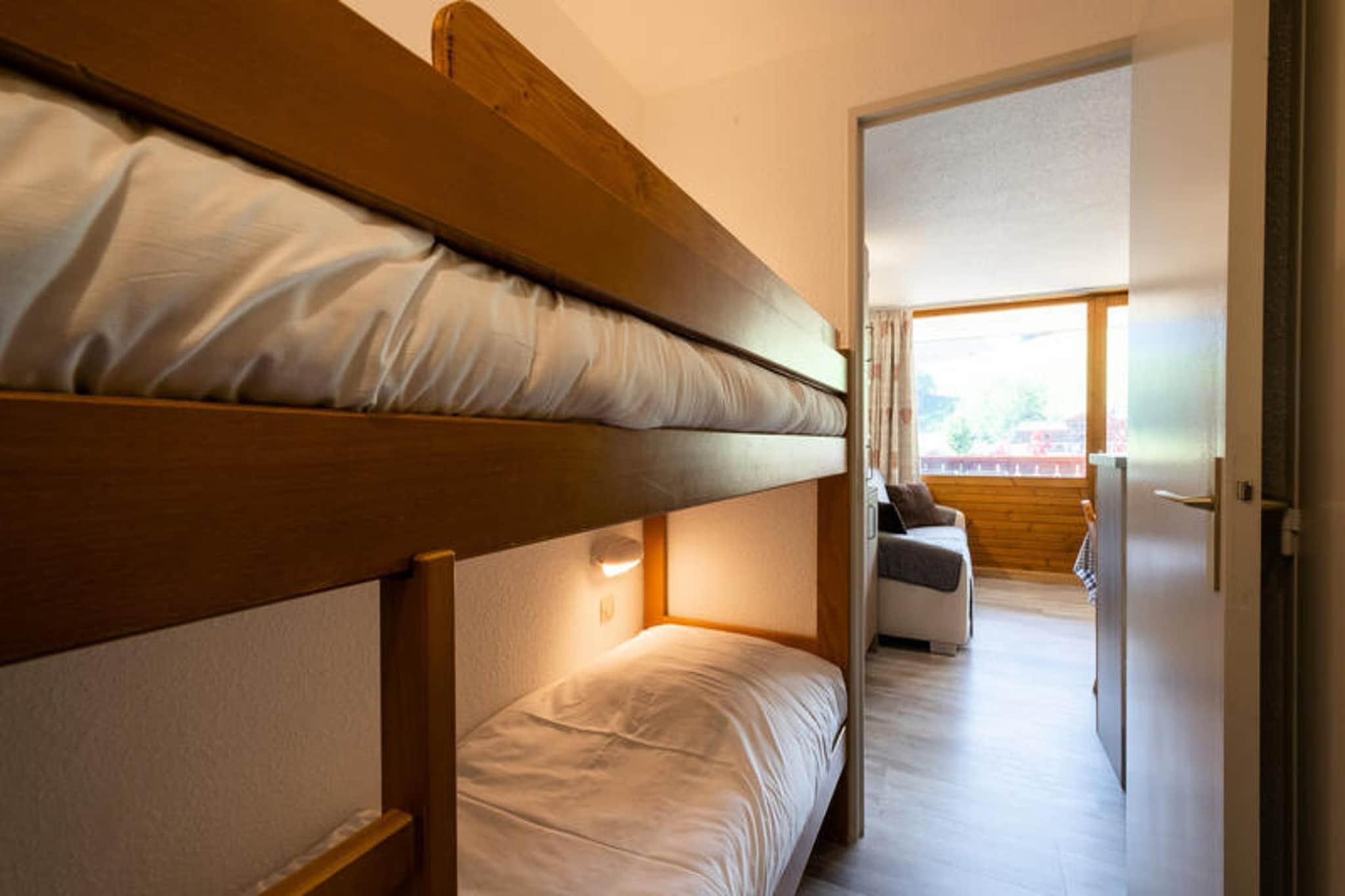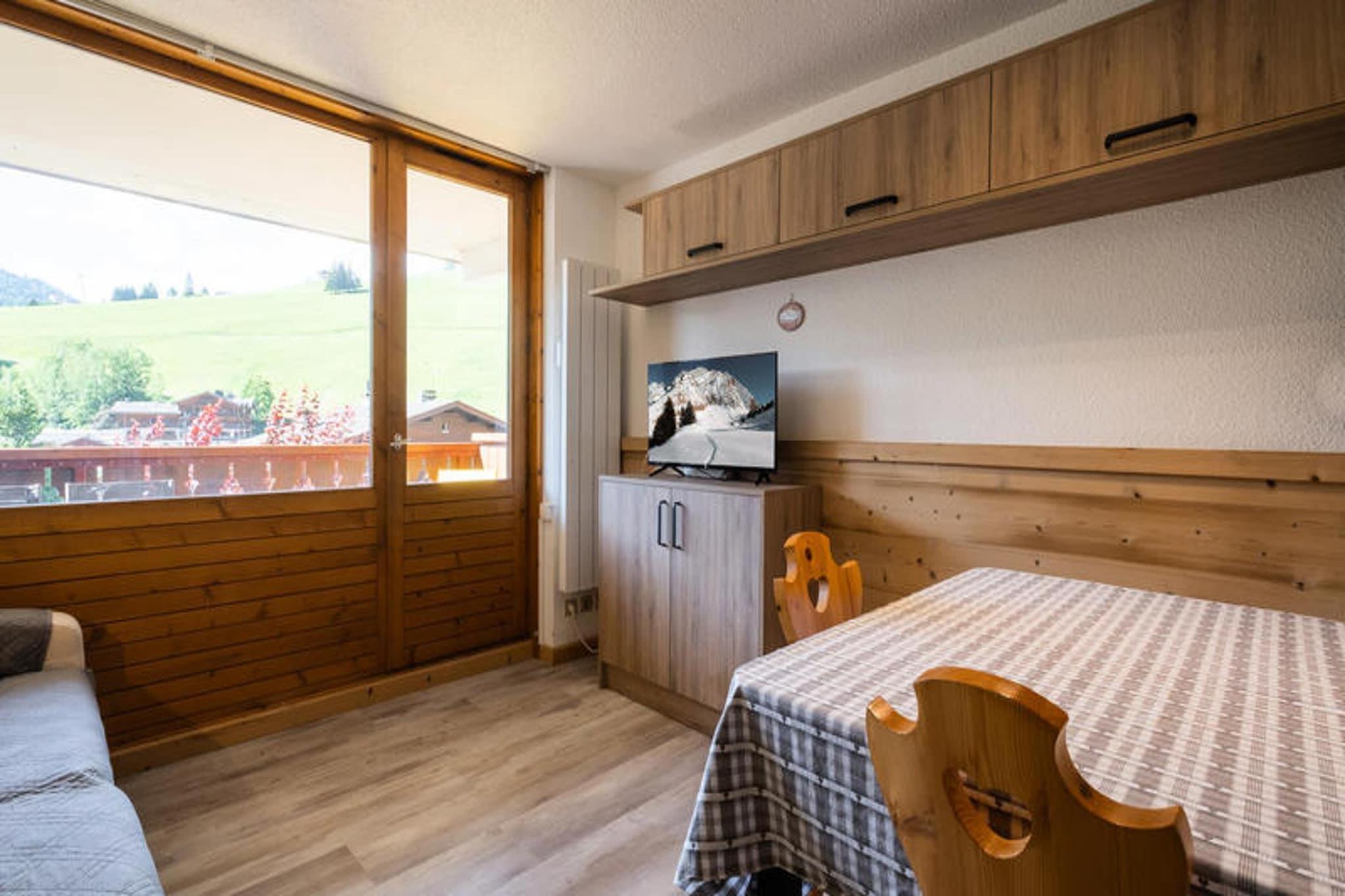 Dette charmerende studie med et sovehjørne er ideelt for 2 til 4 rejsende og tilbyder et hyggeligt 21m² stort rum på første sal i en bolig beliggende øverst i landsbyen. Lejligheden har et sovehjørne med to køjesenge (for børn over 6 år), et badeværelse med badekar og et separat toilet. Tekøkkenet er veludstyret med køleskab, mikrobølgeovn, keramiske kogeplader og opvaskemaskine. I stuen er der en rapido-sovesofa, fladskærms-tv og en spiseplads med adgang til en sydvendt balkon, der byder på en fantastisk udsigt over bjergene og masser af solskin. Sengetøj, inklusive dynebetræk, lagner og pudebetræk, er til rådighed. Lejligheden er ikke-ryger, og kæledyr er ikke tilladt. Boligen har en fremragende beliggenhed, kun 250 meter fra Bossonnet Telemix, stoleliften og skiløjperne (baneafgang for skiskoler), hvilket gør den perfekt for skientusiaster. Det nærliggende busstoppested giver nem adgang til andre dele af landsbyen, med et stop direkte foran boligen om vinteren og 240 meter væk om sommeren. Boligen er også i gåafstand til lokale butikker, hvilket øger dens bekvemmelighed. Yderligere faciliteter inkluderer en privat garageplads (Garage A 15), et skiskab og elvarme med gulvvarme for komfort. Bygningen har elevator, og boligen er opført i 1989, bestående af 43 lejligheder. Ejendommen er ikke egnet til personer med nedsat mobilitet. Nærliggende transportmuligheder omfatter Annecy SNCF-togstation, 3 km væk, og La Clusaz-busstationen, som ligger 1,05 km fra boligen. Der kræves et refunderbart depositum på EURO500.