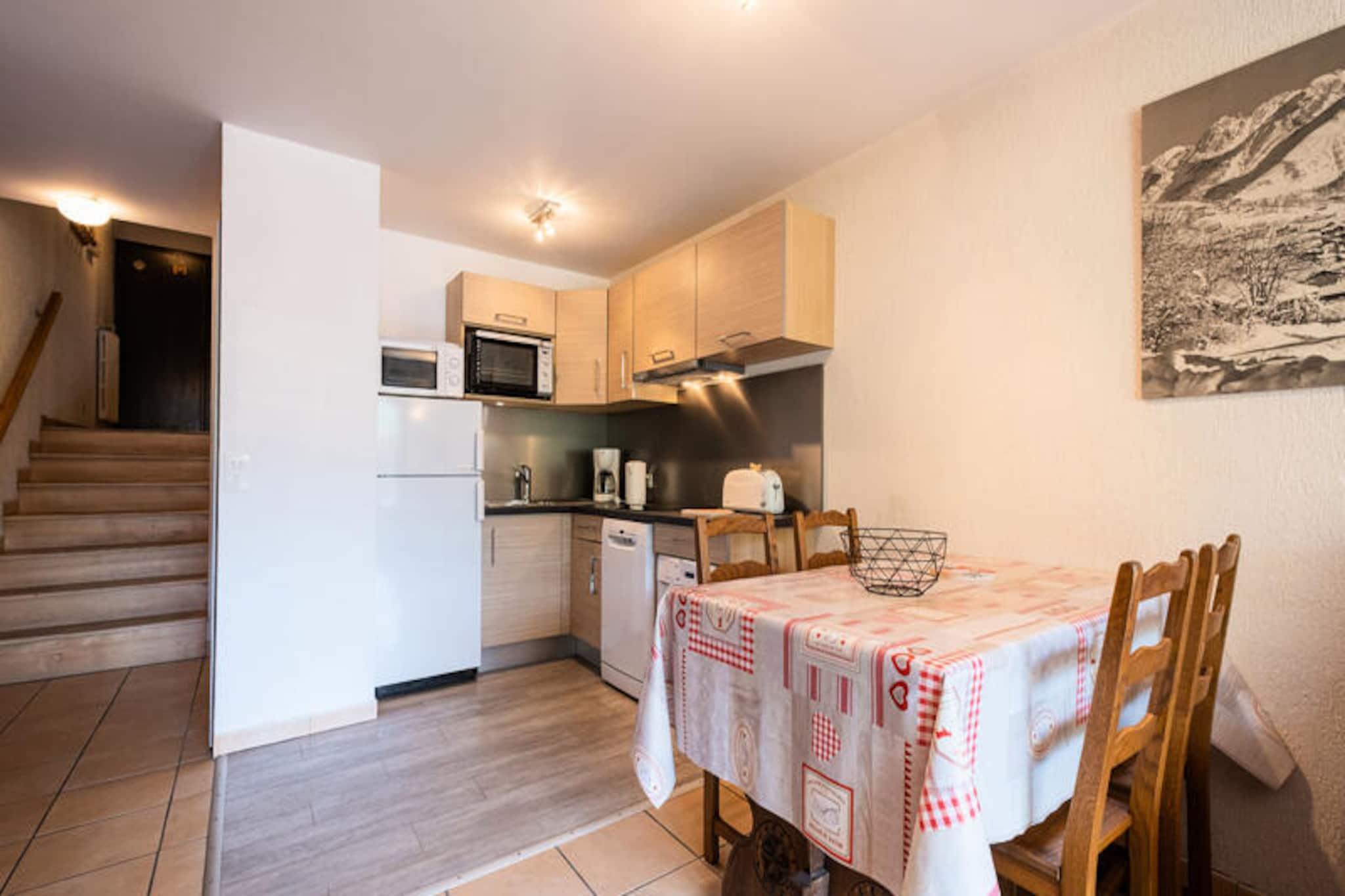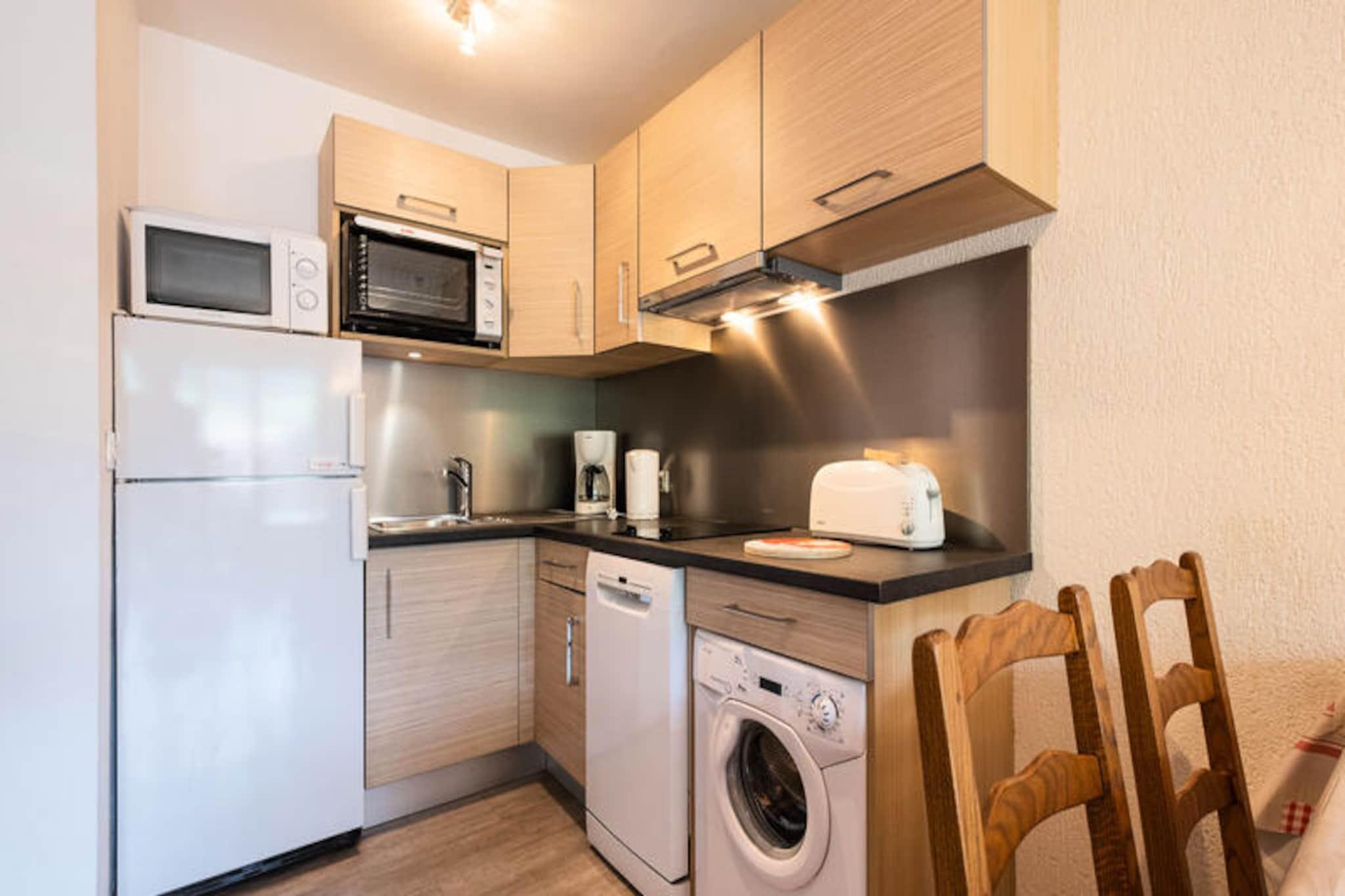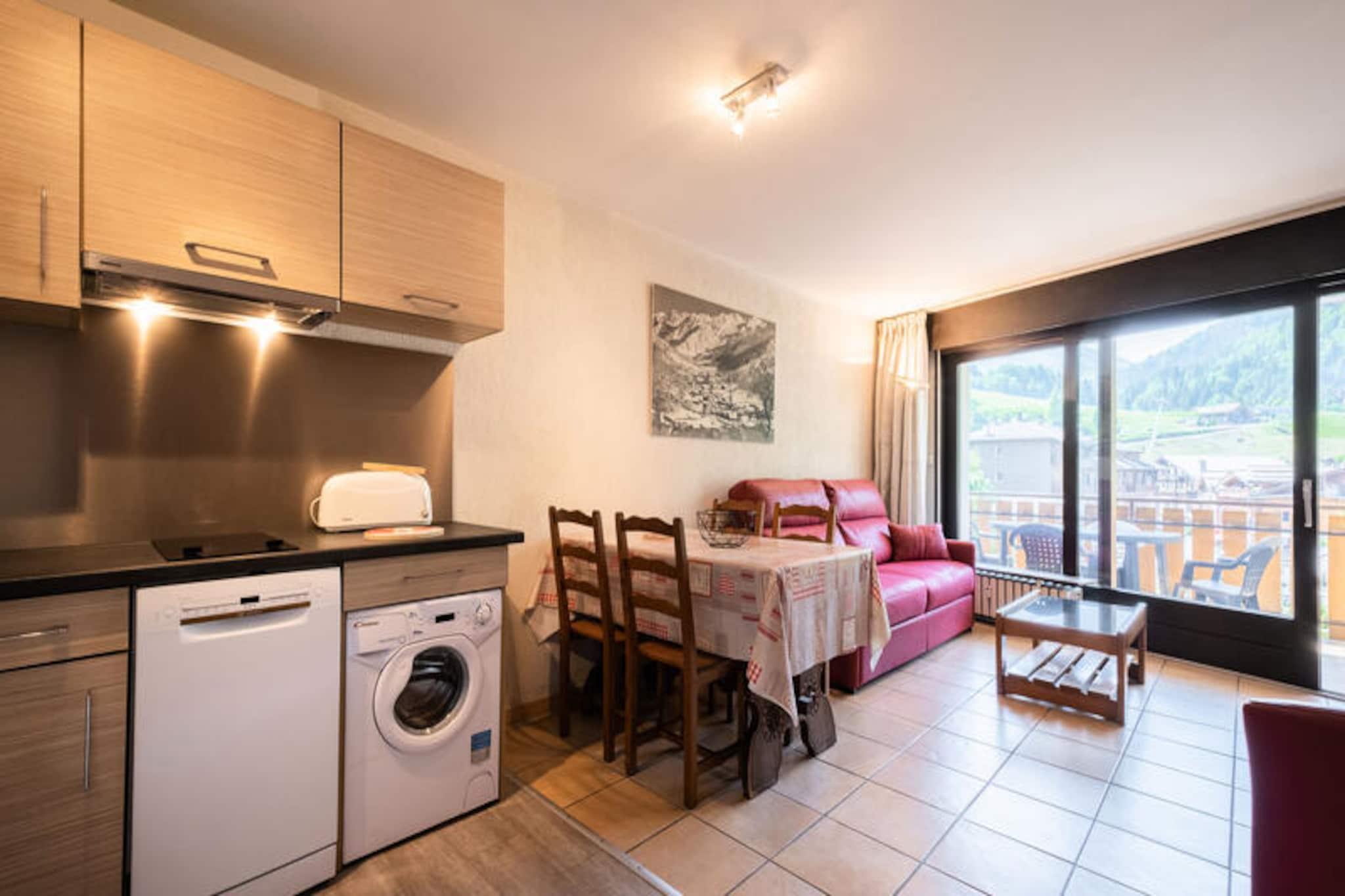 Denne ejendom, bekvemt beliggende ved indgangen til landsbyen, tilbyder et hyggeligt og funktionelt rum for op til 4 rejsende. Lejligheden har et soveværelse med dobbeltseng, og stuen indeholder en Rapido dobbelt sovesofa, perfekt til ekstra gæster. Lejligheden har en sydvendt balkon med udsigt over resortet og bjergene, så gæsterne kan slappe af og nyde landskabet. Køkkenet er fuldt udstyret med køleskab, ovn, mikroovn, opvaskemaskine og vaskemaskine for ekstra bekvemmelighed. Yderligere faciliteter omfatter et fladskærms-tv og et skiskab. Kæledyr er ikke tilladt, og lejligheden er ikke-ryger. Der er en garageplads til parkering, hvilket sikrer nem adgang. Ejendommen er ideelt beliggende kun 200 meter fra Champ Giguet-skiundervisningens afgangssted og Beauregard-svævebanerne, hvilket gør det til en perfekt base for vinteraktiviteter. Skøjtebanen og fritidscentret er også inden for gåafstand, hvilket giver rigelige muligheder for underholdning hele året rundt. I sommermånederne kan gæsterne nyde det nærliggende fritidscenter. Ejendommen ligger kun 350 meter fra det nærmeste shuttlestop, hvilket giver nem adgang til andre dele af resortet. Med sin centrale beliggenhed kan gæster nemt udforske landsbyen, med butikker i nærheden, hvilket sikrer bekvemmelighed og komfort under deres ophold. Lejligheden tilbyder alle de nødvendige faciliteter for et behageligt ophold. Tekøkkenet er udstyret med køleskab, ovn og Nespresso kaffemaskine, mens badeværelset har badekar, håndvask og toilet. Centralvarme sikrer, at lejligheden forbliver varm under hele opholdet. Gæsterne kan nyde den naturskønne udsigt fra stuen og balkonen, hvilket gør rummet indbydende og afslappende. Lejligheden er beliggende i en bolig bygget i 1976, der tilbyder et indbydende og velholdt miljø for en fredelig ferie.