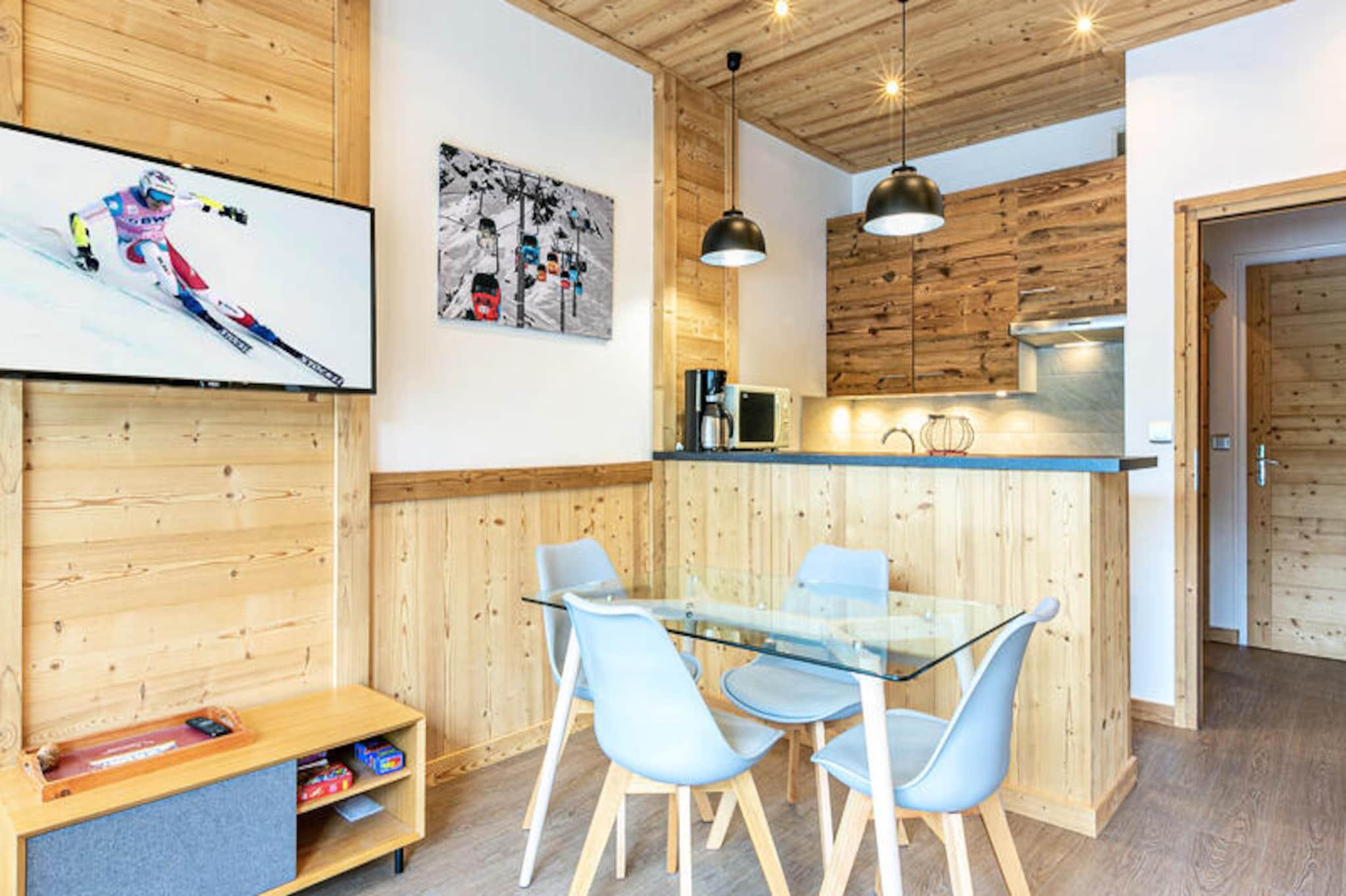 Denne centralt beliggende studiolejlighed i "La Perrière" kan rumme op til 4 personer. Det 36 m² store rum har en stue med en sovesofa for 2 personer, store karnapper, der åbner ud til en balkon med udsigt over bjergene, og et kabineområde med 2 køjesenge (øverste køje er forbudt for børn under 6 år). Det åbne køkken er veludstyret med 3 keramiske kogeplader, mikroovn, ovn, opvaskemaskine og køleskab. Et brusebad med bruseniche, vaskemaskine-tørretumbler og separat toilet fuldender layoutet. Centralvarme og parketgulve sikrer komfort, mens et skiskab og offentlig parkering er tilgængelige for nemheds skyld. Kæledyr er ikke tilladt, og der kræves et depositum. Lejlighedens beliggenhed er ideel, kun en kort gåtur fra pisterne og lokale butikker, og tæt på ESF Skolens mødested i februar. Det er også i nærheden af ??Aquatic Center, som vil være lukket for renovering i sommer- og vintersæsonerne 2024-2025. Busstationen ligger 1,4 km derfra, mens SNCF-togstationen ligger 33 km derfra. Gæster kan nyde bekvemmeligheden ved en central landsbyplacering, der tilbyder både adgang til faciliteter og en fantastisk udsigt over bjergene. Yderligere tjenester omfatter muligheden for at leje lagner og linned. Wi-Fi er ikke inkluderet, men en lejeboks er tilgængelig. Lejligheden er perfekt for dem, der ønsker at nyde en fredelig, veludstyret base i hjertet af landsbyen, samtidig med at den er tæt på alle vigtige attraktioner. Der kræves et depositum ved ankomsten, hvilket sikrer et glat og behageligt ophold.