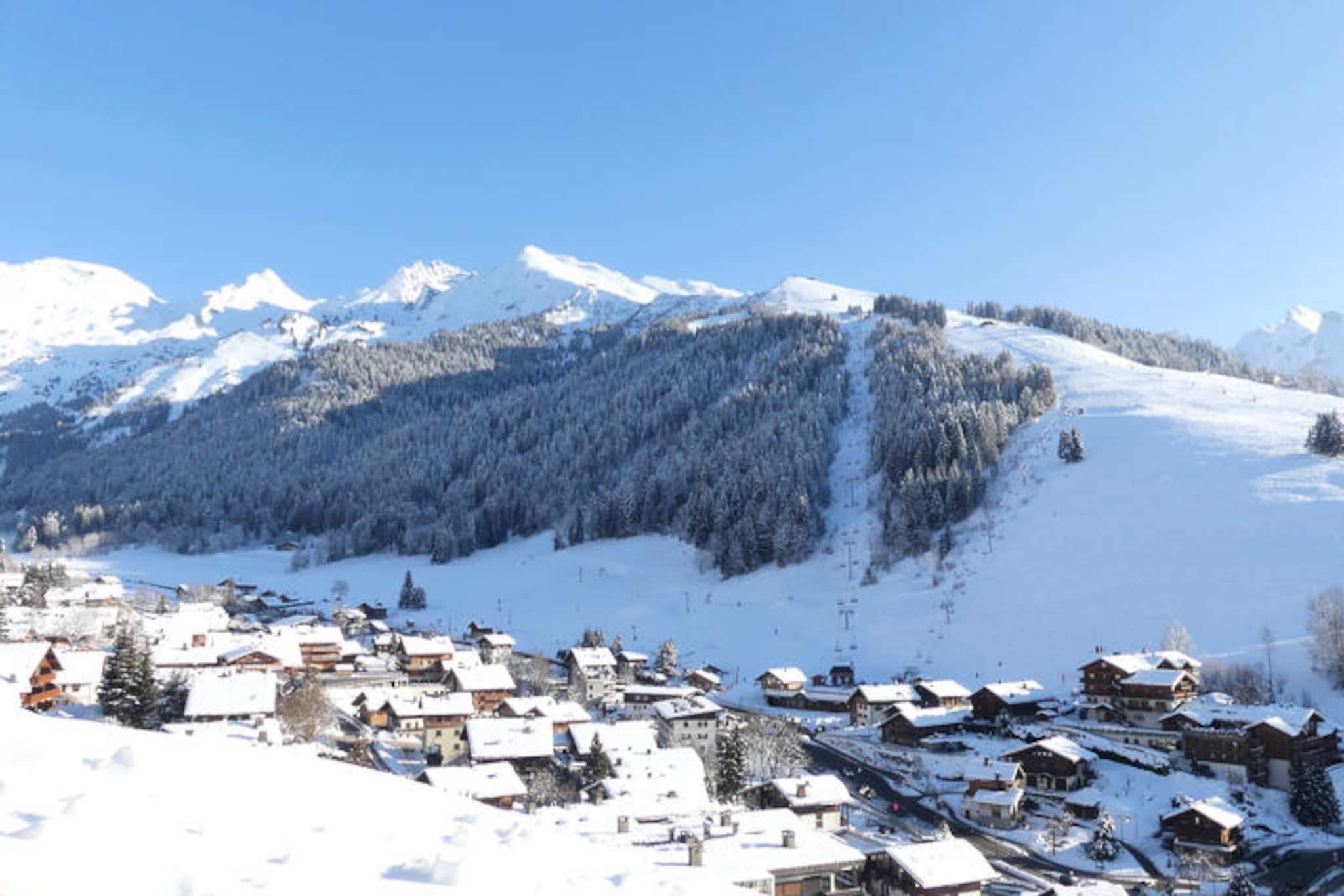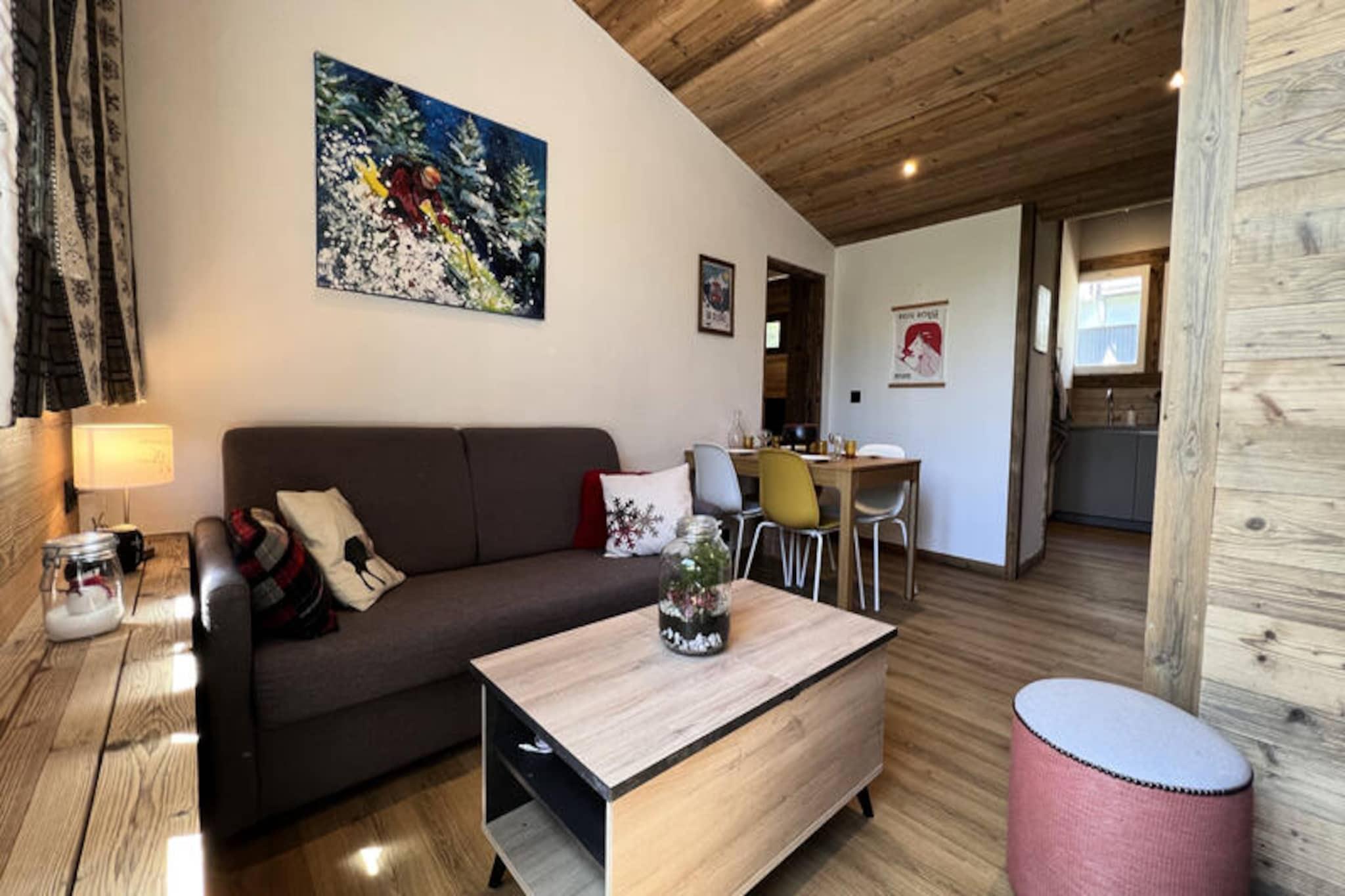 Denne charmerende duplexlejlighed ligger hævet over den maleriske landsby La Clusaz og tilbyder et dejligt alpint tilflugtssted for op til syv gæster. Med en betagende udsigt over bjergene, skiløjperne og den maleriske landsby nedenfor føles hvert øjeblik her som et postkort, der kommer til live. Boligen, bygget i 1971, er perfekt beliggende kun 500 meter fra det pulserende centrum af La Clusaz, 800 meter fra Bossonnet ESF skiskoles mødesteder og kun 50 meter fra shuttlebusservice og vandland, hvilket sikrer bekvemmelighed og nem adgang til lokale attraktioner. \n\nIndvendigt er lejligheden omhyggeligt designet til at kombinere komfort og funktionalitet. Stueetagen har et hyggeligt soveværelse med dobbeltseng, garderobe og en nordvendt balkon samt et eget badeværelse med bruser, håndklædetørrer og moderne bekvemmeligheder som vaskemaskine og tørretumbler. Ovenpå indbyder stuen til afslapning med sovesofa, tv, dvd-afspiller og Bluetooth-højttaler, mens den sydvendte balkon tilbyder et roligt sted at nyde udsigten over bjergene. Det fuldt udstyrede køkken indeholder alt, hvad du behøver til kulinariske eventyr, fra induktionskogeplader til raclette-sæt. Øverste etage rummer også et andet badeværelse og et soveværelse med køjesenge og en udtræksseng, perfekt til familier eller grupper. \n\nLa Clusaz er i sig selv et paradis for friluftsentusiaster og tilbyder skiløb i verdensklasse om vinteren og livlige sommeraktiviteter såsom vandreture, cykling og paragliding. Det nærliggende vandland og shuttlebus gør det nemt at udforske området, mens landsbyens centrum fyldes med butikker, restauranter og lokal charme. Uanset om du søger spændende eventyr eller rolige øjeblikke, er denne lejlighed den ideelle base for en uforglemmelig alpin flugt.