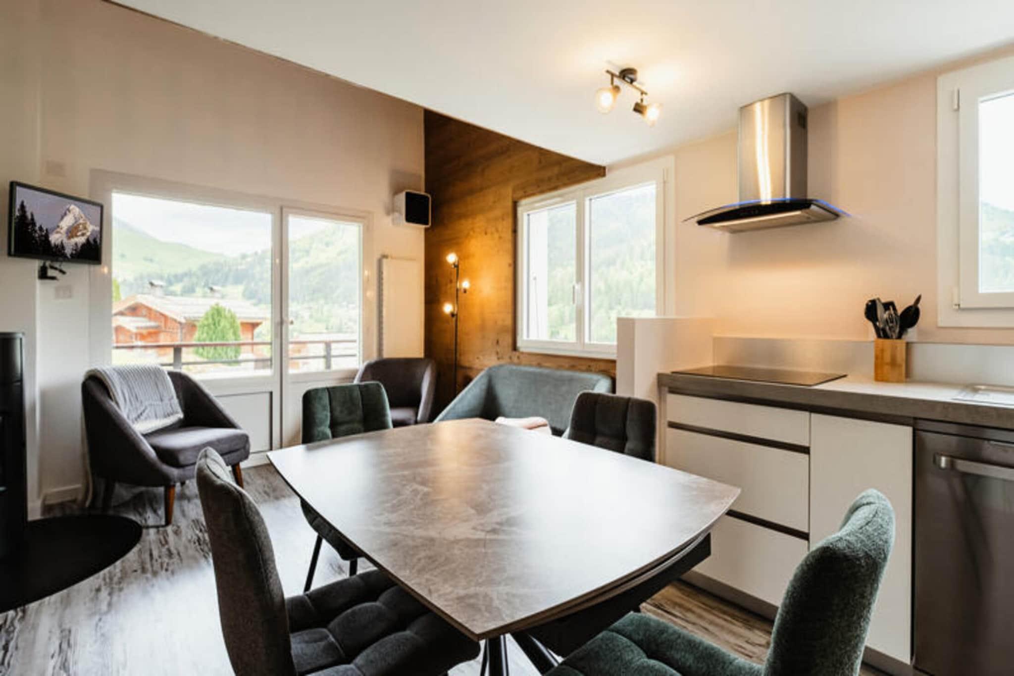 Denne ejendom, en smukt renoveret og hyggelig lejlighed, er designet til at rumme op til 6 personer. Det har 3 værelser og en mezzanin, hvilket giver rigelig plads til gæsterne. Stuen er indrettet med en komfortabel sofa og et fladskærms-tv, mens mezzaninen omfatter en Rapido-sovesofa, der tilbyder ekstra sovepladser. Lejligheden byder desuden på en sydvestlig hjørnealtan med naturskøn udsigt over bjergene og naboboliger. For nemheds skyld leveres sengetøj, dynebetræk, lagner og pudebetræk, og ejendommen er røgfri og kæledyrsfri. Denne bolig ligger i den fredfyldte Aravis-dal, kun 600 meter fra Ruade-skiløjperne og 1,8 km fra landsbyens centrum. Bussen stopper kun 160 meter væk, hvilket gør det nemt at komme til det omkringliggende område. Gæsterne kan nyde en fantastisk udsigt over Etale-massivet fra lejligheden. Den nærmeste togstation, Annecy SNCF, ligger 35 km derfra, og La Clusaz-busstationen ligger 2,15 km fra ejendommen, som tilbyder praktiske transportmuligheder for rejsende. Lejligheden er udstyret med et velindrettet køkken med køleskab med fryser, ovn, induktionskomfur, mikroovn og opvaskemaskine, ideel til at tilberede måltider. Ejendommen omfatter en garage til parkering og et skiskab, hvor gæsterne kan opbevare deres udstyr. Yderligere faciliteter såsom vaskemaskine, håndklædetørrer og centralvarme med radiatorer sikrer et behageligt ophold. Lejligheden ligger på første sal og er tilgængelig via en udvendig trappe.