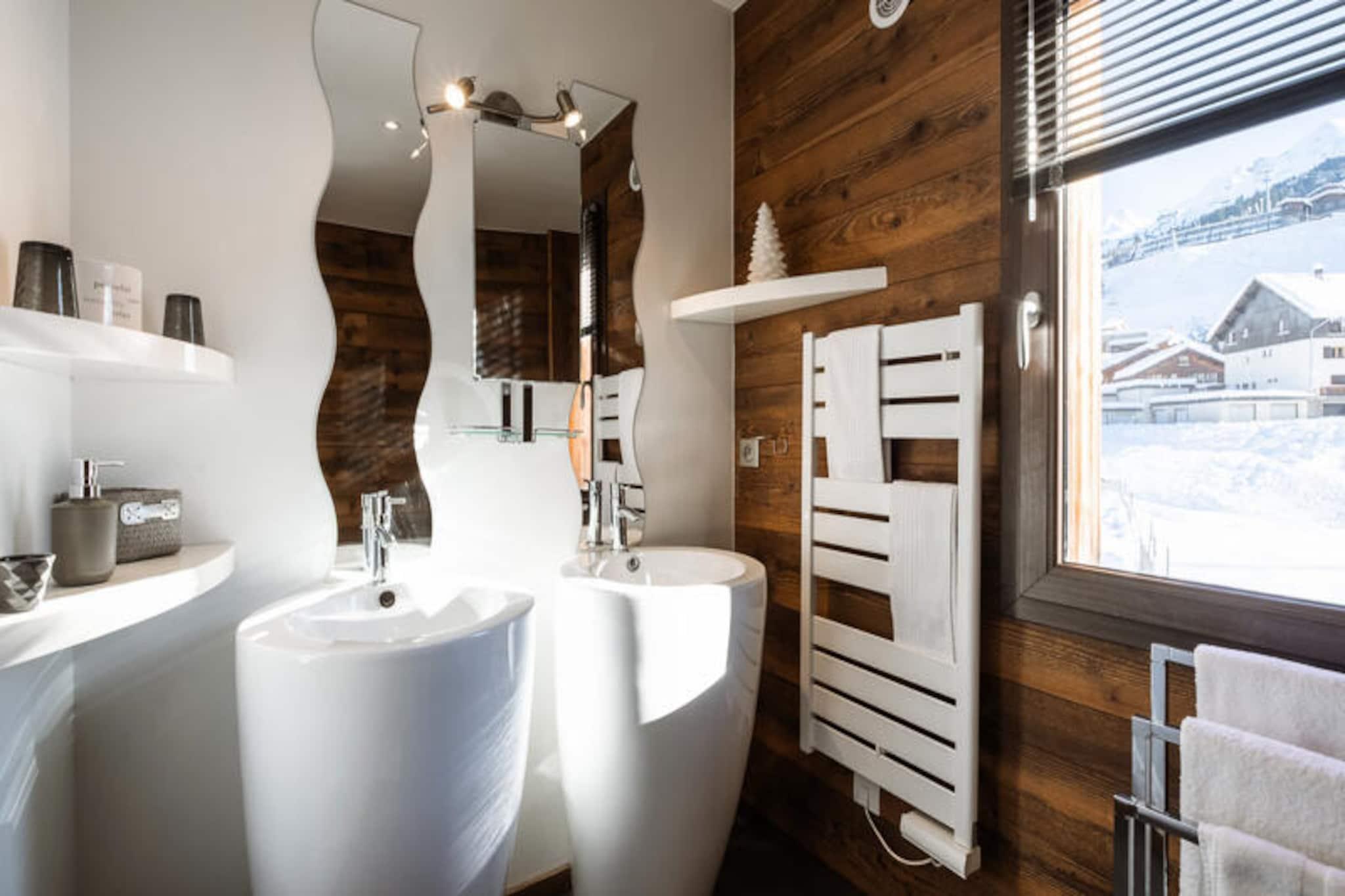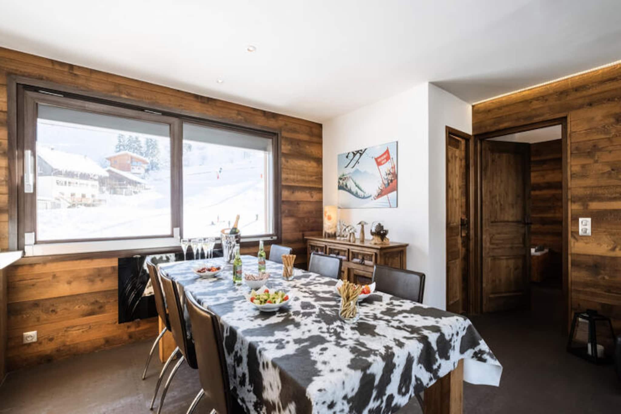 Ejendommen giver sammen med dens rummelige layout en luksuriøs og behagelig oplevelse for op til 8 gæster. Denne 118 m² duplex-lejlighed har 3 store soveværelser, hver med eget badeværelse, som tilbyder både privatliv og bekvemmelighed. Stuen er udstyret med et hyggeligt opholdsområde, et fladskærms-tv med Chromecast og en vestvendt balkon, så gæsterne kan nyde smuk udsigt over bjergene. Til lejligheden hører også en privat elevator, der giver direkte adgang til stue og soveværelser. Selvom kæledyr ikke er tilladt, sikrer ejendommen maksimal komfort med de nødvendige faciliteter, herunder Wi-Fi og en barneseng. Lejligheden er ikke-ryger og tilbyder yderligere tjenester såsom sengetøj, toilet linned og slutrengøring, alt inkluderet i lejen. Beliggende i hjertet af landsbyen, er lejligheden ideelt beliggende kun 280 meter fra shuttle-stoppestedet og få skridt væk fra forskellige attraktioner. Gæsterne kan nyde skiløjperne, skøjtebanen og afgangssteder for skilektioner på Champ Giguet, hvilket gør det til et ideelt sted for vintersportsentusiaster. Ejendommen ligger også tæt på de to vigtigste svævebaner, Patinoire og Beauregard, som giver nem adgang til de omkringliggende bjerge. For at slappe af kan gæsterne besøge spaen på et 5-stjernet hotel i nærheden eller nyde et måltid på dens gourmetrestaurant. Lejlighedens centrale beliggenhed giver gæsterne mulighed for at opleve det bedste fra landsbyen, med butikker og restauranter også inden for gåafstand. De nærmeste transportforbindelser er Annecy SNCF togstation (32 km væk) og La Clusaz busstation (280 meter). Lejligheden har et fuldt udstyret åbent køkken med moderne apparater, herunder et amerikansk køleskab, ovn, induktionskomfur, mikroovn, opvaskemaskine, Nespresso kaffemaskine og en vinkælder. For ekstra bekvemmelighed er der et vaskerum med vaskemaskine og tørretumbler samt en skistøvletørrer. Gæsterne har også adgang til et skistativ og to parkeringsadgangskort til vintersæsonen. Lejlighedens design sikrer komfort og stil, med store vinduer med en fantastisk udsigt over pisterne og Aravis-bjergkæden. Yderligere funktioner omfatter elvarme, et skistativ og nem adgang til nærliggende restauranter og butikker. Den private elevator forbedrer indretningens bekvemmelighed yderligere, hvilket sikrer problemfri adgang til lejlighedens forskellige niveauer.