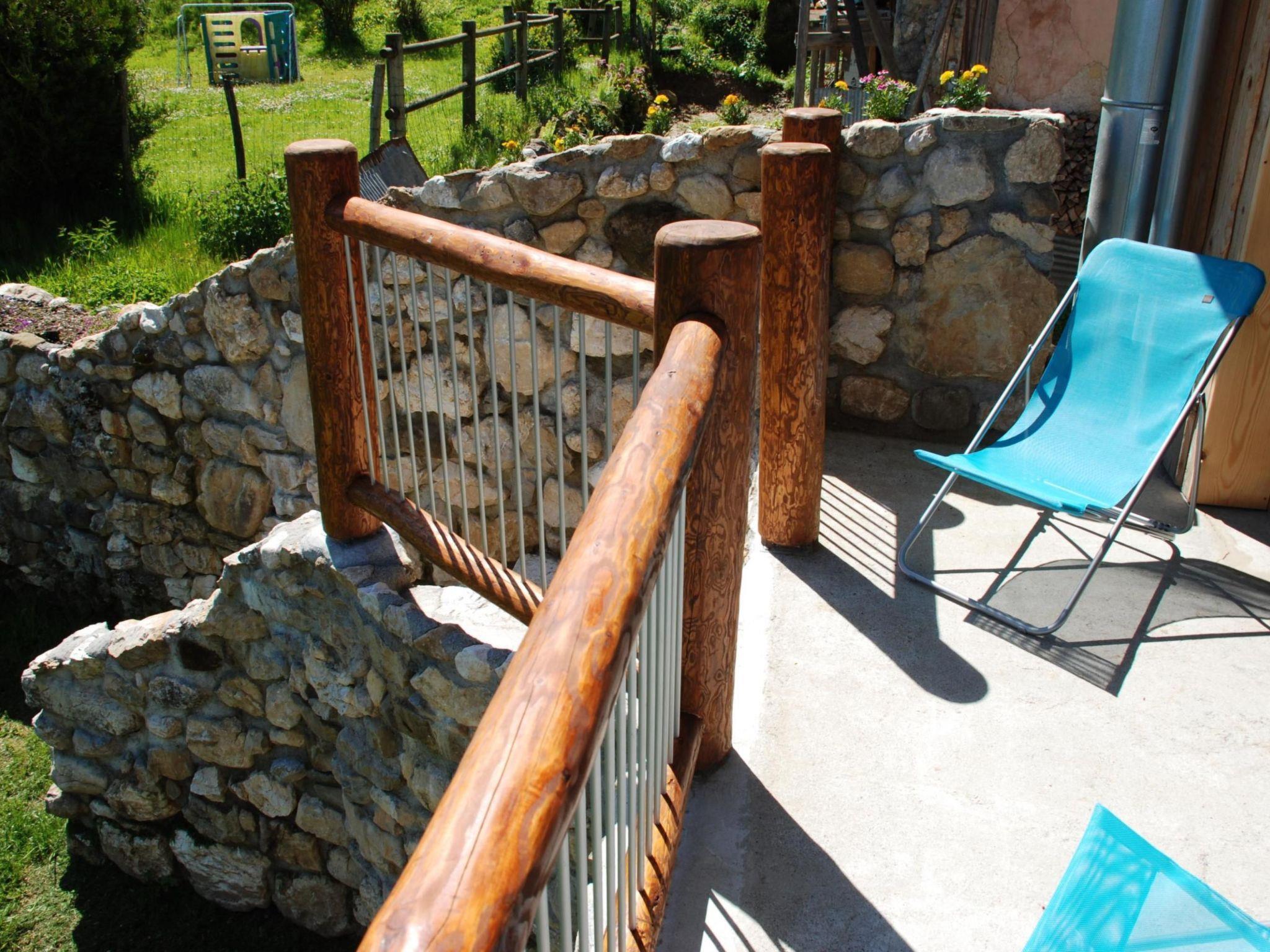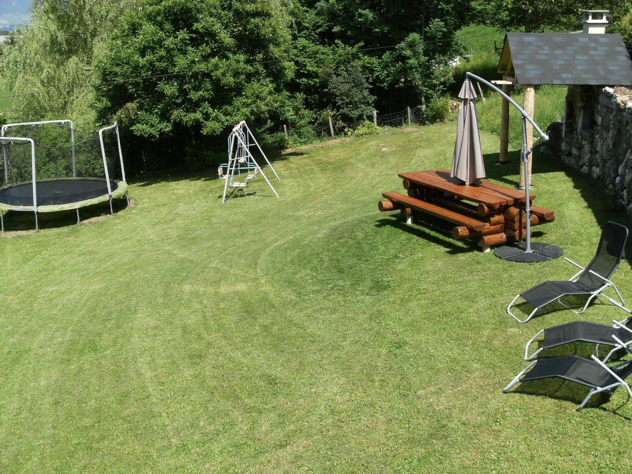 There is a balcony on the kitchen side. The terrace, with two garden chairs, leads down a few steps to the garden. Your children will be delighted: there's a large trampoline, a 60-metre-long zip line, a swing and an above-ground swimming pool (5.50 m in diameter and 1.20 m deep). Meanwhile, adults can relax on three sun loungers and admire the mountain scenery. There is also a seating area with a large wooden table and two 2.5-metre benches, as well as a parasol and a brick barbecue.