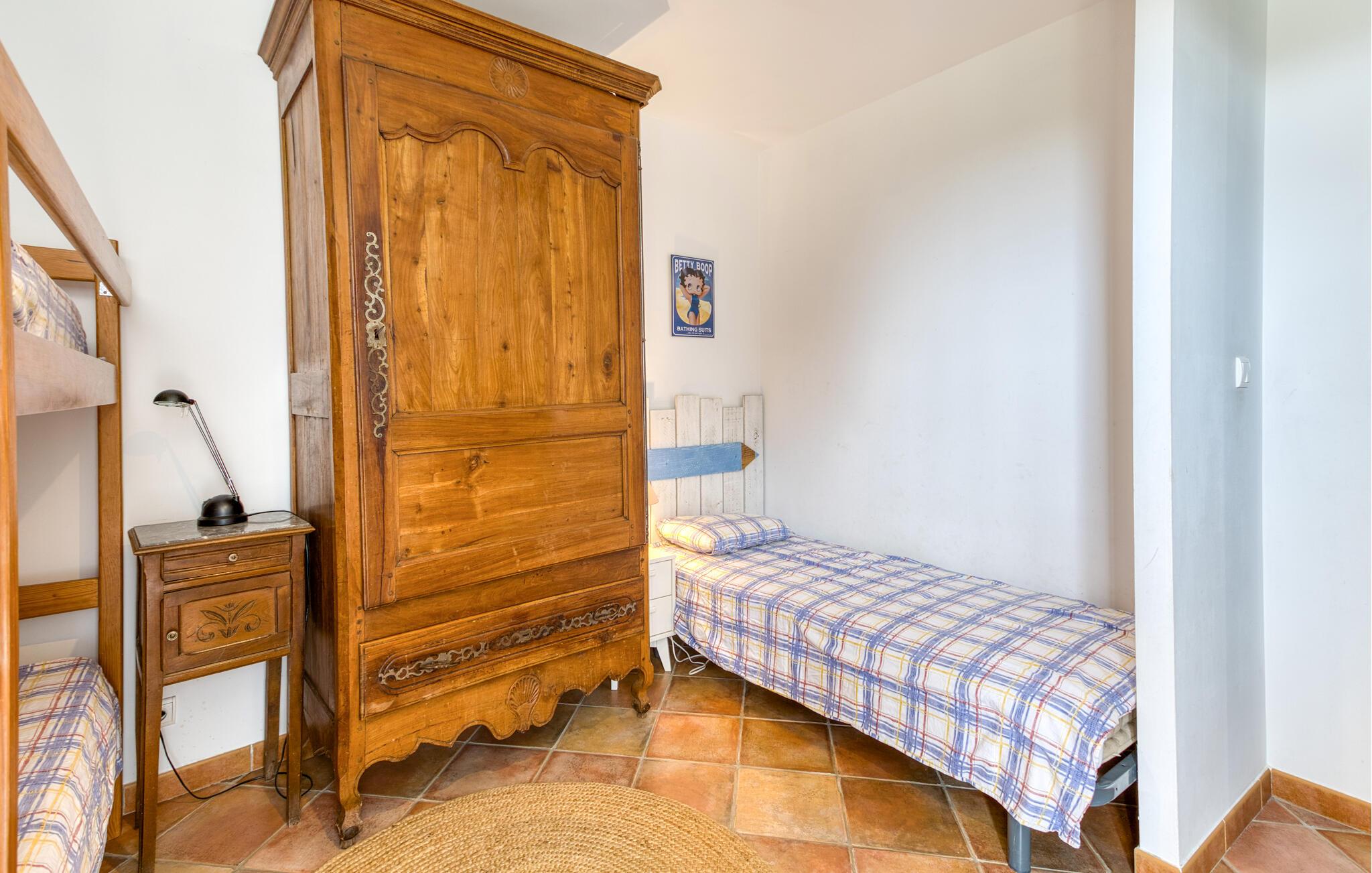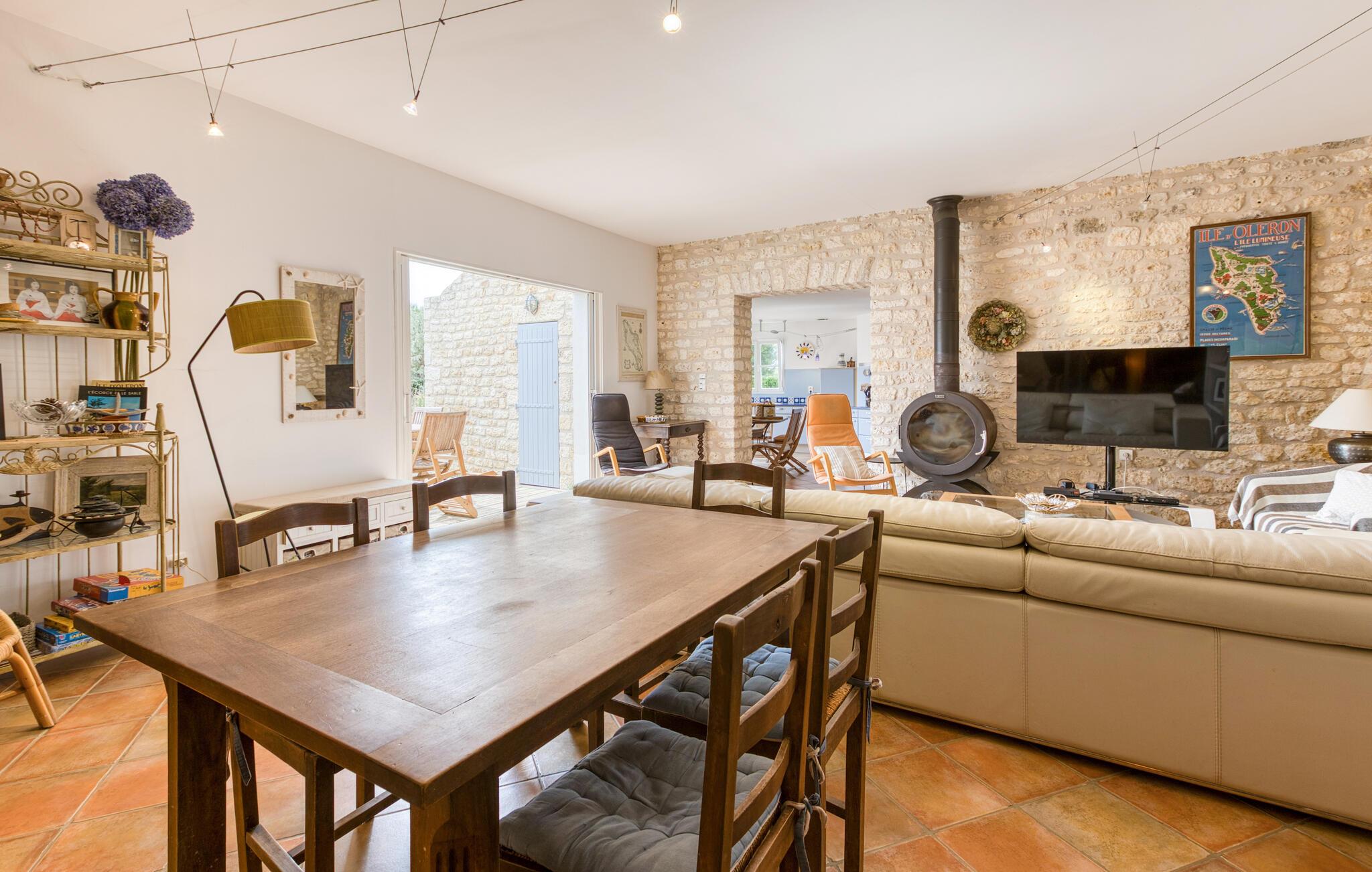 Dette charmerende feriested ligger praktisk talt lige ved sandstranden og har et rummeligt og flot indrettet interiør. Velholdte naturstensvægge, udvalgte møbler og gennemtænkt belysning skaber en hyggelig atmosfære. Glæd jer til hyggelige madlavningsaftener og afslappede måltider, tænd pejsen på kølige dage, og afslut en lang dag i den friske havluft med en film eller en spilleaften i den hyggelige stue.