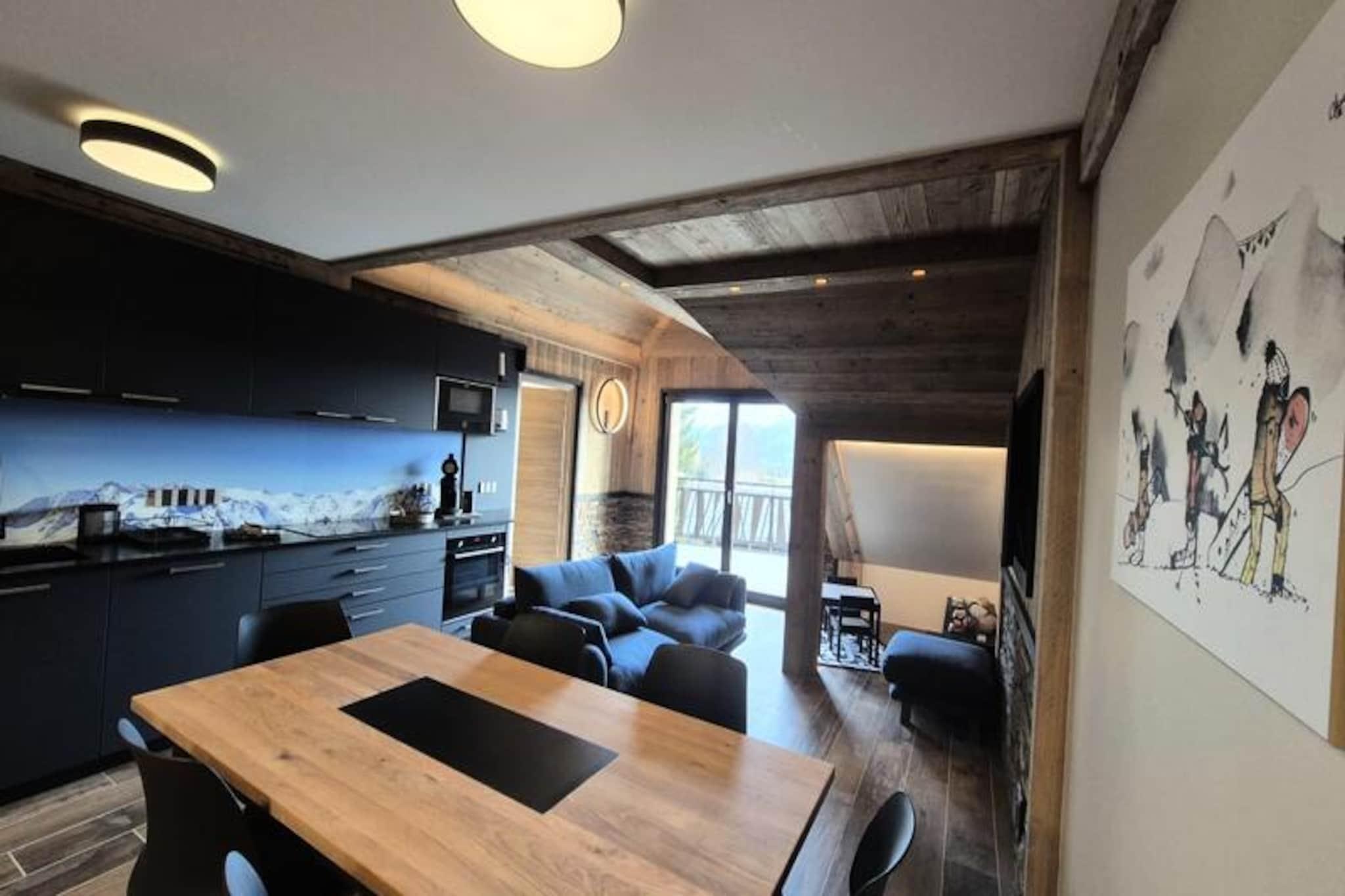 Forestil dig at vågne op til den friske alpeluft og træde ud på din private terrasse for at nyde panoramaudsigten over bjergene. Denne luksuriøse lejlighed, der blander moderne elegance med alpin charme, er din indgang til en uforglemmelig bjergferie. Perfekt designet til afslapning og eventyr, tilbyder den en varm og indbydende atmosfære, der føles som hjemme fra det øjeblik, du ankommer. Den rummelige opholdsstue er et oase af komfort med en blød sofa og et fladskærms-tv, ideel til hyggelige aftener efter en dag på pisterne. Det åbne køkken, fuldt udstyret med ovn, kogeplader, opvaskemaskine, kaffemaskine og mere, inviterer dig til at tilberede solide måltider til deling omkring det store spisebord. Lejligheden kan prale af tre gennemtænkte soveværelser: to med kingsize-senge for ultimativ komfort og et charmerende køjesengsværelse, perfekt til børn eller venner. Store karnapvinduer oversvømmer rummet med naturligt lys og fører til en stor terrasse, hvor du kan sole dig eller nyde afterskiing-øjeblikke med dine kære. Skientusiaster vil svælge i ski-in/ski-out-bekvemmeligheden med direkte adgang til pisterne lige fra boligen. Sikker, overdækket parkering og et privat skirum bidrager til dit opholds bekvemmelighed. I nærheden finder du et pulserende udvalg af restauranter, butikker og afterski-aktiviteter, der sikrer underholdning for alle aldre. Om sommeren forvandles bjergene til et paradis for vandrere og naturelskere med stier, der fører til betagende udsigter. Uanset om du søger spændende skieventyr eller rolig alpin afslapning, tilbyder denne lejlighed den perfekte blanding af luksus og beliggenhed. Lad bjergenes magi skabe minder, du vil værdsætte for evigt.