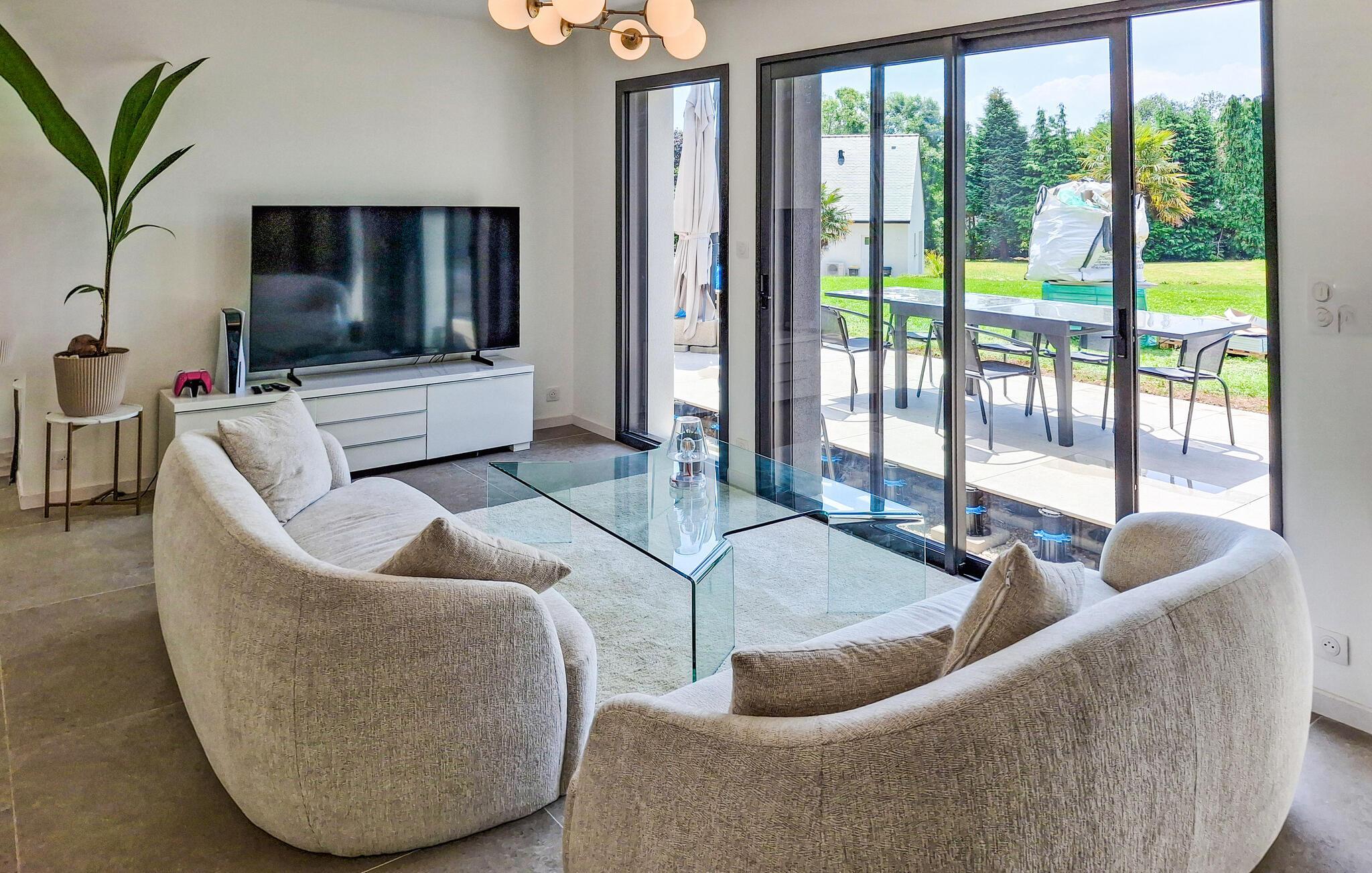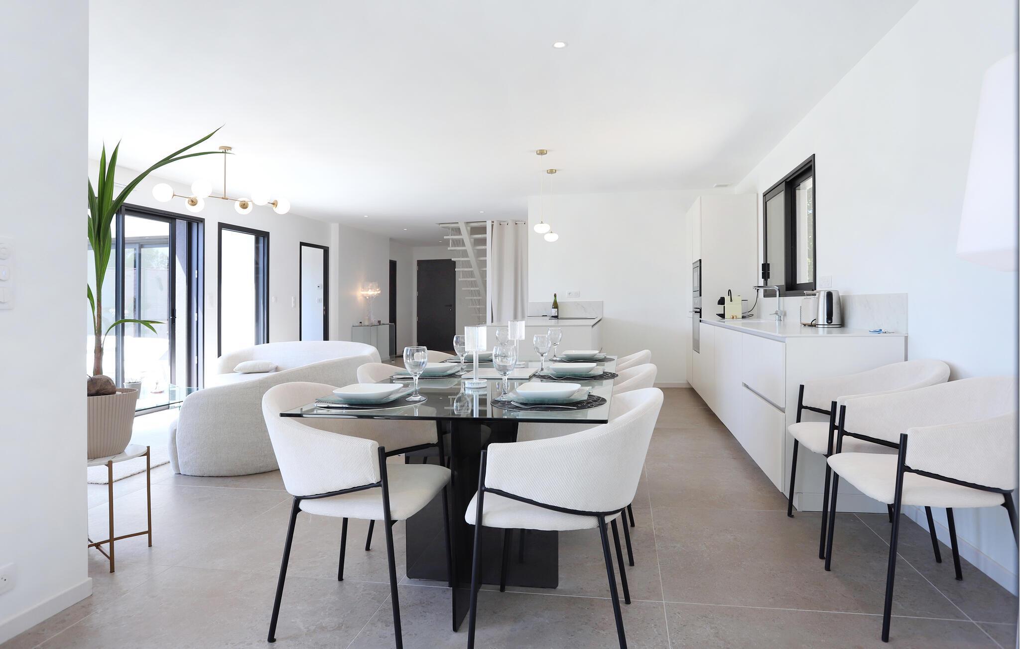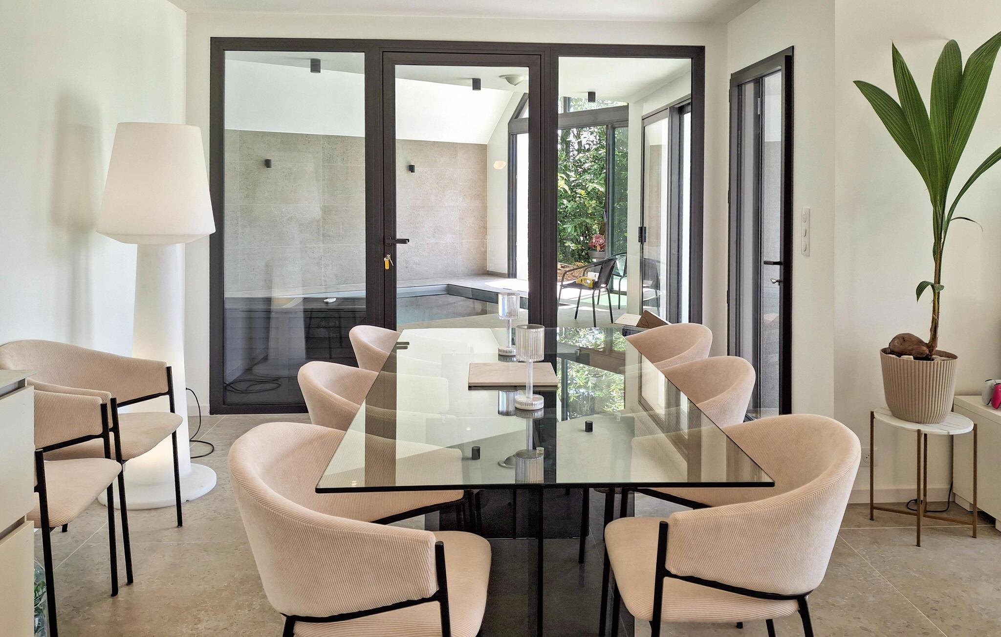 Dette moderne feriehus ligger i en smuk, stor have, ikke langt fra den fine, hvide sandstrand i Kerleven. Det lyse og rummelige interiør forkæler jer med stilfulde møbler, hvor I kan nyde harmoniske stunder med venner eller familie. Glæd jer til hyggelige madlavningsaftener og lange måltider, spil på PlayStation eller forkæl jer selv med afslappende øjeblikke i den opvarmede indendørs pool.