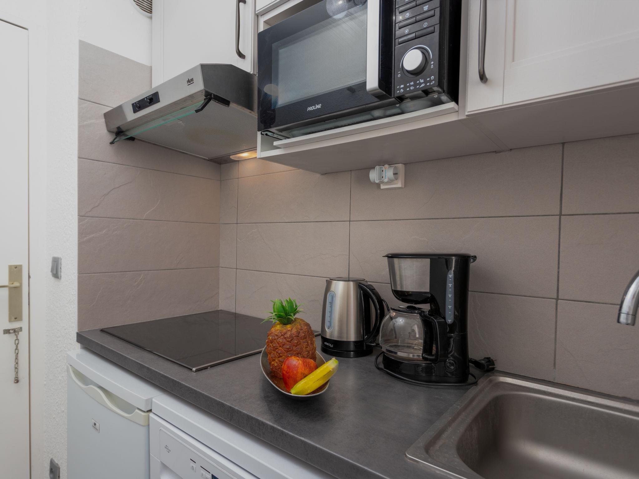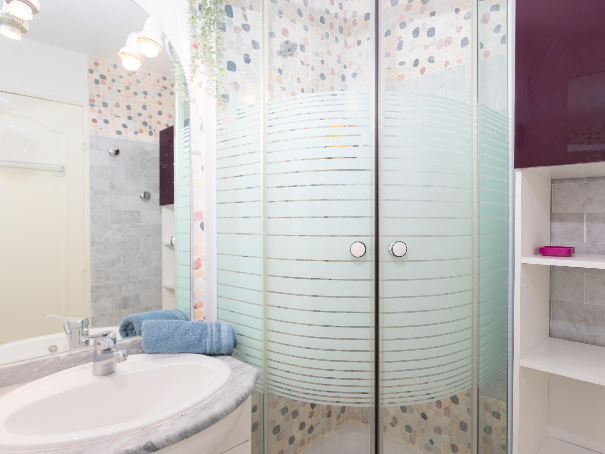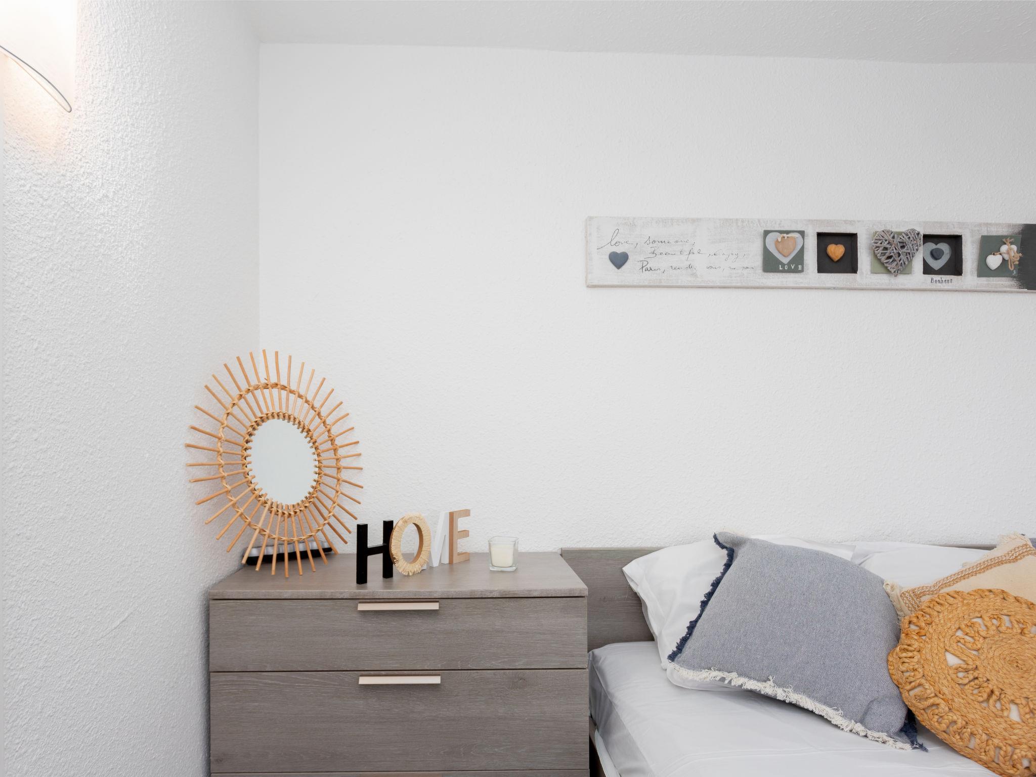 3-room apartment 50 m2 on 4th floor, south-east facing position. Fully renovated, comfortable and modern furnishings: living/dining room with 1 double sofabed (140 cm), TV (flat screen). 1 room with 1 french bed (160 cm). 1 room with 1 french bed (140 cm). Small kitchen (dishwasher, 4 induction hot plates, freezer, combination microwave). Shower/WC. Air-conditioning. 2 small terraces, south-east facing position. Terrace furniture. Very beautiful view of the sea and the swimming pool. Facilities: washing machine. Internet (WiFi, extra). Parking (roofed). Please note: smoke alarm.