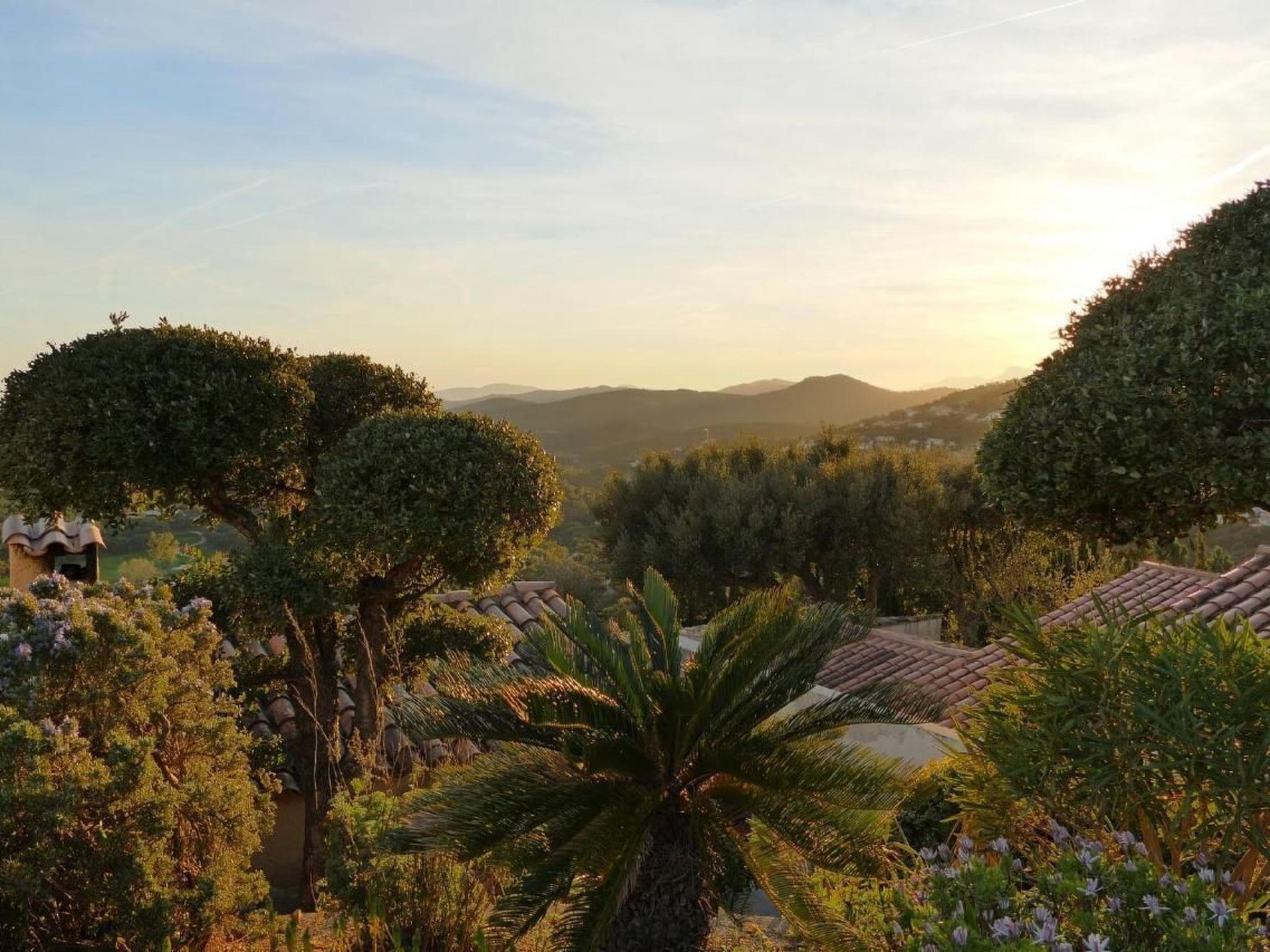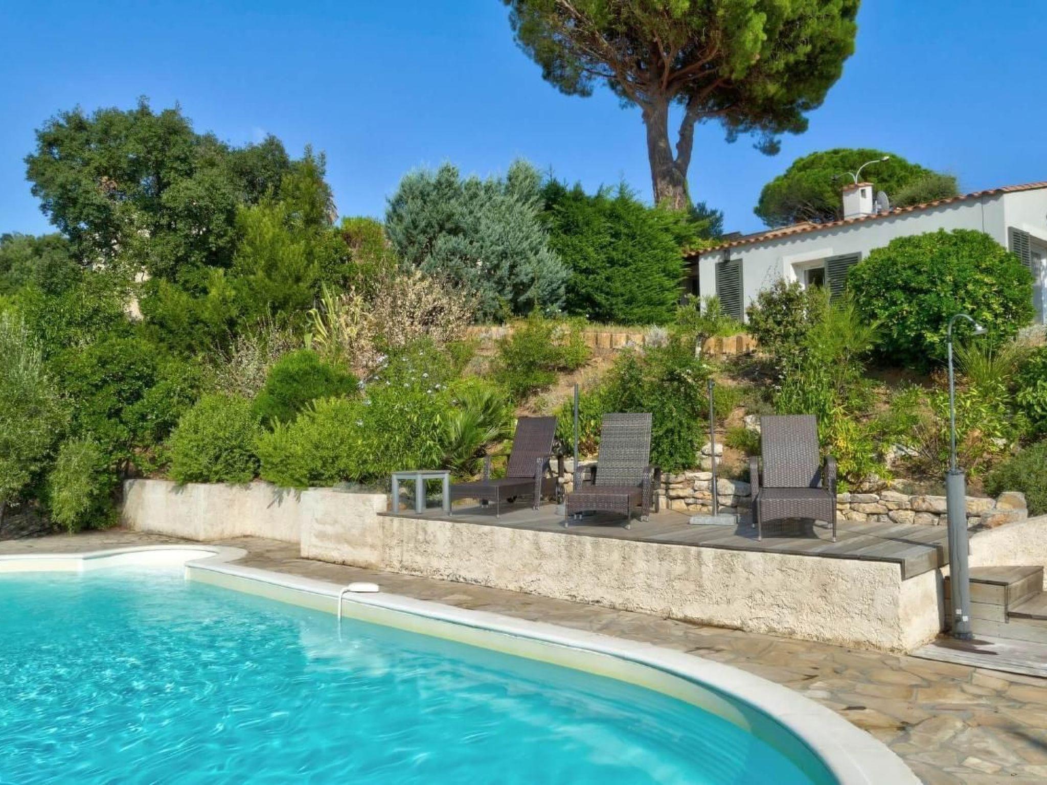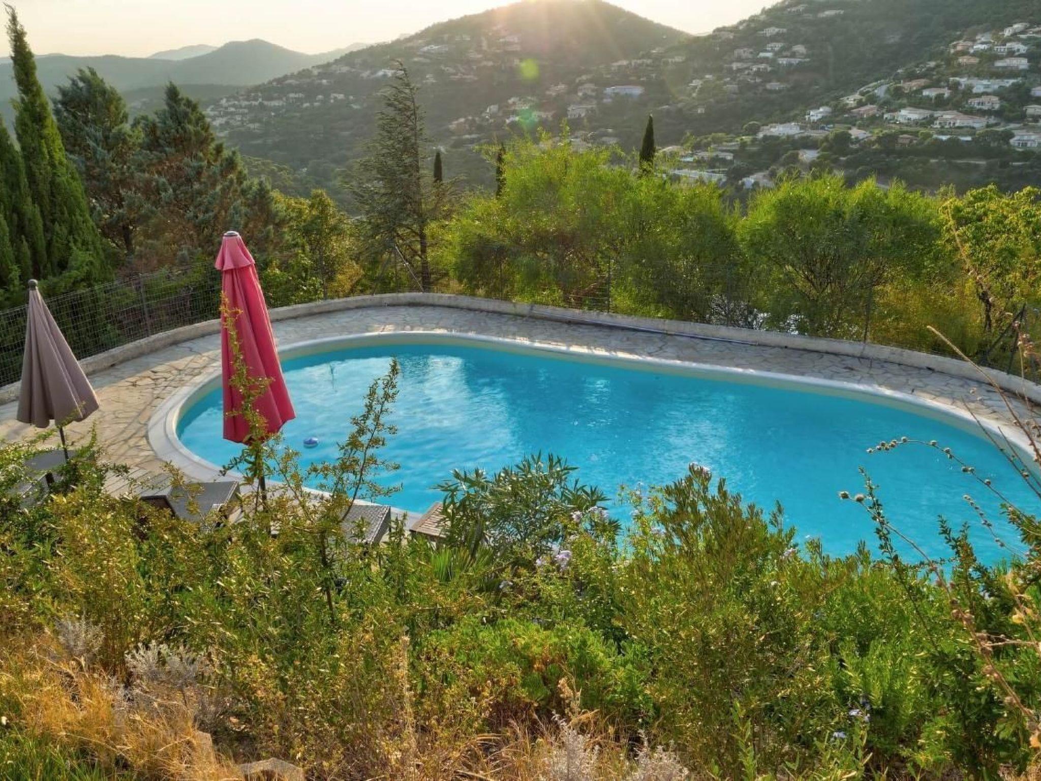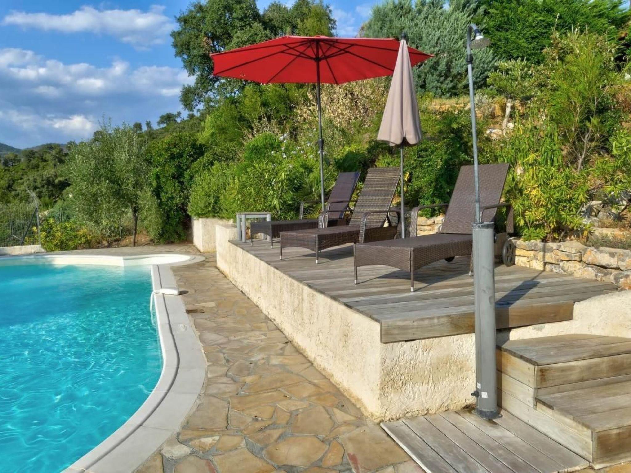 The renovated villa in Valcros (near La Londe les Maures) is located in a quiet residential area on a hill in the foothills of the Massif des Maures. From the detached house and the terraces you can enjoy a fantastic panoramic view of the entire bay of Hyeres with the Giens peninsula and the Ile de Porquerolles. The garden is shaded by two cork oaks and a patio cover, but also offers plenty of sunny spots depending on your taste and the time of year. The 12 x 6 metre pool is located in a slightly lower part of the garden. The house and garden are south-west facing, so you will always find a suitable spot with a good view. The house has an allocated parking space (further visitor parking spaces are also available), which is located at the end of a cul-de-sac. Access to the property is via several steps. The plots are arranged in such a way that you are undisturbed in the house and garden.