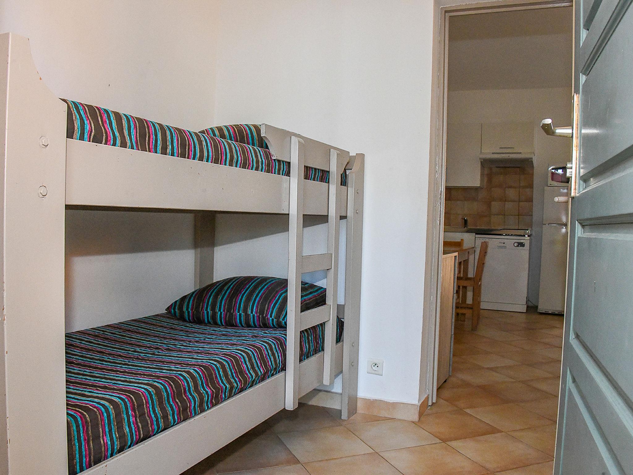 "Studio cabine Type B", 1-room terraced house 24 m2. Object suitable for 2 adults + 2 children. Practical furnishings: living/sleeping room with 1 double sofabed (140 cm, length 190 cm), 1 x 2 bunk beds (90 cm, length 190 cm), TV (flat screen). Exit to the terrace. Kitchenette (dishwasher, 2 ceramic glass hob hotplates, kettle, microwave, electric coffee machine). Bath/WC. Electric heating. Balcony, terrace. Terrace furniture. View of the garden. Facilities: Internet (WiFi). Please note: maximum 2 pets/ dogs allowed. Smoke alarm.