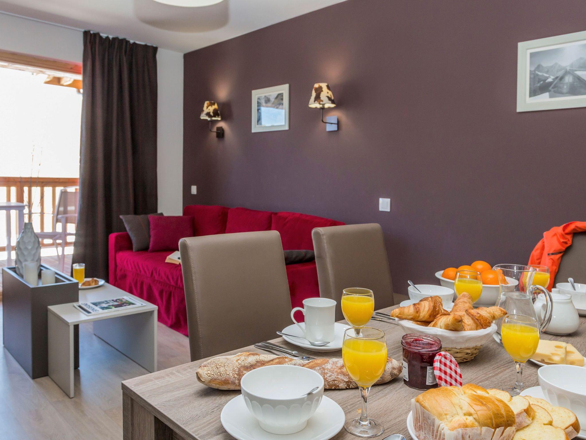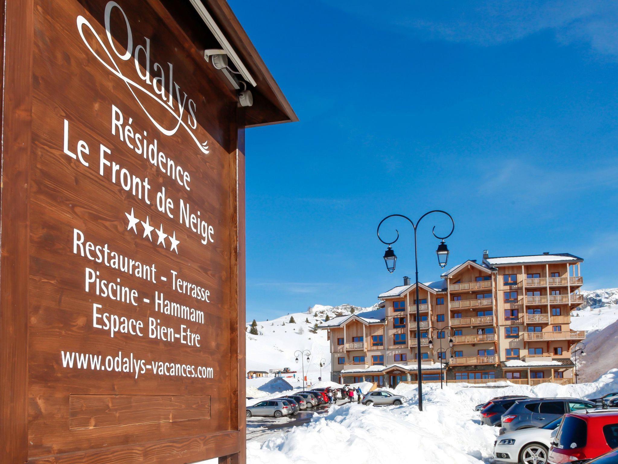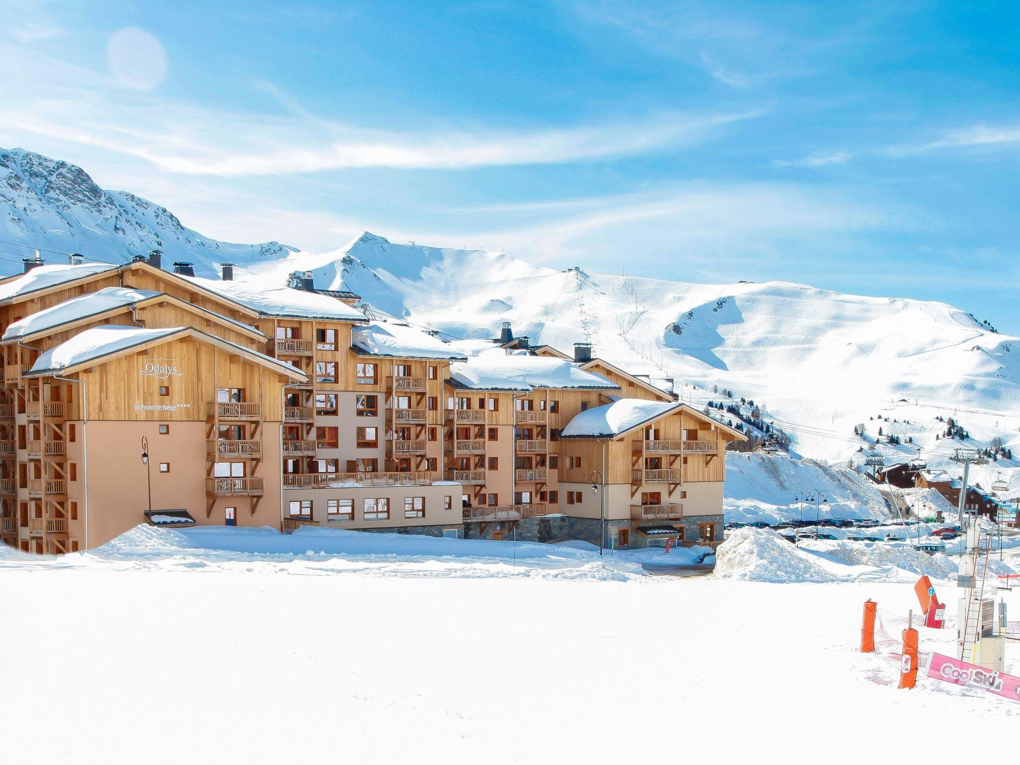 "Odalys Référence Front de Neige", 3-room apartment 54 m2. Modern and tasteful furnishings: living/sleeping room 20 m2 with 2 sleeping facilities, dining table, kitchen corner and satellite TV. Living/sleeping room with 1 pull-out bed (2 pers.), satellite TV. 1 room with 2 sleeping facilities. Small, open kitchen (dishwasher, 4 ceramic glass hob hotplates, toaster, kettle, microwave, electric coffee machine). Sep. WC, bath or shower, bath/WC or shower/WC. Electric heating. Balcony or terrace. Facilities: Internet (WiFi, free). Maximum 1 pet/ dog allowed.