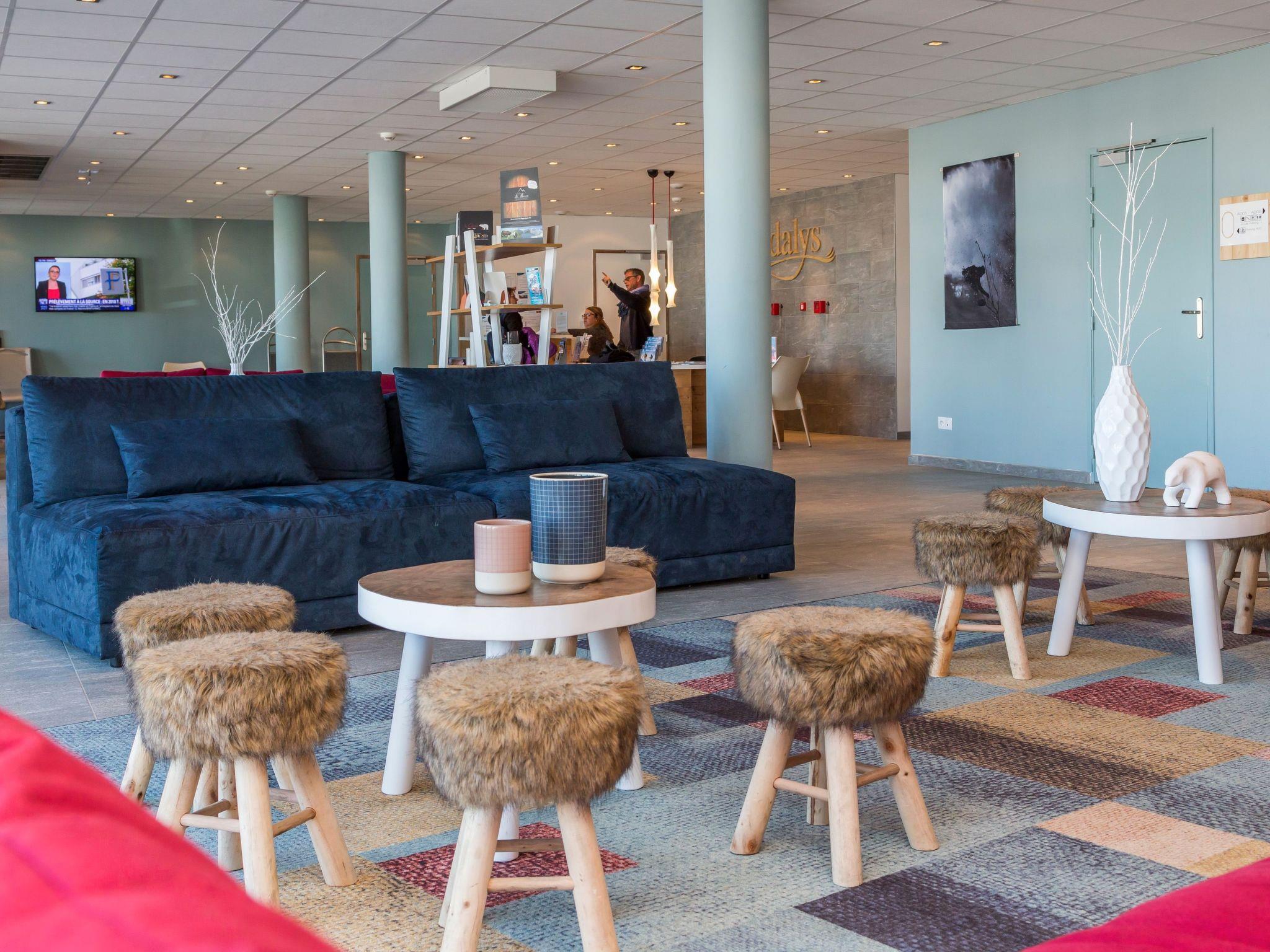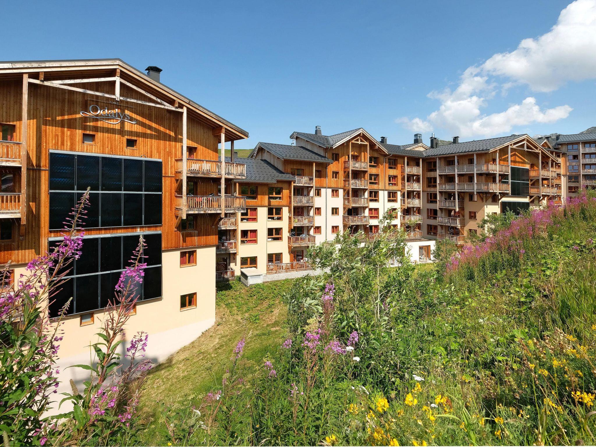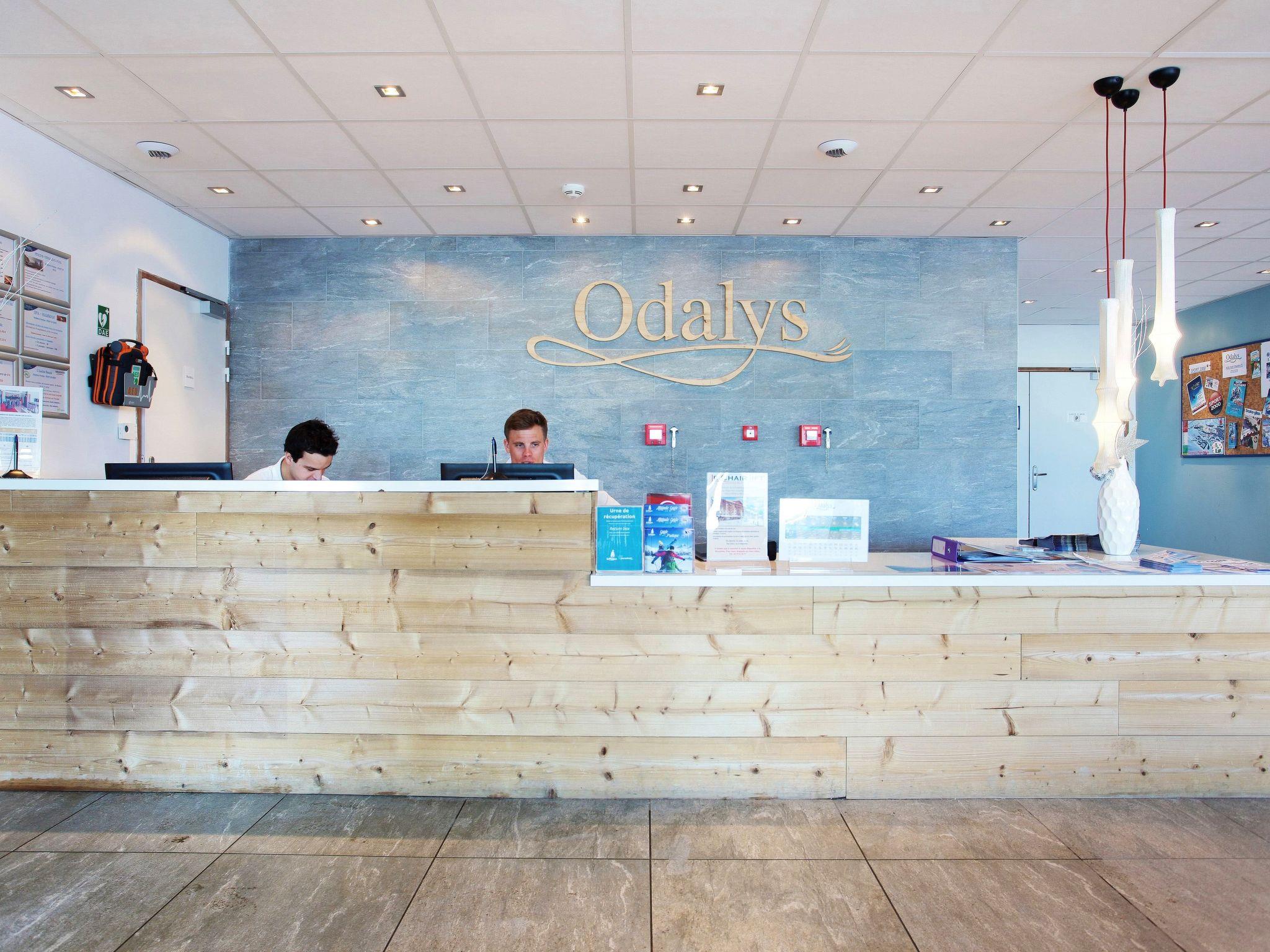 "Odalys Référence Front de Neige", 3-room apartment 54 m2. Modern and tasteful furnishings: living/sleeping room 20 m2 with 2 sleeping facilities, dining table, kitchen corner and satellite TV. Living/sleeping room with 1 pull-out bed (2 pers.), satellite TV. 1 room with 2 sleeping facilities. Small, open kitchen (dishwasher, 4 ceramic glass hob hotplates, toaster, kettle, microwave, electric coffee machine). Sep. WC, bath or shower, bath/WC or shower/WC. Electric heating. Balcony or terrace. Facilities: Internet (WiFi, free). Maximum 1 pet/ dog allowed.