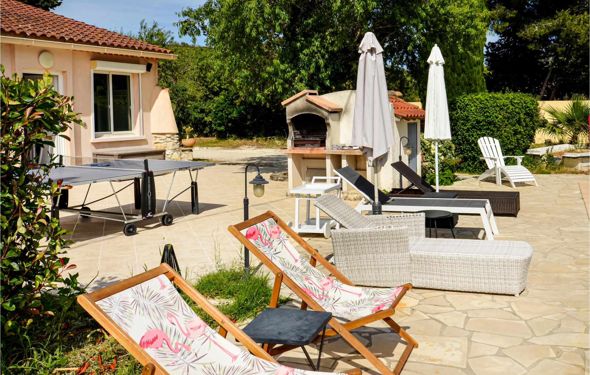 Dette charmerende feriehus ligger på en lille, rolig blind vej meget tæt på Saint Mandrier-halvøen. Nyd middelhavsomgivelserne, det private tilflugtssted og nærheden til kysten og naturen. Træd ind i det indbydende hus med dens hjemlige karakter. I det åbne opholds- og spiseområde kan I tilbringe afslappende timer, uanset om I spiser sammen eller læser en bog på sofaen. Find jer godt til rette her efter en begivenhedsrig dag. Køkkenet er udstyret med store vinduespartier og giver direkte udgang til terrassen.