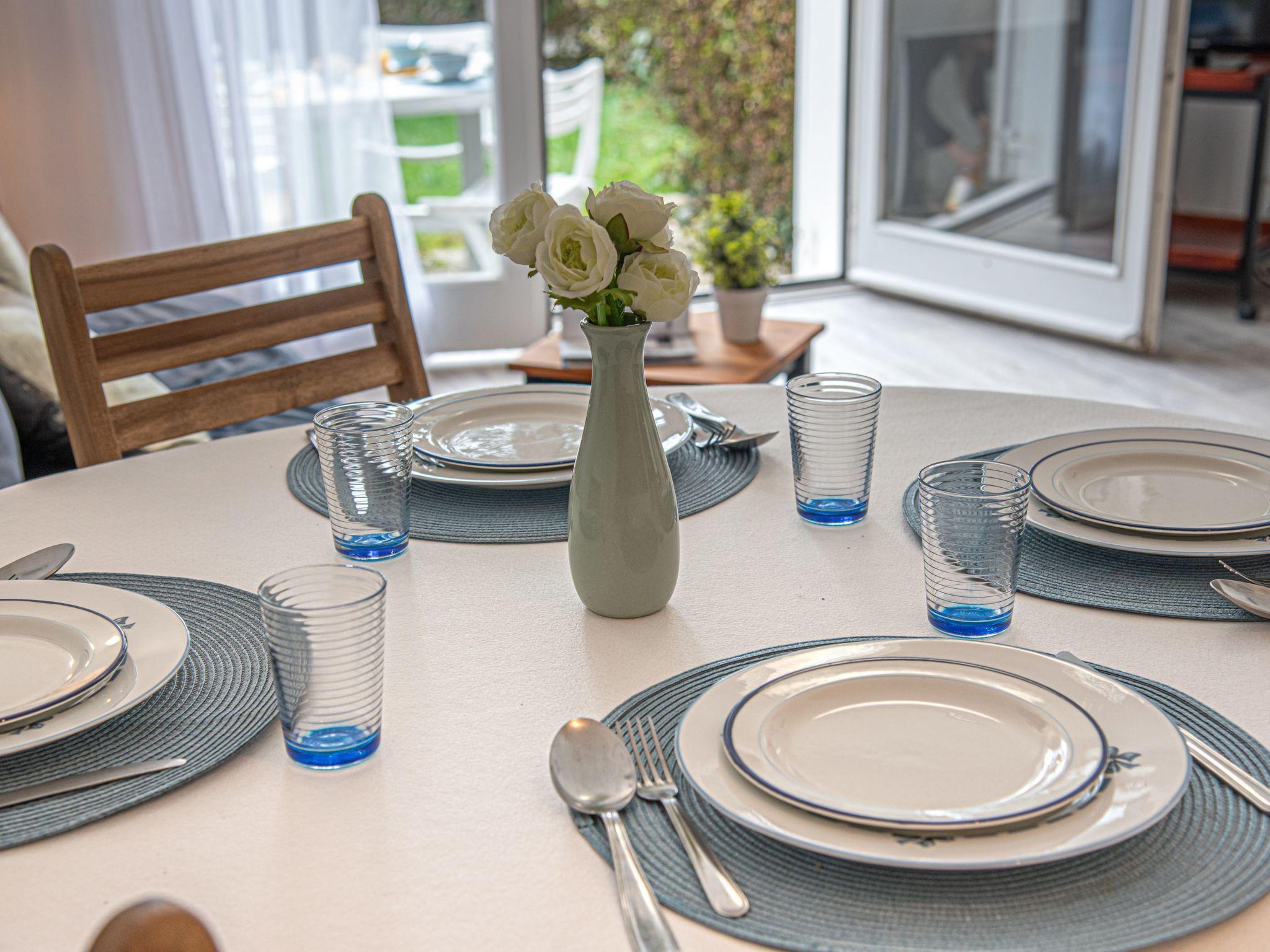 "Le Dolmen", 2-room apartment 34 m2, on the ground floor. Object suitable for 2 adults. Partly renovated in 2021, beautiful furnishings: living/dining room with TV (flat screen). Exit to the terrace. 1 room with 2 beds (80 cm, length 190 cm). Kitchenette (oven, 2 ceramic glass hob hotplates, microwave, electric coffee machine). Bathroom, sep. WC. Electric heating. Small terrace 6 m2. Terrace furniture. View of the garden. Facilities: washing machine, iron, hair dryer. Internet (WiFi, free). Parking (1 car). Please note: non-smokers only. Access to the narrow car park (standard vehicle). 56258000057AU