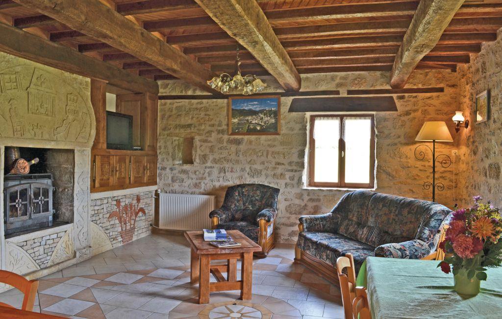Et rummeligt, restaureret bondehus med frie bjælker og stenvægge, der giver en rustik og yderst charmerende stemning.