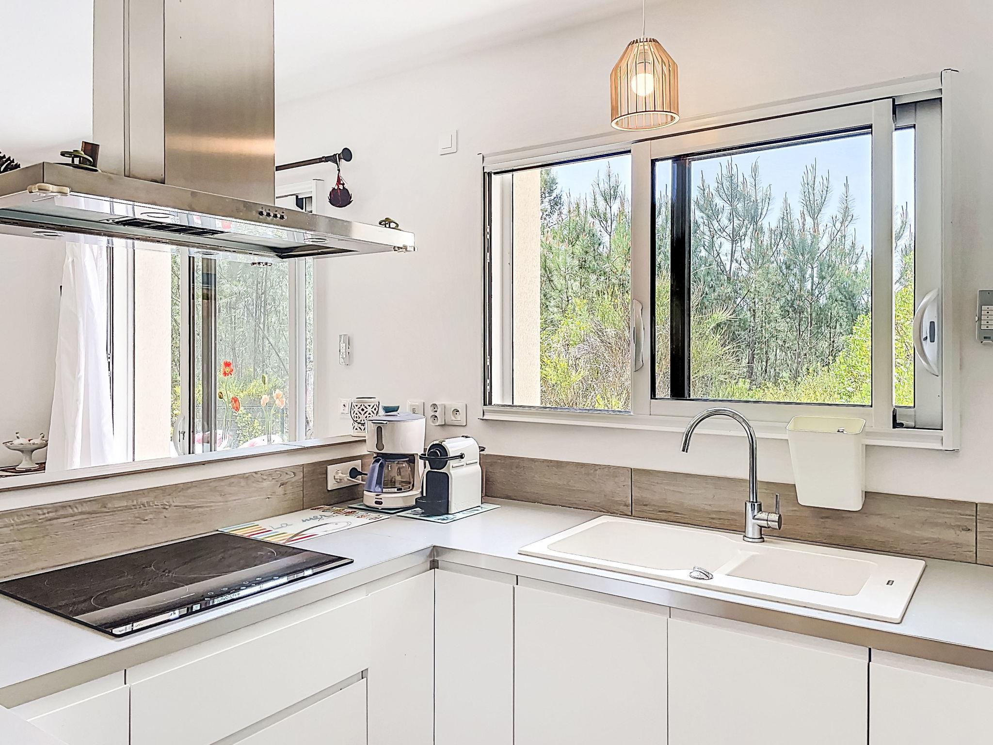 "hibiscus", 5-room house 90 m2, south facing position. Beautiful and cosy furnishings: large living/dining room with flat screen, wood-burning stove, fan and electric shutters. Exit to the garden, to the terrace, south facing position. 1 children's room 20 m2 with panoramic window west facing position with 1 x 2 bunk beds (90 cm, length 200 cm), 1 folding bed (140 cm, length 200 cm), hand-basin. Exit to the terrace. 1 room with 1 double bed (2 x 80 cm, length 200 cm). 1 room with 1 double bed (2 x 80 cm, length 200 cm), electric heating. 1 room with 1 french bed (1 x 160 cm, length 200 cm). Open kitchen (1 hot plate, oven, dishwasher, 3 gas rings, microwave, freezer) with hatch. 2 bathrooms, shower, shower/WC, double hand-basin. Electric heating. Large terrace 40 m2, south facing position, large garden 100 m2, south facing position. Terrace furniture, barbecue, deck chairs. Very beautiful, of the forest. Facilities: washing machine. Parking (fenced). Please note: suitable for families. Non-smoking house. Offer by a private individual according to Art. 155, IV of CGI.