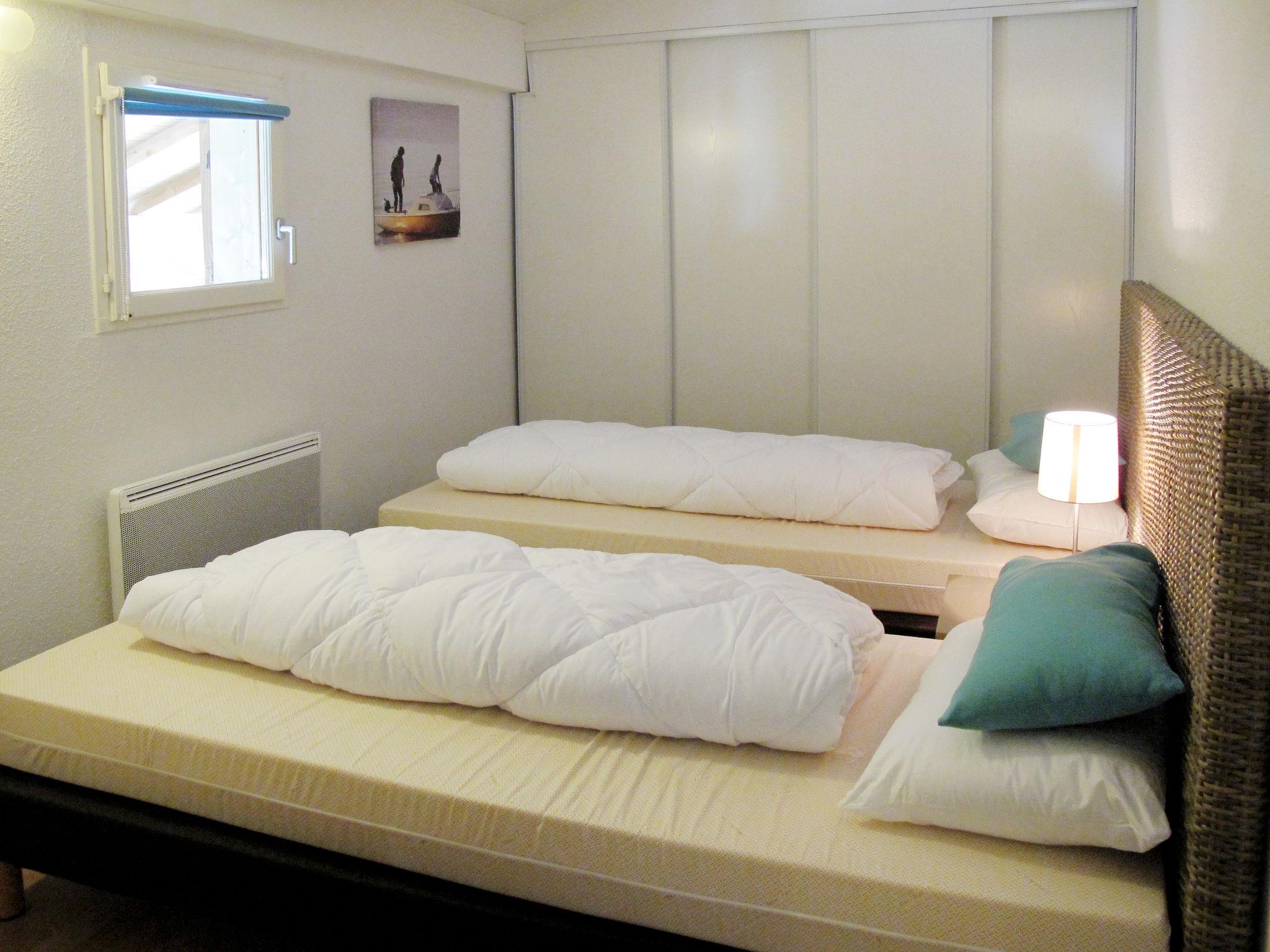 "Les Rives du Lac", 4-room apartment 49 m2. Object suitable for 6 adults. Practical and modern furnishings: living/sleeping room with 1 double sofabed (135 cm), dining table and satellite TV. 1 room with 1 french bed. 1 room with 2 beds (80 cm). 1 room with 1 french bed and shower. Small, open kitchen (dishwasher, 4 ceramic glass hob hotplates, toaster, kettle, microwave, freezer, electric coffee machine). Sep. WC, bath or shower. Electric heating. Balcony or terrace. Terrace furniture, balcony furniture. Facilities: Internet (WiFi, extra). Please note: non-smokers only. Maximum 1 pet/ dog allowed. Smoke alarm. The flats can be located on the ground floor or upper floor (access via external staircase). In addition, this type of flat can also be on 2 or 3 levels.