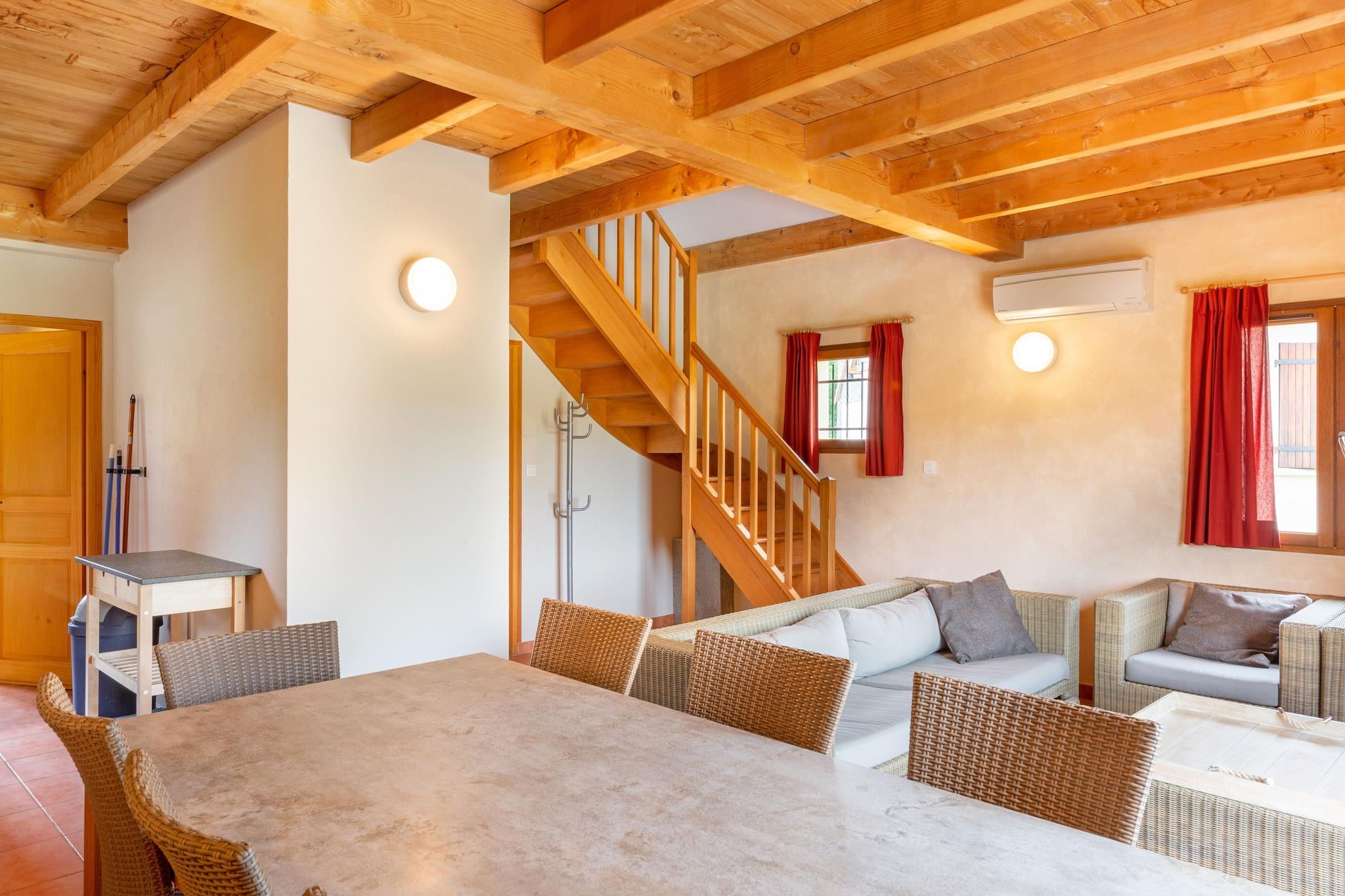 Stueetage: (Køkken(elkedel, komfur, kaffemaskine, mikrobølgeovn, opvaskemaskine , køleskab), stue / spisestue(Fjernsyn, spisebord, DVD-afspiller, videoafspiller), soveværelse(dobbeltseng(160 x 200 cm)), soveværelse(køjeseng), badeværelse(bruser, håndvask), badeværelse(bruser, håndvask), toilet) På 1. etage: (soveværelse(dobbeltseng(180 x 200 cm)), soveværelse(dobbeltseng(180 x 200 cm)), badeværelse(bruser, håndvask), toilet) klimaanlæg, have, havemøbler, solstole, Parasol, swimmingpool(deles med andre gæster), tennisbane(deles med andre gæster), legeredskaber(deles med andre gæster), bordtennisbord, fodboldmål(deles med andre gæster), Volleyballbane