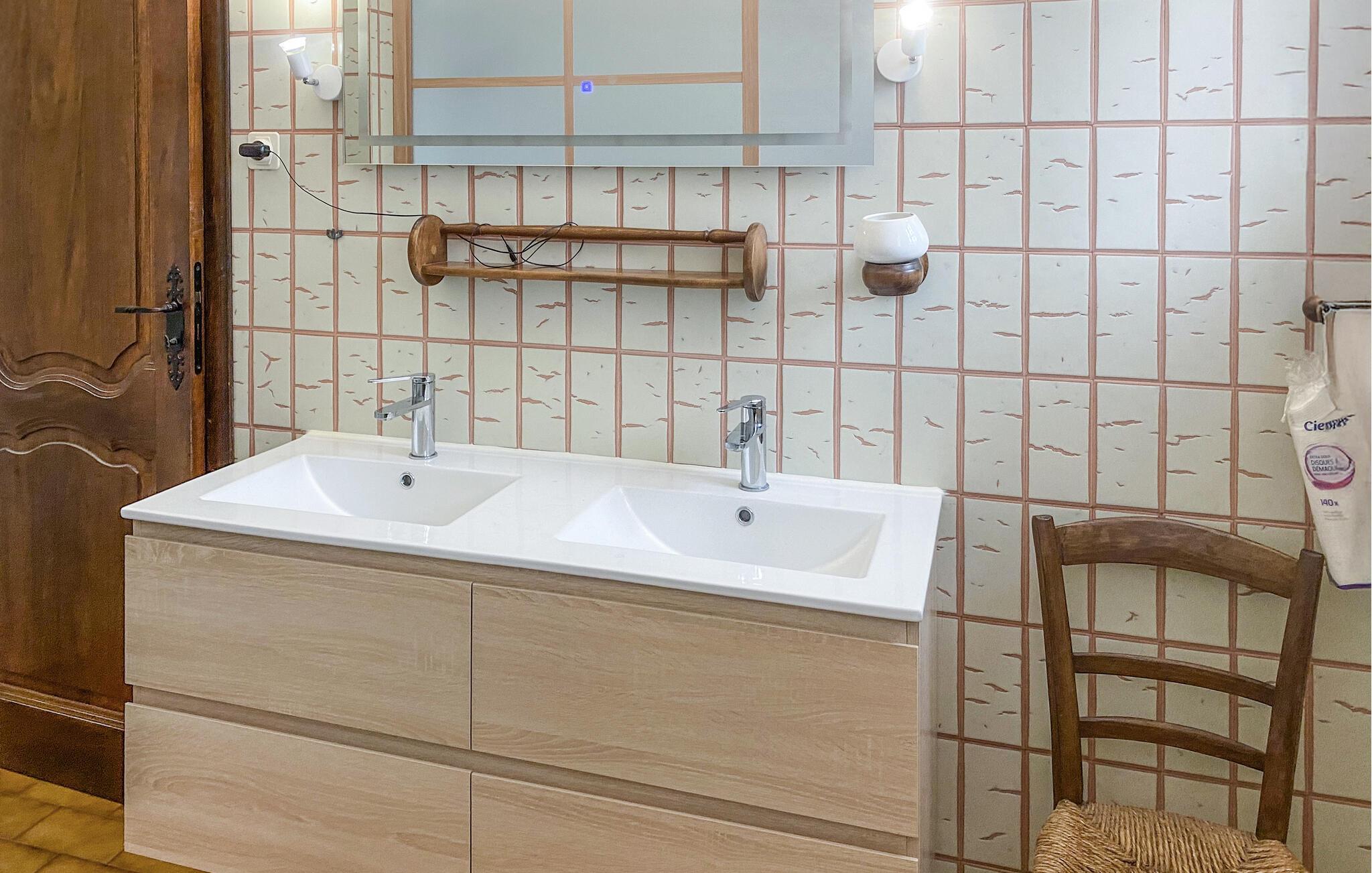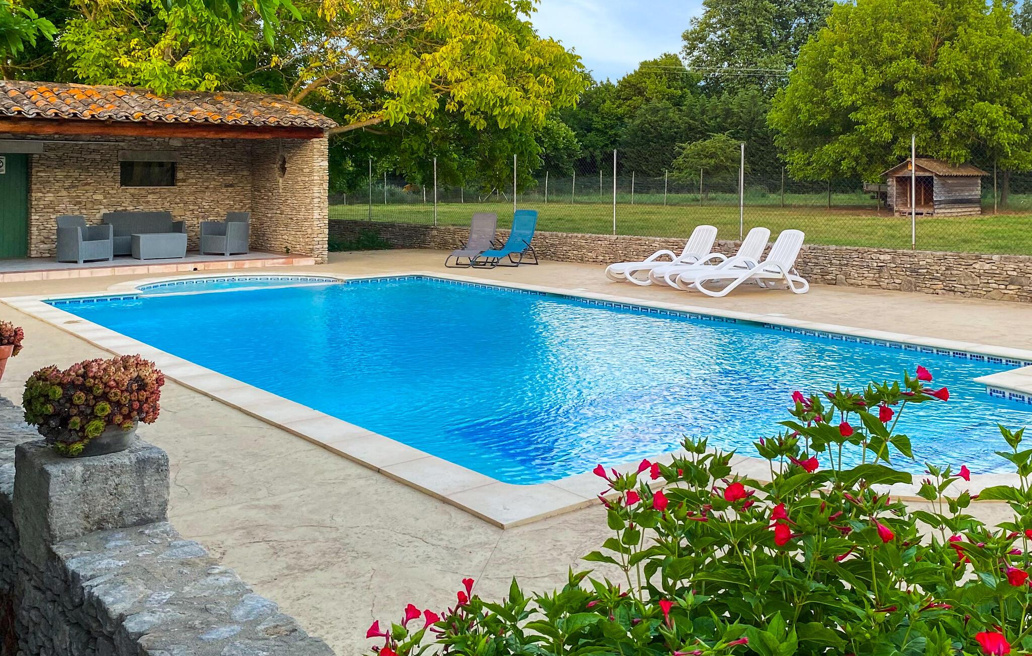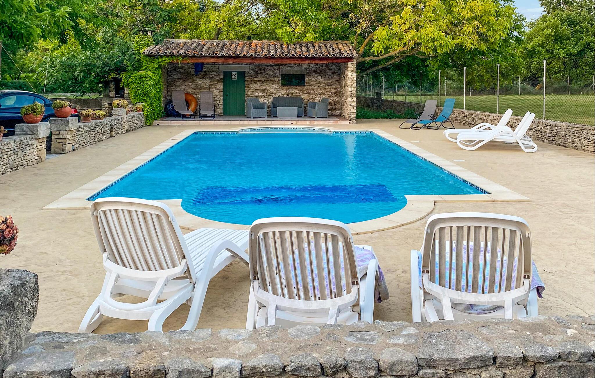Dette feriehus er bygget af den lokale honningfarvede sten. Det ligger på en stor grund, lige uden for den dejlige lille by Lagnes. Lagnes har enkle butikker, restauranter og barer. Husets indretning er komfortabel og typisk. I kan åbne køkkenet mod spiseterrassen, der ligger langs hele husets forside. Køb lokale produkter, lav dejlig mad af dem, og spis i det fri. I må plukke kirsebær, nektariner og figner på grunden. I har udsigt fra terrassen over poolen med saltvand. I poolen er der et fladt område til børn. Spørg efter børnemøbler. Der er en skråning ned mod floden på grunden 70 m fra huset, og der er ikke noget hegn.