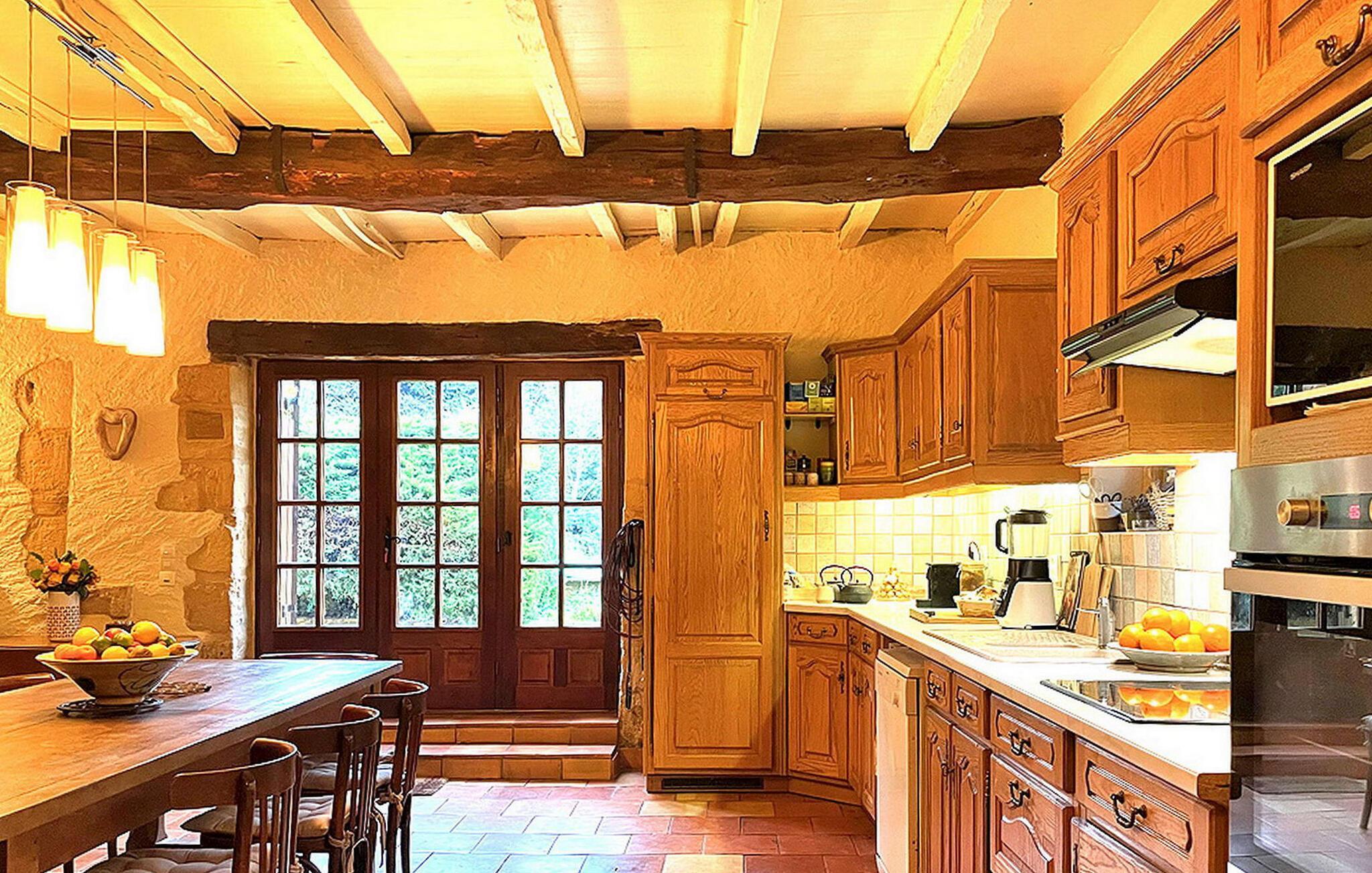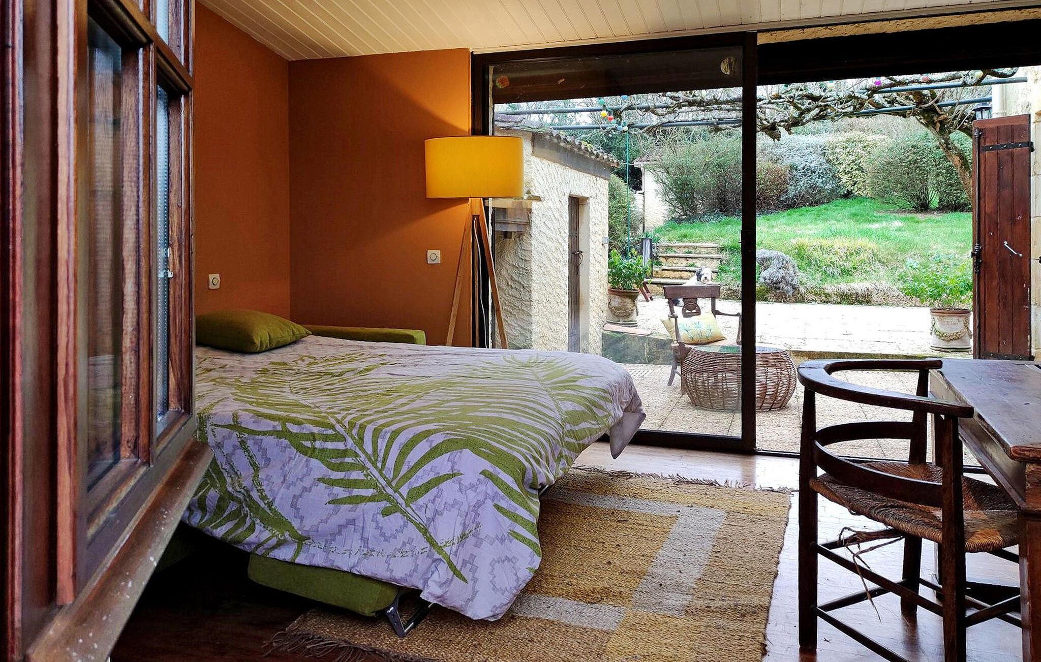 Beliggende i Périgords hjerte tilbyder dette charmerende stenferiehus en fredfyldt flugt med en privat swimmingpool. Beliggende midt på landet, men alligevel inden for 8 km fra Monsacs nærmeste butikker, lover det ro og tilgængelighed. Huset byder på et veludstyret køkken, en hyggelig stue med pejse og komfortable soveværelser fordelt på to etager. Udendørsområdet er en dejlig oase med en 10m x 5m swimmingpool, en brolagt terrasse og et poolhus med faciliteter. Ejendommen omfatter også en overdækket terrasse med siddepladser, en udendørs spiseplads, frodige haver og et fredeligt frugthaveområde på bagsiden. Oplev den fredfyldte charme ved at bo på landet med luksusen fra en privat pool, der giver et fortryllende tilflugtssted midt i Périgords skønhed. Huset ligger på landet, ikke afsondret og nær Château de Lanquais.