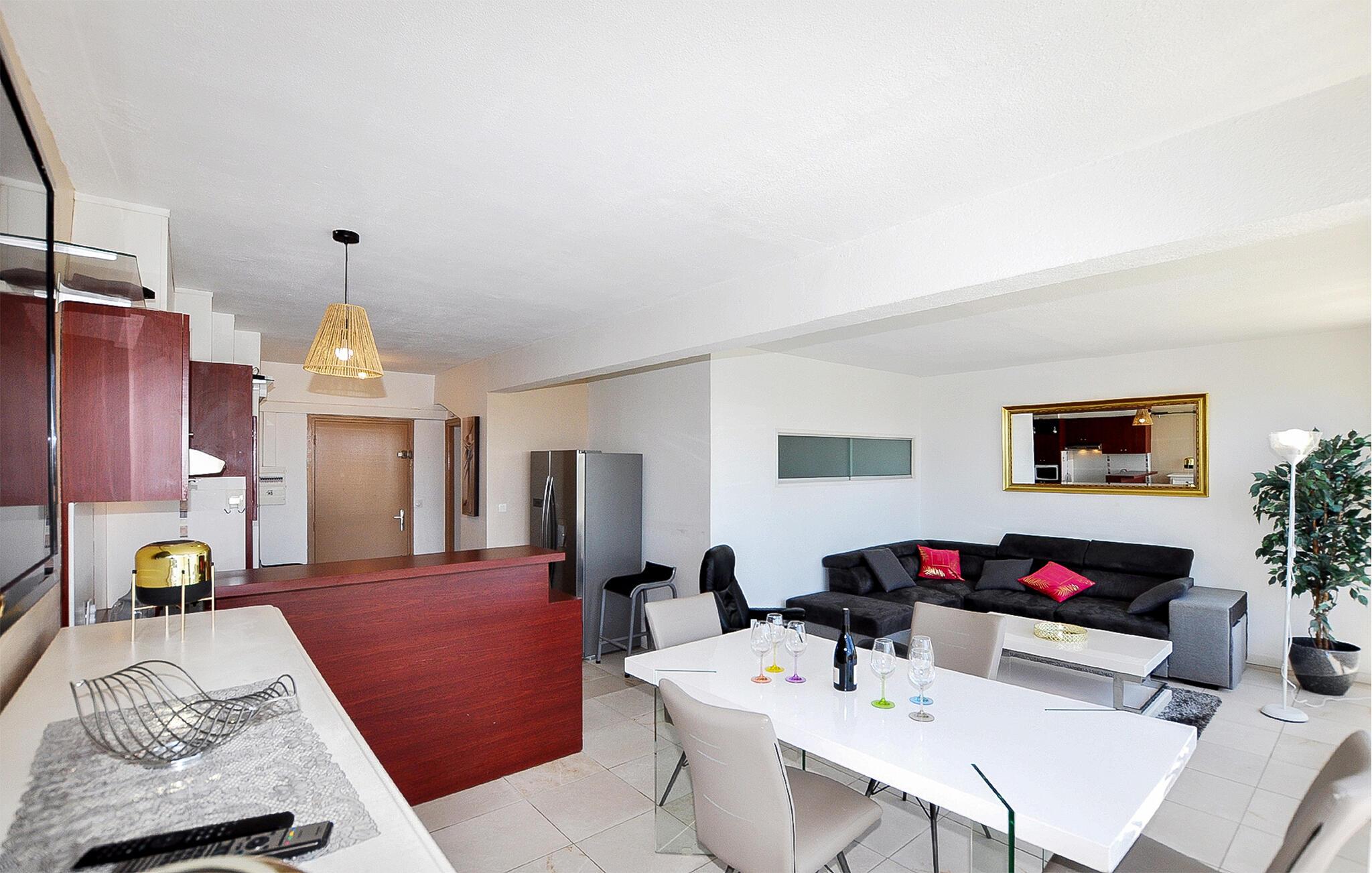 Lejligheden ligger tæt ved stranden og er optimal til en badeferie med spændende udflugter i området. Glæd jer til lejlighedens lyse, moderne rum, hvilket danner nogle gode rammer for at tilbringe tiden sammen og gør det nemt at slappe af. Efter en lang dag med spændende oplevelser kan I finde jer godt til rette i sofaen, lægge fødderne op og nyde den fantastiske udsigt til det fri gennem de store vinduer.