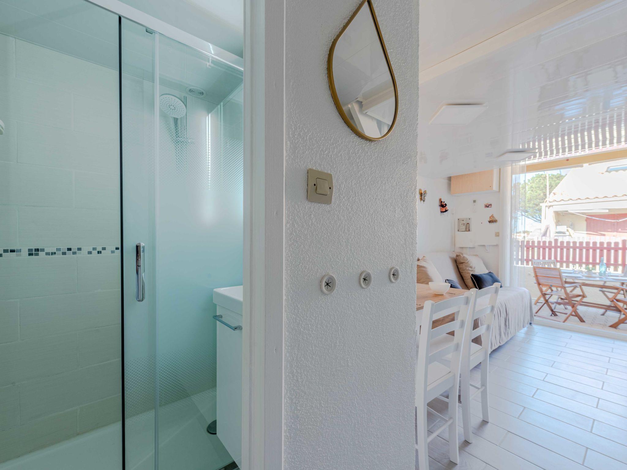 1-room studio 22 m2 on 2 levels. Living/dining room with 1 double sofabed (1 x 140 cm, length 190 cm), TV (flat screen), air conditioning. Exit to the terrace. Open kitchen (mini-oven, dishwasher, 3 ceramic glass hob hotplates, toaster, kettle, microwave, electric coffee machine). Shower/WC. Heating, air-conditioning. Upper floor: open gallery with 1 french bed (1 x 140 cm, length 190 cm), air conditioning. Terrace 15 m2. Terrace furniture, electric barbecue. Facilities: washing machine, dryer, iron. Internet (WiFi, extra). Parking. Please note: smoke alarm. Instead of an enclosed bedroom, some sleeping areas are located in an open-plan area (gallery, alcove, etc.). Offer by a private individual according to Art. 155, IV of CGI.