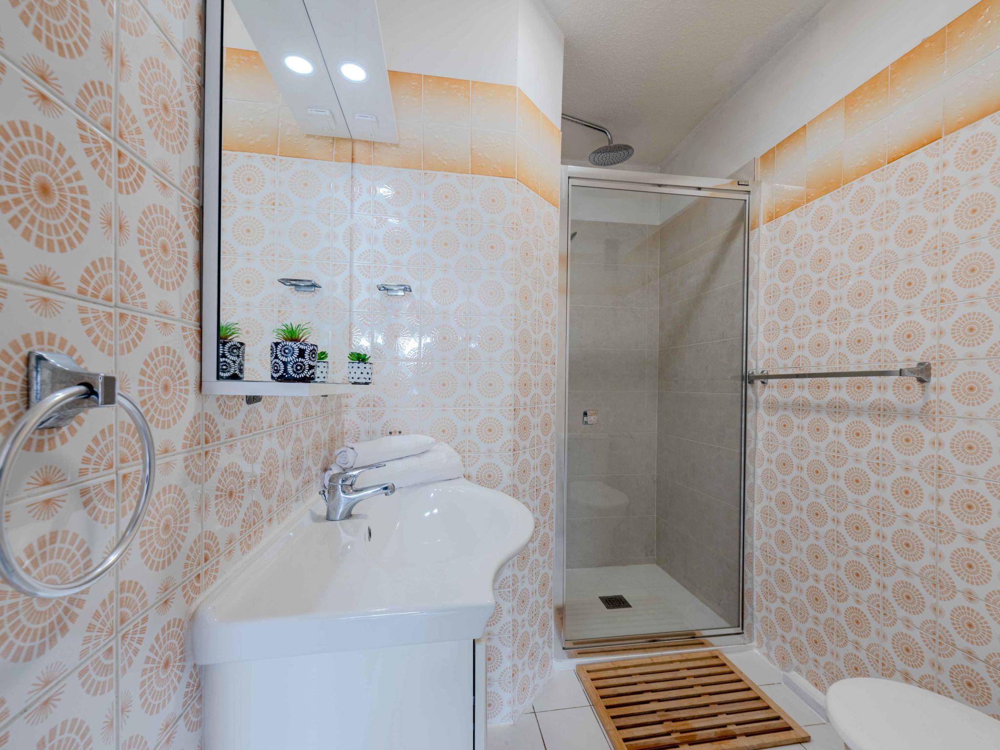 2-room apartment 30 m2 on 1st floor, south facing position. Living/dining room with 1 double sofabed (1 x 140 cm, length 190 cm), TV (flat screen). Exit to the terrace. 1 room with 1 french bed (1 x 160 cm, length 200 cm). Kitchenette (oven, 4 ceramic glass hob hotplates, toaster, kettle, microwave, electric coffee machine) with air conditioning. Shower/WC. Heating. Terrace 7 m2. Terrace furniture. Beautiful view of the port. Facilities: washing machine. Internet (WiFi, extra). Parking. Please note: smoke alarm. Offer by a private individual according to Art. 155, IV of CGI.