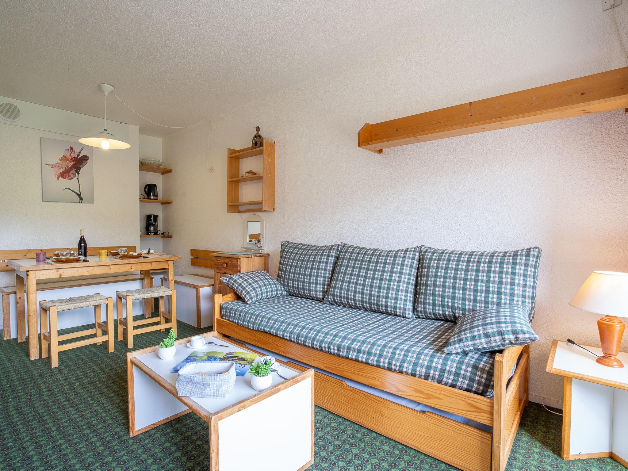 1-room apartment 28 m2 on 8th floor, south facing position. Simple furnishings: living/dining room with 1 pull-out bed (2 pers. 2 x 80 cm, length 190 cm), TV (flat screen). Exit to the balcony, south facing position. Alcove with 1 x 2 bunk beds (80 cm, length 190 cm). Kitchenette (2 hot plates, oven, toaster, kettle, microwave, electric coffee machine). Bathroom, sep. WC. Electric heating. Carpet. Balcony 4 m2, south facing position. Balcony furniture. View of the ski run. Facilities: hair dryer. Internet (WiFi, extra). Please note: maximum 1 pet/ dog allowed. Smoke alarm. Instead of an enclosed bedroom, some sleeping areas are located in an open-plan area (gallery, alcove, etc.). Offer by a private individual according to Art. 155, IV of CGI.