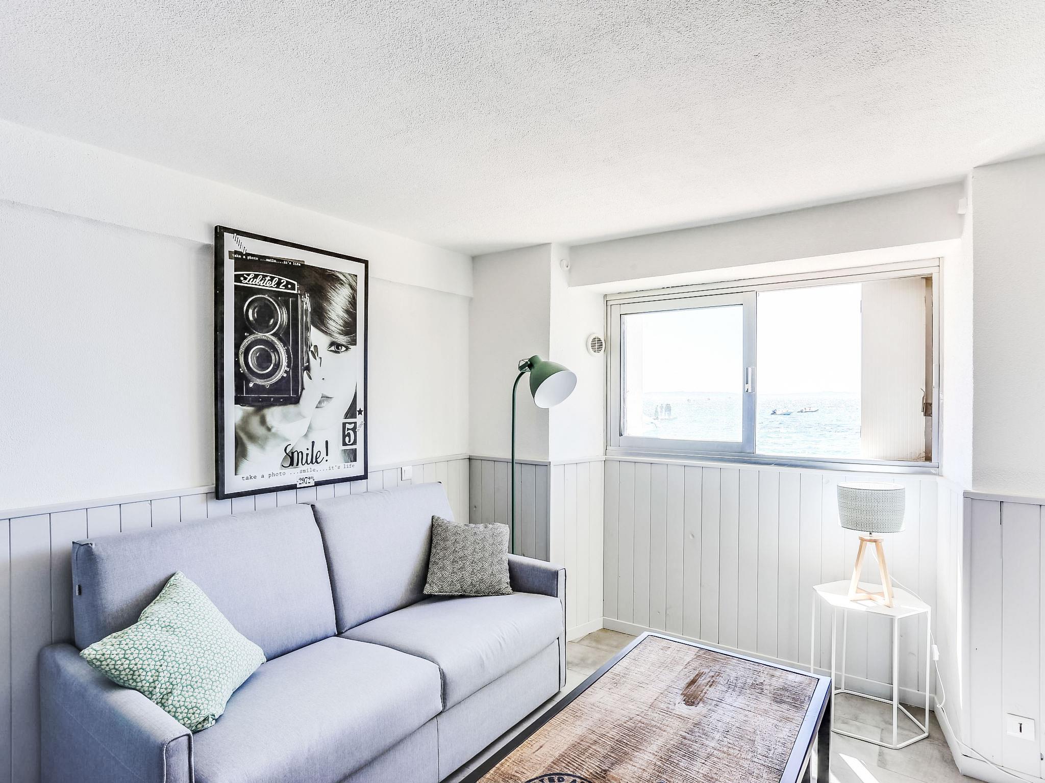 1-room studio 20 m2, on the ground floor. Simple and beautiful furnishings: living/dining room with 1 double sofabed (140 cm, length 190 cm), dining table and TV (flat screen). Kitchenette (2 ceramic glass hob hotplates, toaster, kettle, electric coffee machine, combination microwave). Shower/WC. No heating option. View of the sea. Facilities: Internet (WiFi, extra). Please note: no parking. Maximum 1 pet/ dog allowed. TV only FR. Smoke alarm. 8307000091231