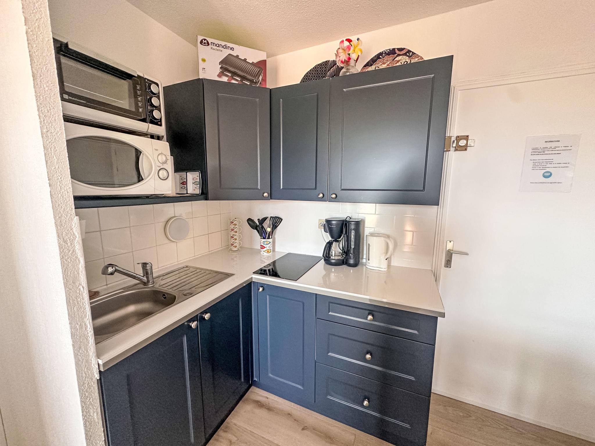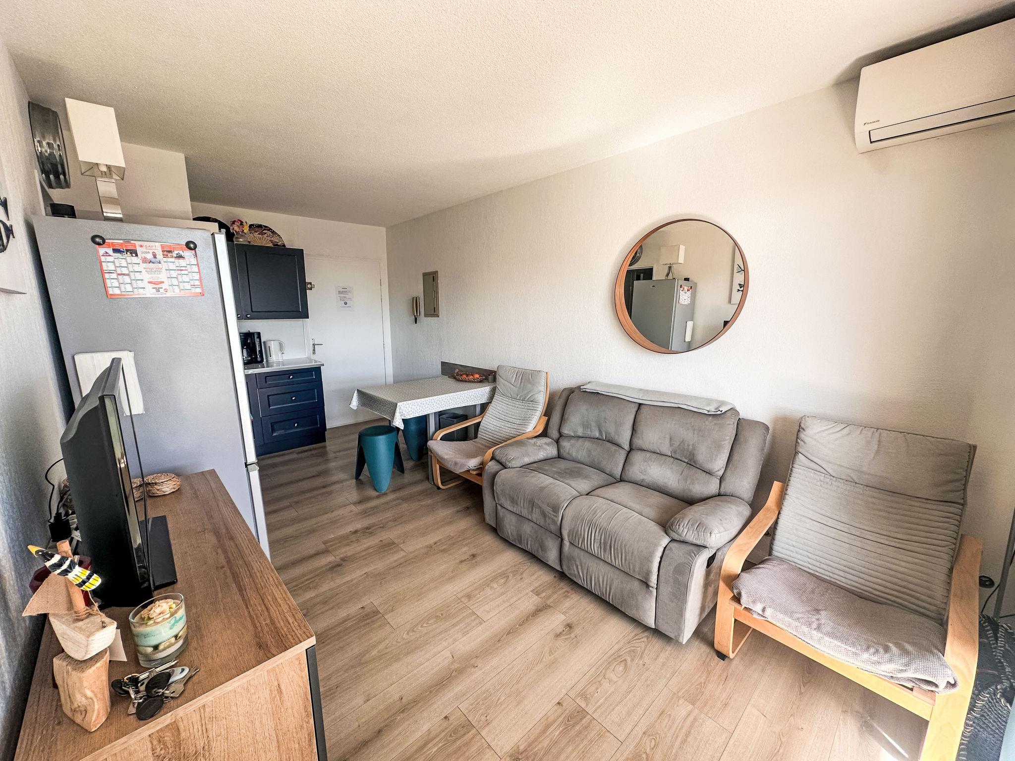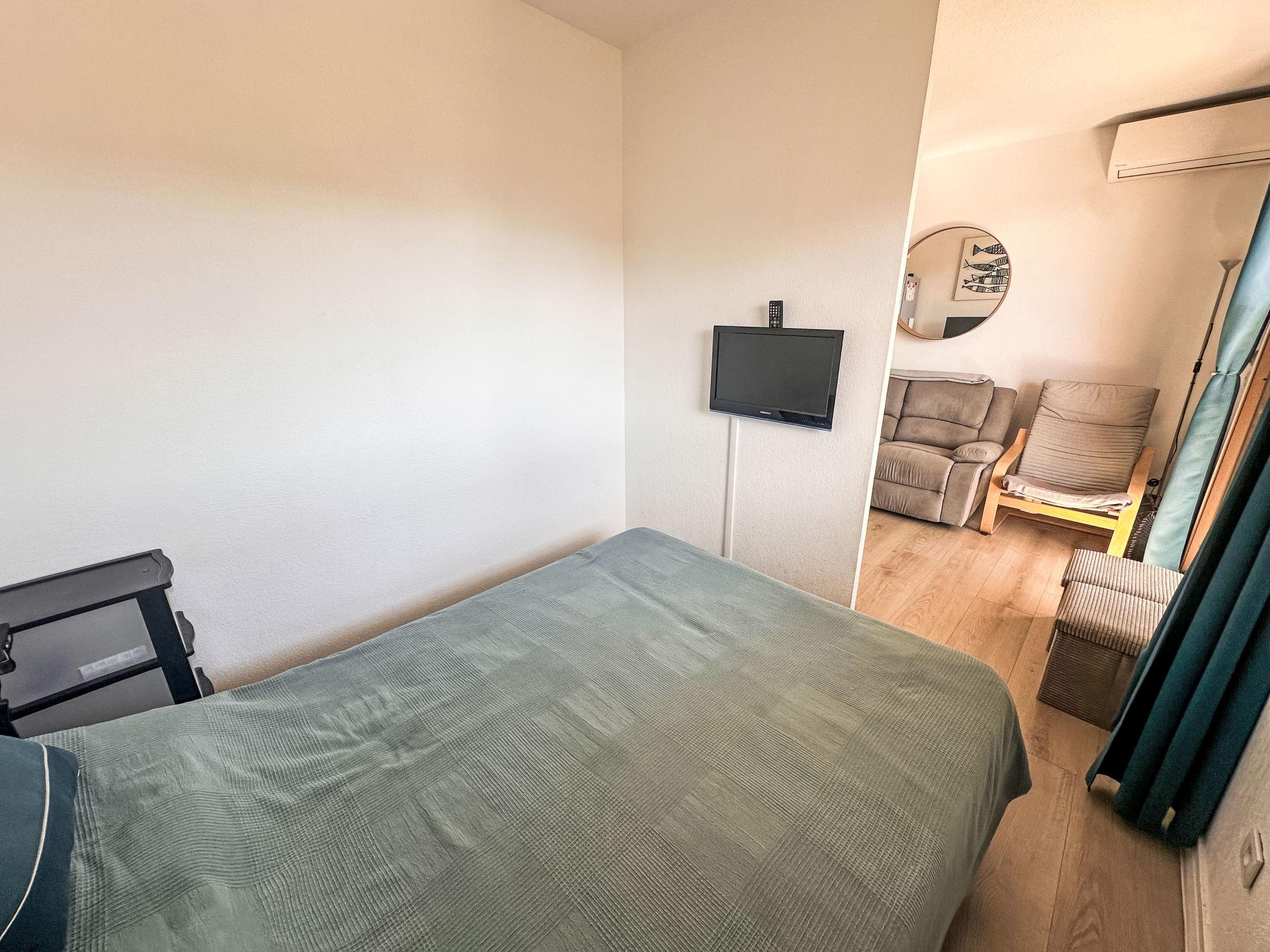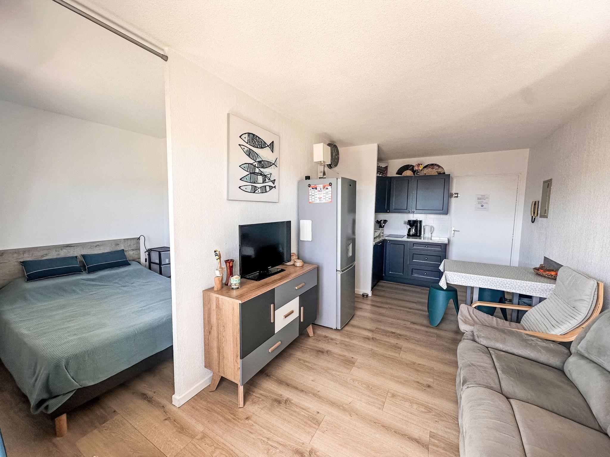 2-room apartment 24 m2 on 5th floor, east facing position. Comfortable furnishings: living/dining room with TV (flat screen), air conditioning. Exit to the terrace. 1 small room with curtain with 1 french bed (140 cm, length 190 cm). Kitchenette (mini-oven, oven, 2 ceramic glass hob hotplates, toaster, kettle, microwave, freezer, electric coffee machine). Shower, sep. WC. Electric heating. Terrace 8 m2, east facing position. Terrace furniture. Partial view of the sea. Facilities: hair dryer. Internet (WiFi, extra). Garage space n 178, height 220 cm, width 220 cm. Please note: apartment carpark side. Non-smokers only. TV only FR. Smoke alarm. Offer by a private individual according to Art. 155, IV of CGI. 83070000957EE