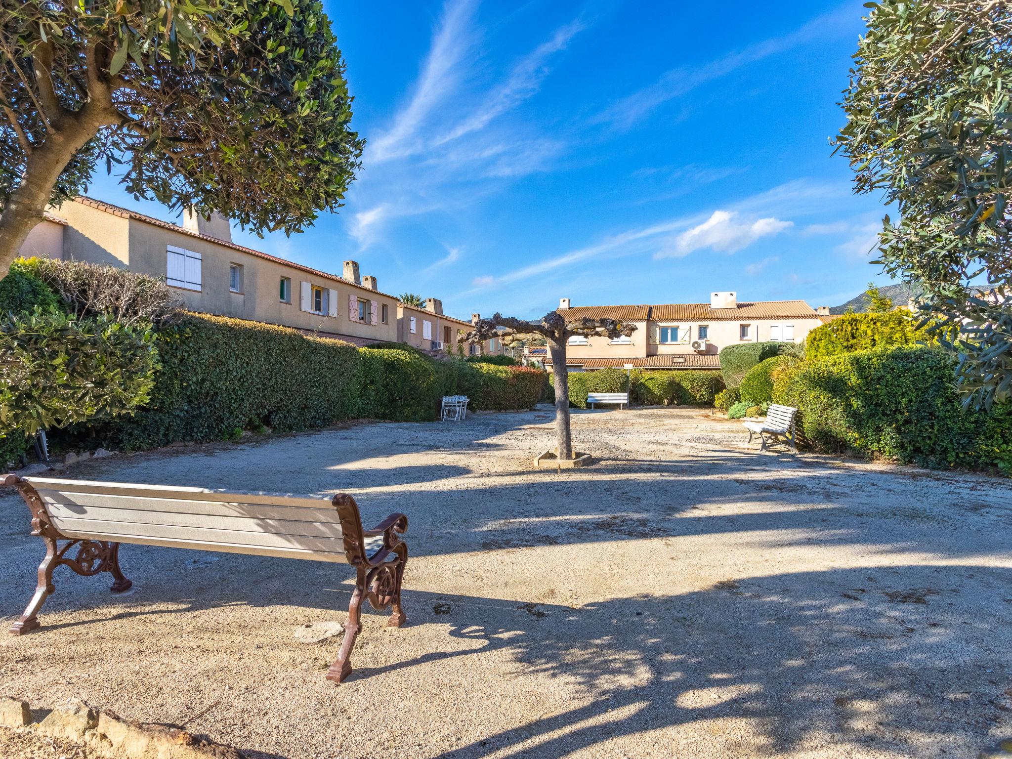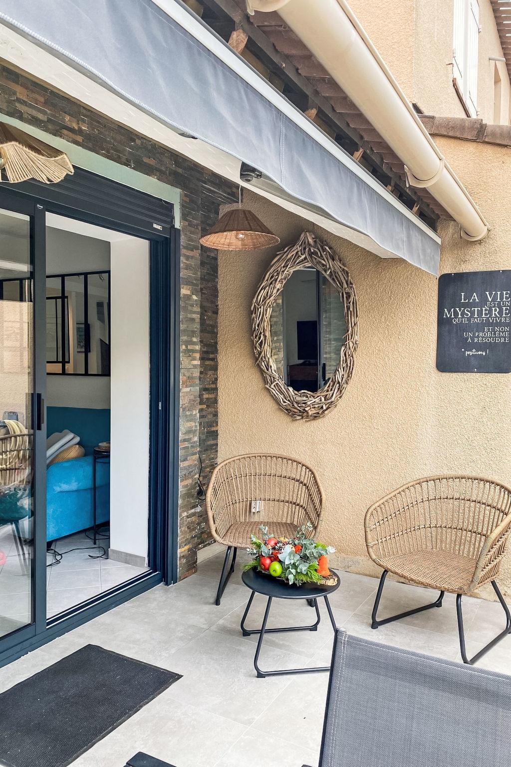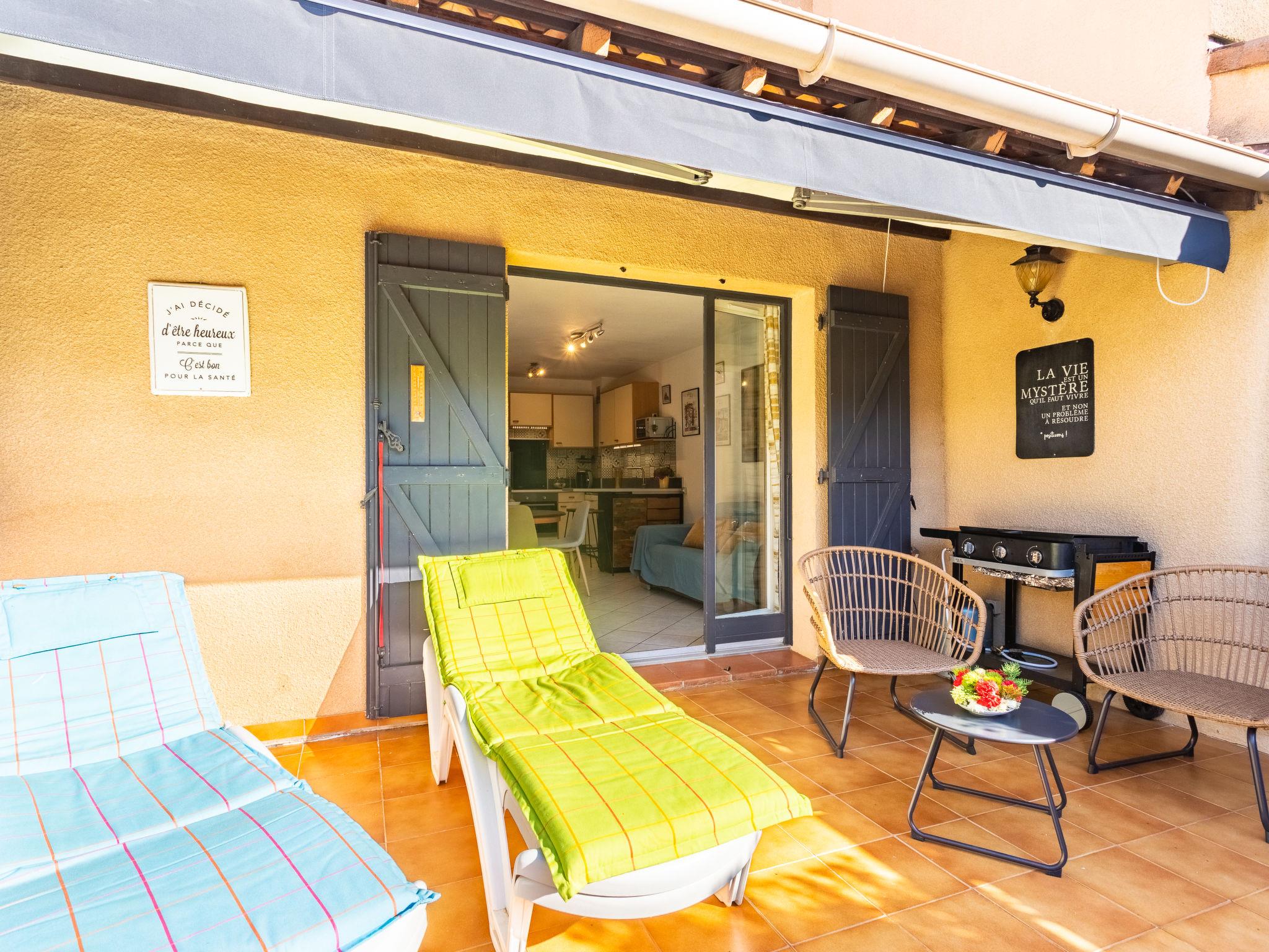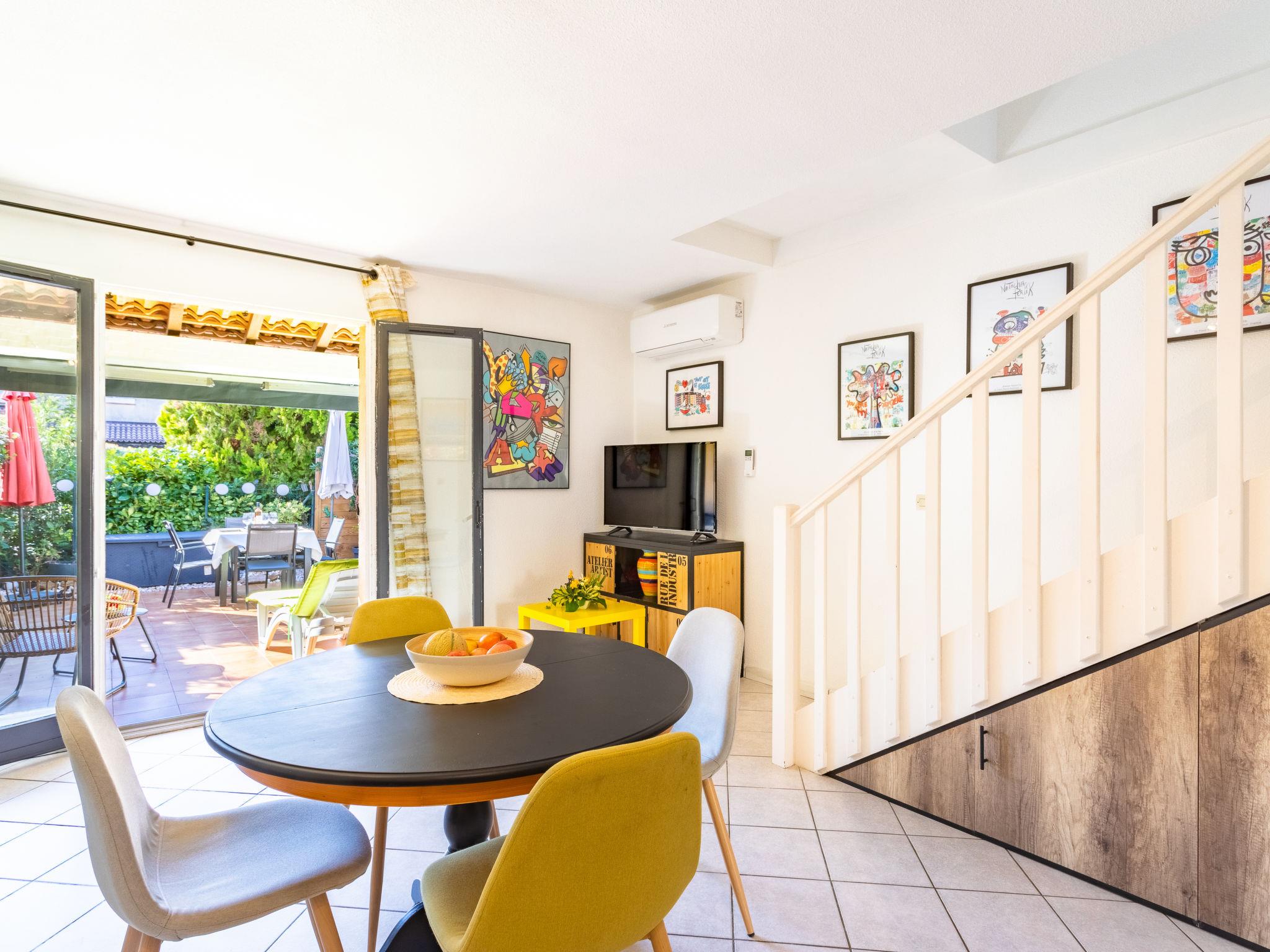 3-room terraced house 55 m2 on 2 levels. Comfortable and beautiful furnishings: living/dining room with TV (flat screen), air conditioning. Open kitchen (oven, dishwasher, 4 induction hot plates, toaster, kettle, microwave, electric coffee machine). Sep. WC. Electric heating. Upper floor: 1 room with 1 french bed (160 cm, length 200 cm), TV (flat screen), air conditioning. Open gallery with sloping ceilings with rooflight with 1 french bed (140 cm, length 190 cm), air conditioning. Shower/WC. Terrace 30 m2. Terrace furniture, barbecue, deck chairs (4). Facilities: washing machine, iron. Internet (WiFi, extra). Parking at the house. Please note: non-smoking house. TV only FR. Smoke alarm. Instead of an enclosed bedroom, some sleeping areas are located in an open-plan area (gallery, alcove, etc.). 83070 000994 74