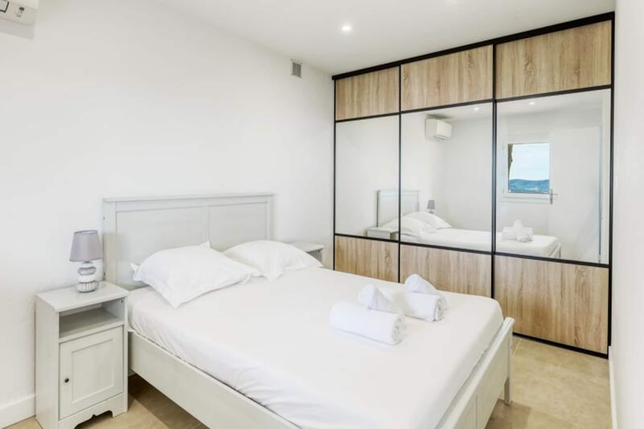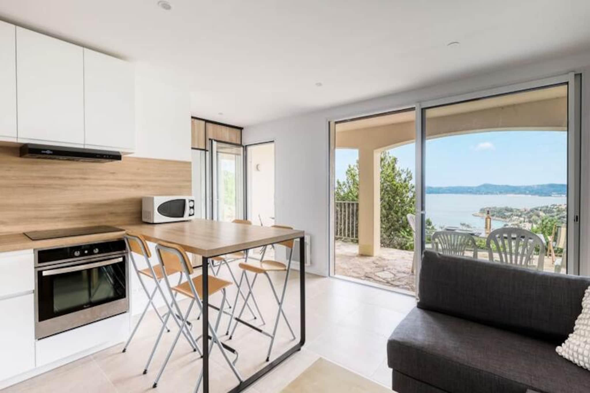 Beliggende på den fredfyldte Aiguebelle-bakke i Le Lavandou inviterer denne nyrenoverede lejlighed på 40 kvm dig til at fordybe dig i den franske rivieras skønhed. Omgivet af frodigt grønt og med en fantastisk havudsigt er det det perfekte tilflugtssted for dem, der søger ro og charme. Den blide lyd af bølger og middelhavsbrisen skaber en idyllisk atmosfære under dit ophold. Indenfor kan lejligheden prale af en lys og luftig opholdsstue med et fuldt udstyret åbent køkken, ideelt til at tilberede måltider med friske lokale ingredienser. Det separate soveværelse sikrer privatliv og afslappende nætter, mens det funktionelle badeværelse bidrager til bekvemmeligheden. Gå ud på den private terrasse, hvor havemøbler venter på at spise under åben himmel eller blot nyde den betagende udsigt. Moderne bekvemmeligheder såsom aircondition og Wi-Fi sikrer en problemfri og afslappende oplevelse. Beliggenheden tilbyder nem adgang til de uberørte strande og naturskønne kyststier, kun en kort køretur eller forfriskende gåtur væk. Gratis parkering ved foden af ??bygningen bidrager til bekvemmeligheden, selvom den stejle skråning, der fører til lejligheden, kræver god mobilitet. For din bekvemmelighed er en daglig concierge-service inkluderet, der sørger for sengetøj, håndklæder og opredte senge ved ankomst, hvilket sikrer en bekymringsfri ferie. Uanset om du udforsker den pulserende by Le Lavandou, soler dig på gyldne strande eller nyder det lokale køkken, fungerer denne lejlighed som en perfekt base for at opleve Rivieraen i dit eget tempo. Lad charmen ved Aiguebelle-bakken og Middelhavets azurblå vand skabe minder for livet.