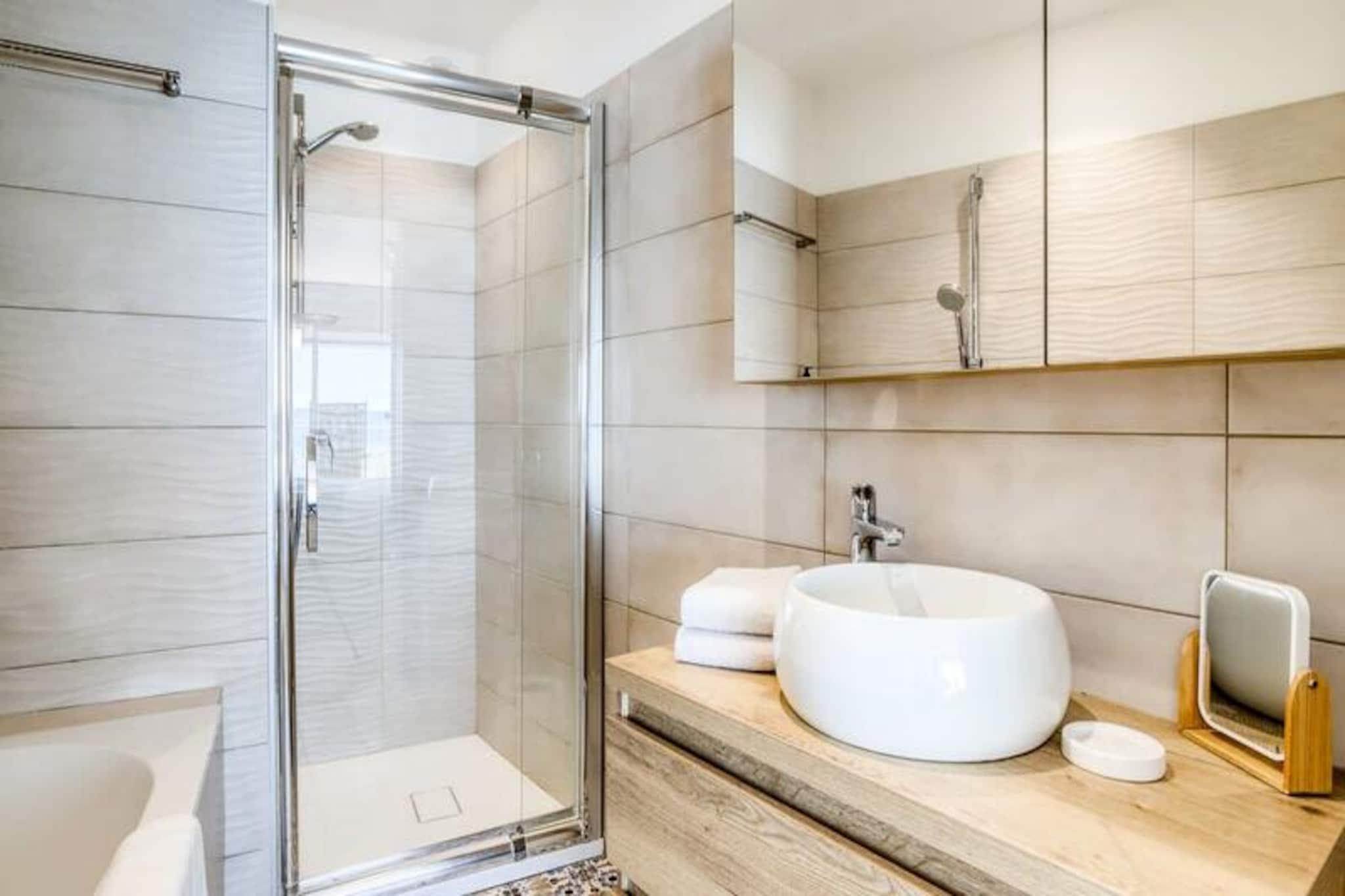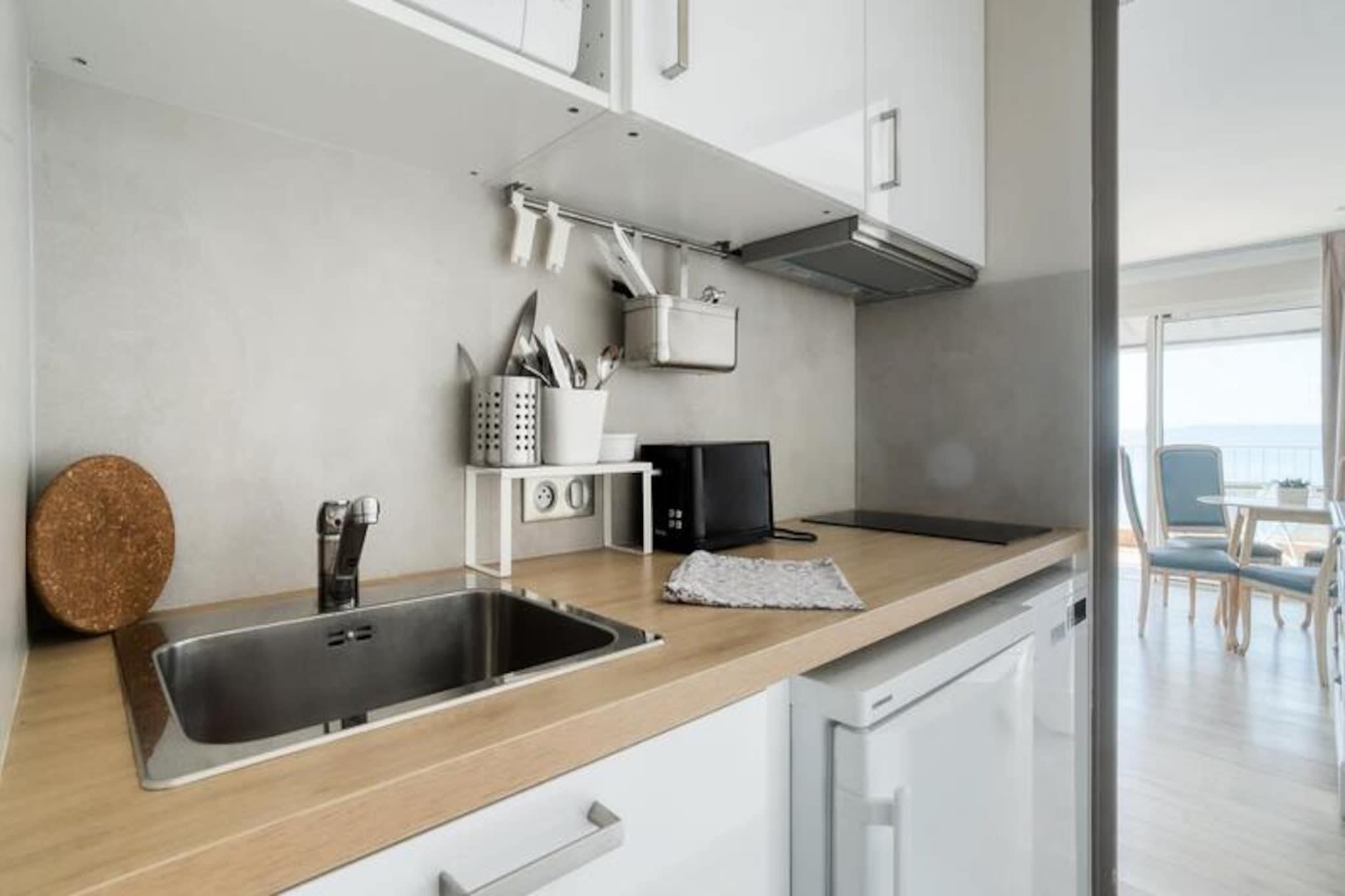 Forestil dig at vågne op til den beroligende lyd af bølger og en betagende udsigt over Middelhavet. Denne eksklusive suite, beliggende i det prestigefyldte 4-stjernede Roc-Hôtel i Saint-Clair-distriktet, tilbyder en unik blanding af hotelluksus og lejlighedsfrihed. Den er tilgængelig under hotellets årlige lukning fra november til marts og tilbyder et roligt tilflugtssted for par, familier eller fjernarbejdere, der søger ro ved havet. Med sin egen indgang og direkte adgang vil du føle dig helt uafhængig, mens du nyder komforten i et eksklusivt etablissement. \n\nIndenfor er suiten omhyggeligt designet med et udstyret tekøkken, aircondition/varme, Wi-Fi og privat parkering. Sengene er redt ved ankomst, og sengetøj og håndklæder er inkluderet, hvilket sikrer et problemfrit og behageligt ophold. Den panoramiske havudsigt fra suiten er virkelig enestående og tilbyder glimt af Îles d'Or, inklusive Port-Cros og Le Levant. Uanset om du tilbereder et måltid i tekøkkenet eller bare slapper af, er atmosfæren præget af ren kystcharme. \n\nTræd udenfor, og du er kun en kort gåtur fra Saint-Clair-stranden, kendt som \