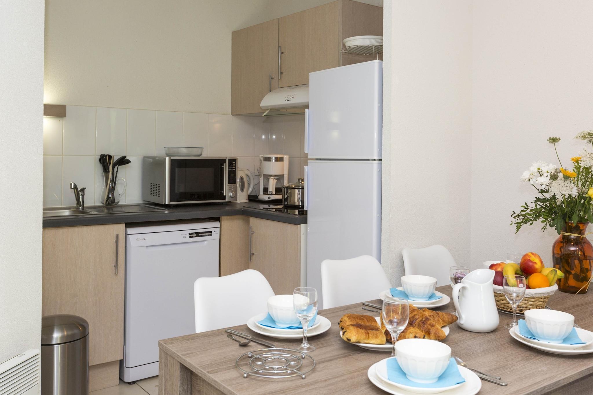Sofastue(dobbeltsovesofa, Fjernsyn), tekøkken(komfur(glaskeramisk), mikrobølgeovn, opvaskemaskine , køleskab), soveværelse(2x enkeltseng), badeværelse(badekar eller bruser, toilet), terrasse, havemøbler, swimmingpool(deles med andre gæster, overdækket)