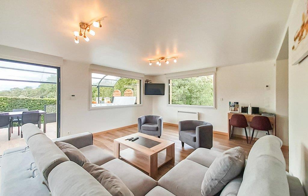 Du vil sætte pris på det moderne og venlige interiør med rummelige og veludstyrede værelser. Saunaen, 1 stort soveværelse med en barneseng og et badeværelse ligger i stueetagen. De andre 3 soveværelser og det andet badeværelse er ovenpå. Stor stue med adgang til terrassen og køkken med adgang til den store spisestue.