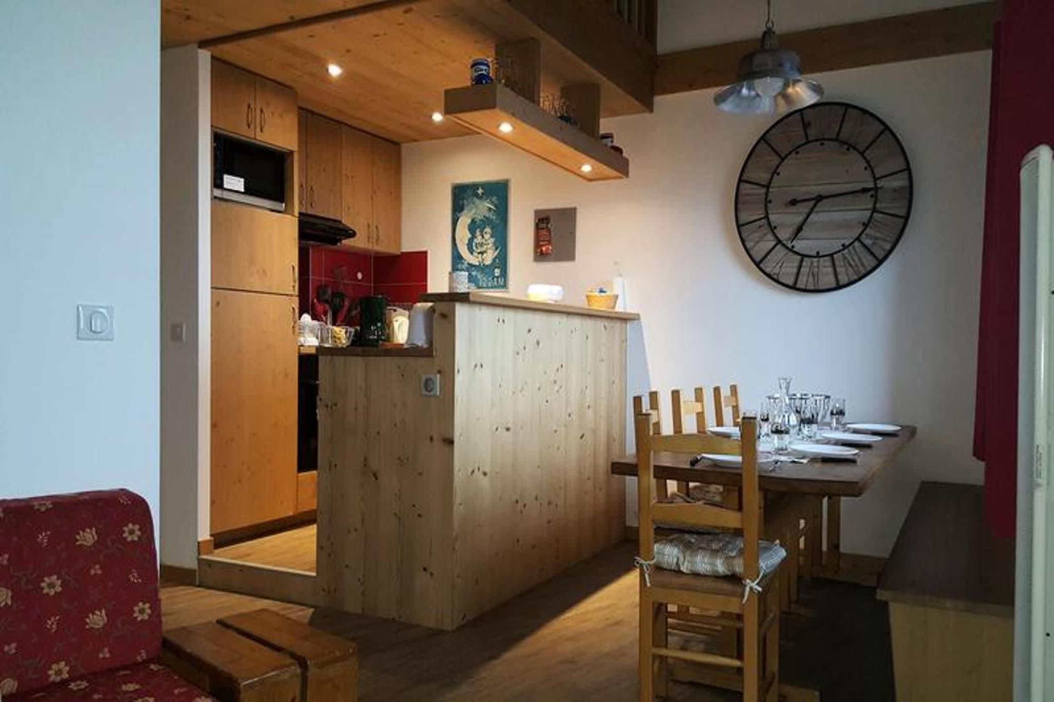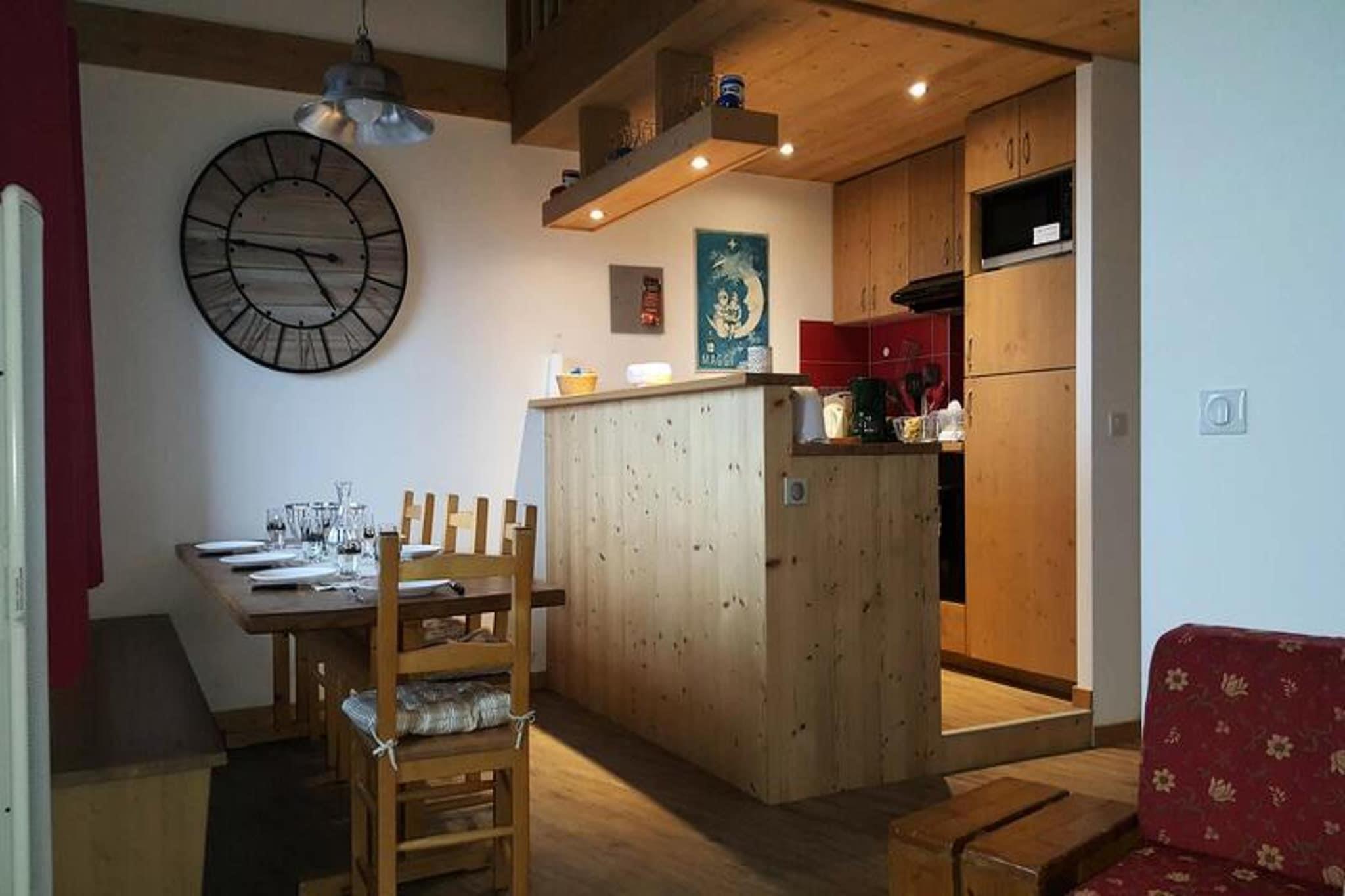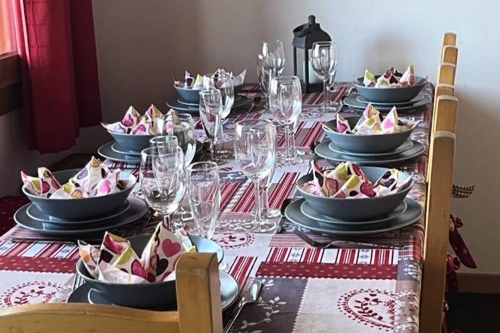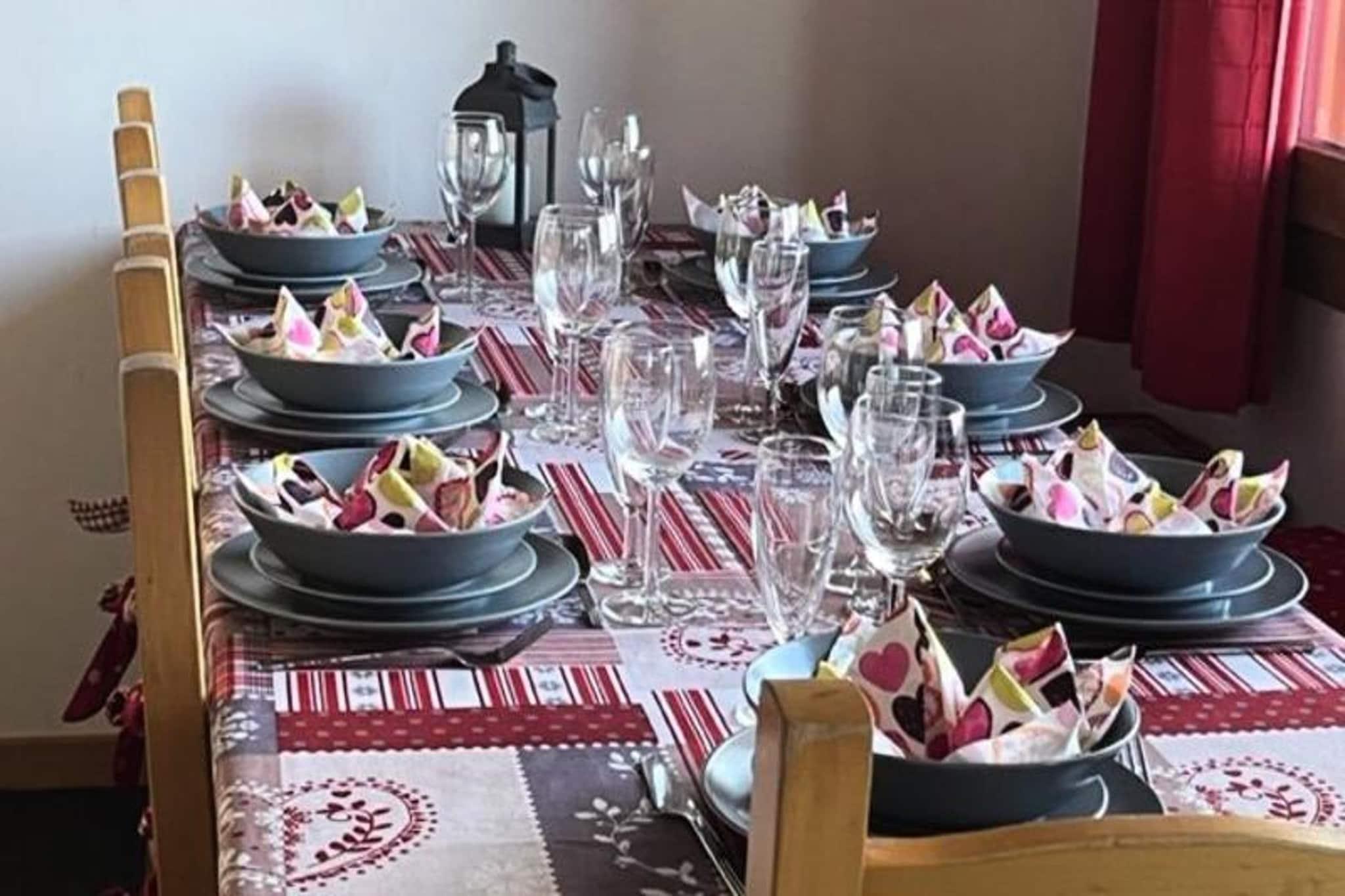 This duplex apartment, designed to accommodate 8 people, offers a comfortable and spacious stay. It features four bedrooms: two with single beds, one with bunk beds, and one with two single beds. Each bed is equipped with a single duvet for added comfort. The apartment is non-smoking, and pets are not allowed. Linen and cleaning services are not included but can be booked separately. Tourist tax is not included in the rental price. The apartment also offers three TVs, a DVD player, and free WiFi for your entertainment. Located in the hamlet of La Forêt, this apartment offers great proximity to the area's attractions. It is just 5 minutes from the ESF ski lessons and 2 minutes from the slopes, perfect for winter sports enthusiasts. The Piou Piou club, ideal for children, is 10 minutes away, while shops and restaurants are just a short 5-minute walk. This prime location ensures you have everything you need within easy reach. The apartment features an open-plan kitchen with modern appliances including induction hobs, a Siemens dishwasher, an LG microwave, and a traditional oven. A fridge-freezer combination, toaster, kettle, and coffee maker (both filter and capsule options) are also provided for your convenience. The apartment includes a combined washing machine and dryer, and the bathroom and separate toilet facilities ensure a comfortable stay. A balcony is available to enjoy the mountain views.