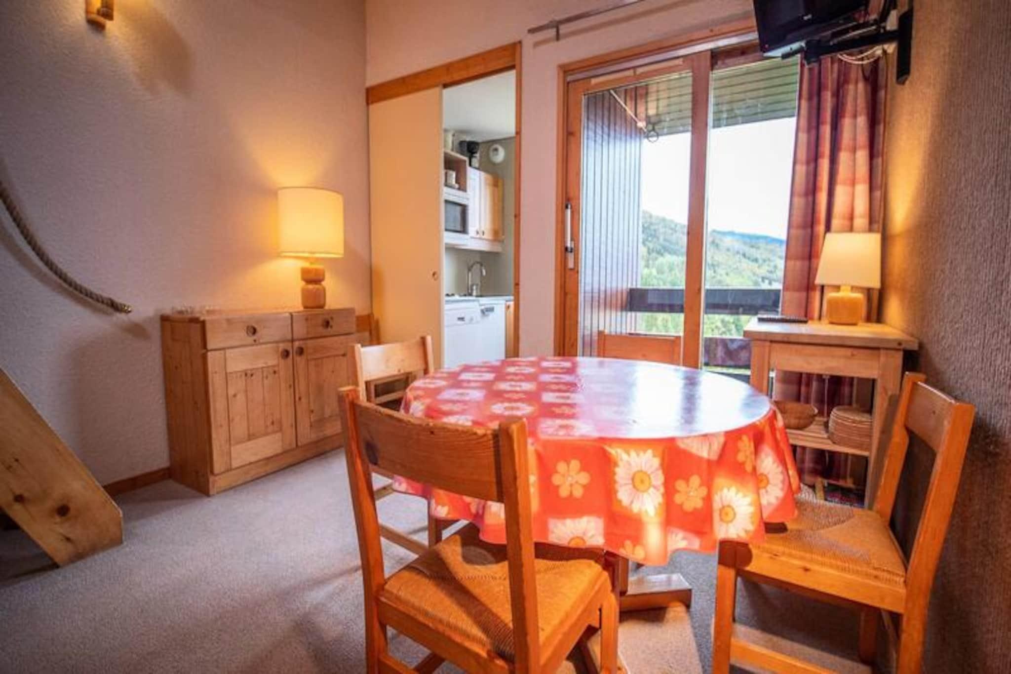 Beliggende i den fredfyldte landsby Le Mottet tilbyder denne charmerende toværelses mezzaninlejlighed et hyggeligt alpint tilflugtssted med direkte adgang til pisterne. Forestil dig at træde ud på din vestvendte balkon med udsigt over de uberørte snedækkede stier og indånde den friske bjergluft, mens solen går ned over toppene. Denne fredelige beliggenhed er perfekt for både familier og skientusiaster og blander ro med uovertruffen bekvemmelighed. Lejligheden ligger kun 20 meter fra skiskolen og en kort 300 meter gåtur fra butikker, hvilket sikrer, at alt hvad du behøver er inden for rækkevidde. \n\nIndenfor er det 31 m² store rum omhyggeligt designet til at rumme op til seks gæster. Stuen har en komfortabel sovesofa og en udtræksseng, mens soveværelset og mezzaninen hver har to enkeltsenge, hvilket giver fleksible sovemuligheder for familier eller grupper. Det separate køkken er fuldt udstyret med opvaskemaskine, elektrisk kogeplade og ovn, hvilket gør det nemt at tilberede solide måltider efter en dag på pisterne. En lys og luftig atmosfære fylder rummet, suppleret af et moderne badeværelse og separat toilet for ekstra bekvemmelighed. Lejligheden har også et skirum og er velkommen til kæledyr, hvilket gør den til et alsidigt valg for alle rejsende. \n\nLe Mottet er et paradis for skiløbere med sit fodgængervenlige område og direkte forbindelse til Valmorels pulserende centrum via Télébourg-jernbanen. Familier med små børn vil sætte pris på nærheden til børnehaven, der er tilgængelig med elevator, mens ældre børn kan tilmelde sig skiskolen kun få skridt væk. Om dagen kan du udforske de vidtstrakte pister eller nyde den charmerende landsbyatmosfære, og om aftenen kan du slappe af i komforten af ??dit bjergparadis. \n\nUanset om du søger spændende alpine eventyr eller en fredelig ferie omgivet af betagende natur, lover denne lejlighed i Le Mottet et uforglemmeligt ophold i hjertet af de franske alper.