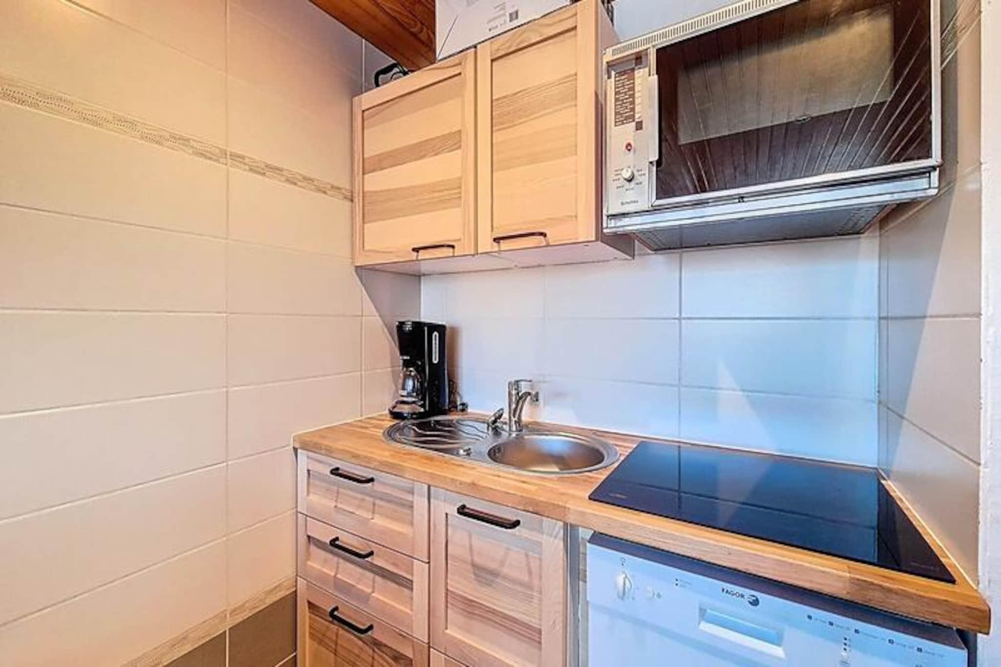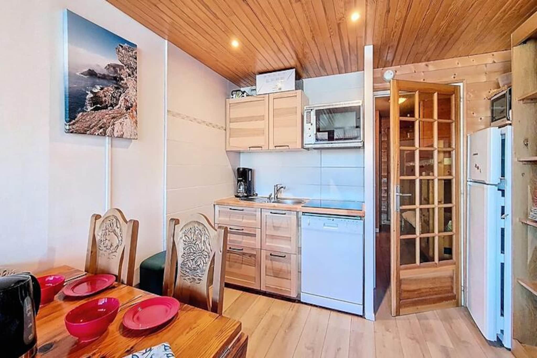 Højt over Val Thorens' travle hjerte tilbyder denne charmerende studiolejlighed et roligt tilflugtssted med betagende udsigt over de omkringliggende alpine tinder. Beliggende på 7. sal i LE SERAC-residensen kombinerer den bekvemmelighed og komfort, hvilket gør den til et ideelt valg for par eller små familier, der søger en mindeværdig bjergferie. Med Péclet-indkøbscentret kun få skridt væk finder du alt, hvad du behøver, fra hyggelige restauranter til lokale butikker og essentielle tjenester, lige uden for døren. Og når det er tid til at tage på pisterne, sikrer direkte adgang via gaden, at du aldrig er langt fra begivenhedernes centrum. \n\nLejligheden er på 34 m² og er omhyggeligt designet til at maksimere plads og lys. Opholdsstuen har en komfortabel sovesofa til to, en anden sofa til afslapning og et fjernsyn til at slappe af efter en dag med eventyr. Det åbne køkken er fuldt udstyret med moderne apparater, herunder et kogeplade med 4 blus, mikrobølgeovn med grillfunktion, køleskab, kaffemaskine, elkedel og brødrister - perfekt til at tilberede solide måltider til dine alpine udforskninger. Soveområdet har køjesenge med en dobbeltseng og en enkeltseng, mens badeværelset har et badekar til at lindre trætte muskler. Et separat toilet giver ekstra komfort.\n\nGæsterne vil sætte pris på flisegulvene, de medfølgende dyner og betænksomme detaljer som et skiskab til nem opbevaring. Boligen sikrer et problemfrit ophold med inkluderet slutrengøring, sengelinned og håndklæder. Bemærk venligst, at lejligheden er røgfri, kæledyrsfri og overholder sikkerhedsforskrifterne for brug af køjesenge.\n\nUanset om du er her for at grave dig gennem uberørt sne eller nyde den pulserende afterskiing-atmosfære, placerer dette hyggelige studie dig i hjertet af det verdensberømte skiområde Les Trois Vallées. Med sin uovertrufne beliggenhed, fantastiske udsigt og indbydende atmosfære er det den perfekte base for at skabe uforglemmelige alpine minder.