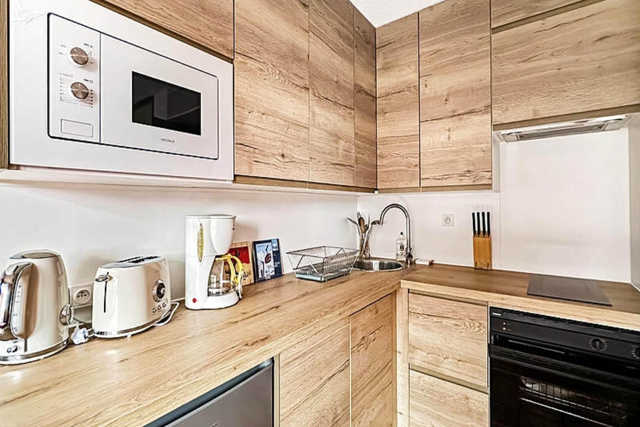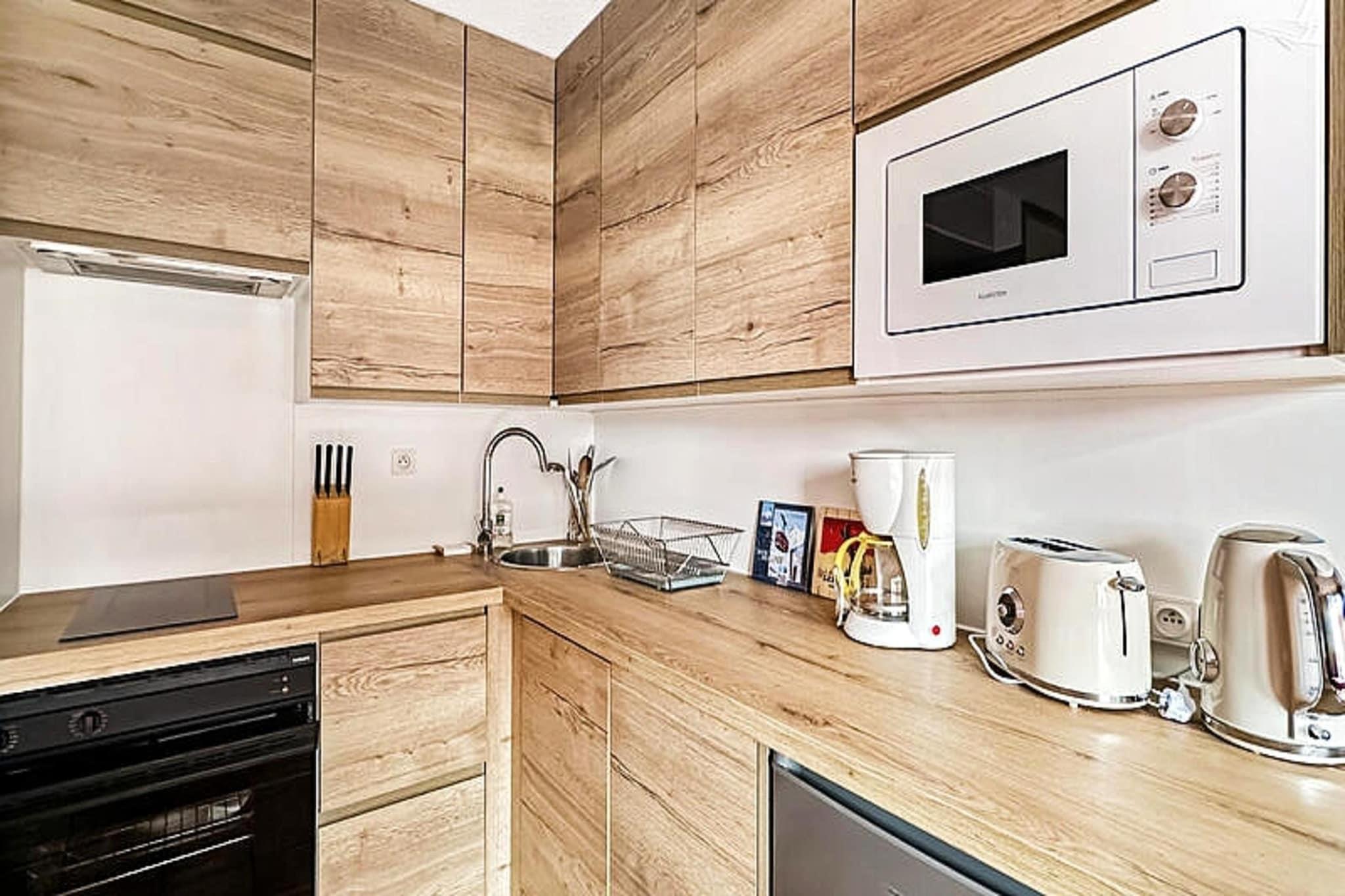 Dette hyggelige bjerghjørne-studie, beliggende på første sal i en sikker bygning med elevator, kan komfortabelt rumme op til 4 gæster. Den har to køjesenge i et udpeget soveværelse og en sovesofa i stuen. Studiet er designet til bekvemmelighed, med et tv til underholdning og rigelig plads til afslapning. Ejendommen er kæledyrsvenlig, hvilket sikrer, at dine lodne ledsagere kan slutte sig til dig på din flugt. Ejendommen er beliggende i hjertet af landsbyen og er ideelt beliggende nær en række attraktioner, caféer og lokale markeder. Den fantastiske Aravis-bjergkæde byder på en naturskøn kulisse, og gæsterne kan nyde nærliggende vandreture, skiløb og udendørsaktiviteter. Med landsbyens centrum kun en kort gåtur væk, har du nem adgang til restauranter, butikker og andre faciliteter, der vil gøre dit ophold mere behageligt. Studiet er udstyret med et fuldt funktionelt tekøkken med ovn, elektrisk kogeplade, køleskab og mikrobølgeovn, så du kan tilberede dine yndlingsmåltider. Badeværelset, med et vindue til naturligt lys, er adskilt fra toilettet, hvilket giver ekstra komfort. Et dedikeret skiskab er tilgængeligt i kælderen, hvilket sikrer nem opbevaring af dit skiudstyr. Denne ejendom byder på alt det nødvendige for et mindeværdigt bjergretræte.