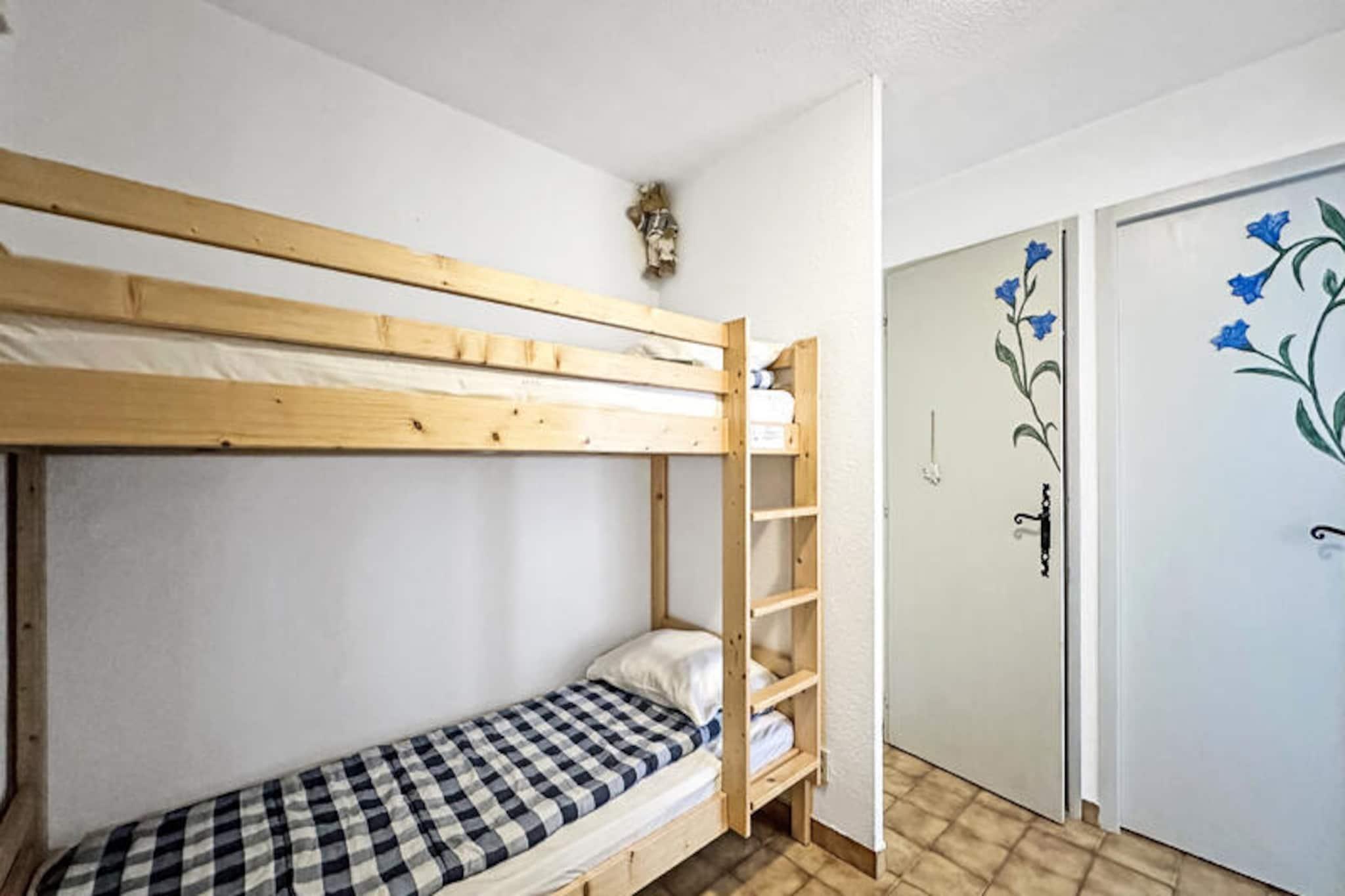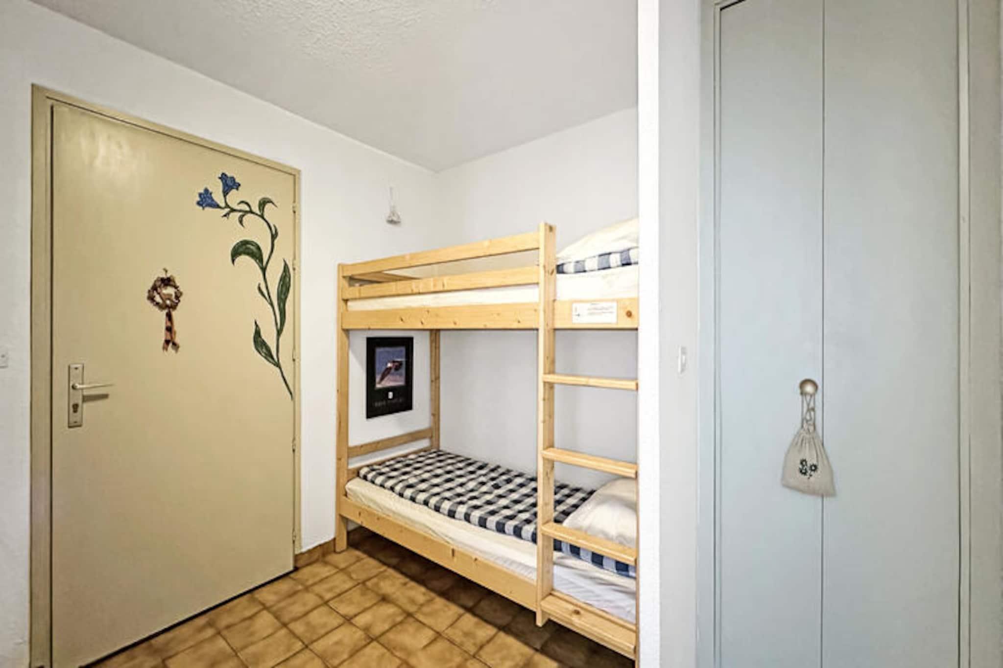 I hjertet af den maleriske landsby Les Campanules tilbyder denne charmerende studiolejlighed et hyggeligt tilflugtssted for op til fire gæster. Beliggende på første sal i en bolig med elevatoradgang, kombinerer lejligheden bekvemmelighed og komfort med et strejf af alpin charme. Forestil dig at vågne op til en fredfyldt udsigt over skiløjperne fra din østvendte balkon, klar til at omfavne en dag med eventyr eller afslapning i disse idylliske bjergomgivelser. Kun 100 meter fra landsbytorvet finder du dig selv perfekt placeret til at nyde både den livlige resortatmosfære og roen i dit eget rum. \n\nStudiolejligheden på 29 m² er omhyggeligt designet med to separate soveområder, herunder en sovealkove med køjesenge og en stue med en komfortabel dobbeltsovesofa. Tekøkkenet er fuldt udstyret med moderne apparater såsom ovn, mikrobølgeovn, induktionskogeplader, køleskab, opvaskemaskine og både filterkaffemaskine og Nespresso-maskine - perfekt til at tilberede solide morgenmader eller hyggelige middage efter en dag på pisterne. Et badeværelse og separat toilet bidrager til rummets praktiske anvendelighed og sikrer et problemfrit ophold for familier eller små grupper. \n\nTræd udenfor og oplev bekvemmeligheden ved at have alt hvad du behøver lige ved hånden. I stueetagen af ??boligen finder du et bageri, en ostebutik, der tilbyder lokale Savoyard-specialiteter, en skiudlejning og en dejlig restaurant. Uanset om du køber friskbagte kager til morgenmad eller nyder et traditionelt alpint måltid, er landsbyens charme lige ved hånden. \n\nMed sin førsteklasses beliggenhed, varme atmosfære og nemme adgang til både faciliteter og udendørseventyr er denne studiolejlighed den perfekte base for at skabe uforglemmelige minder i de franske alper. Uanset om du er her for at stå på ski, vandre eller blot nyde bjergluften, byder Les Campanules dig velkommen til at opleve magien ved det alpine liv.