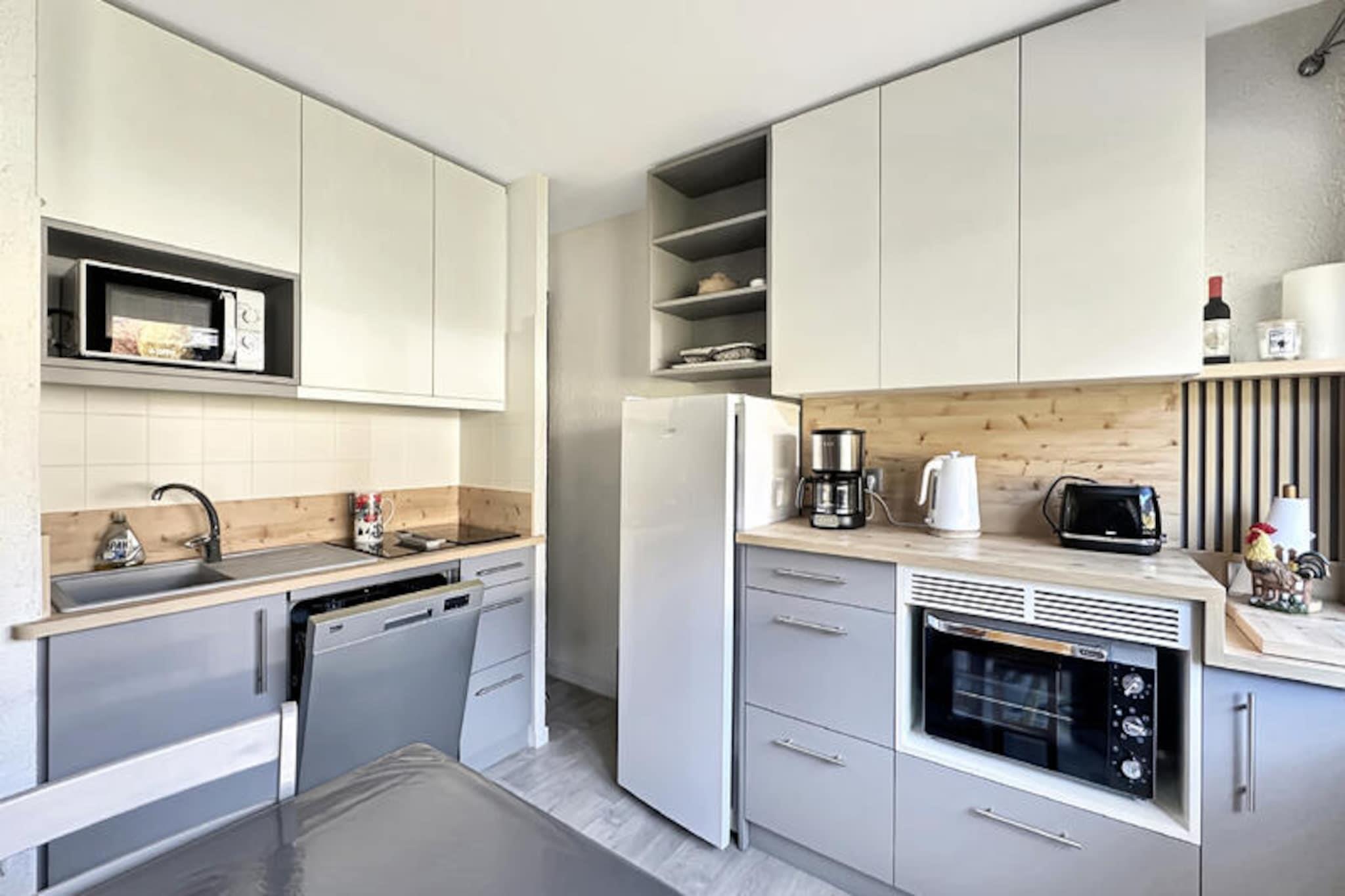 Rummelig studiolejlighed med sovealkove og et fuldstændig renoveret køkken, beliggende i "Le Thoral"-residensen. Ved foden af ??begynderpisterne og 350 meter fra landsbyens centrum. På første sal i residensen, med 34 m² boligareal, har den to soveområder adskilt af en skydedør til plads til 4/5 personer: en sovealkove (2 køjesenge + 1 udtræksseng) og et opholdsområde (1 sovesofa), et fuldt udstyret og nyrenoveret køkken, et badeværelse og et separat toilet. Den østvendte balkon tilbyder en smuk udsigt over pisterne. Ideelt beliggende ved siden af ??begynderpisten, der også fungerer som kælkebane om aftenen. Plads til: 4/5 personer Niche: 2 køjesenge + 1 udtræksseng Stue (TV): 1 sovesofa (140 cm) Køkken: opvaskemaskine, miniovn, 2-brænder keramisk kogeplade, køleskab, fryser, mikrobølgeovn Badeværelse, separat toilet Skiboks nr. 22 (Stueetage, dør bagest til højre) Yderligere ydelser betales på stedet: Depositum (refunderbart) EURO225,00 pr. booking