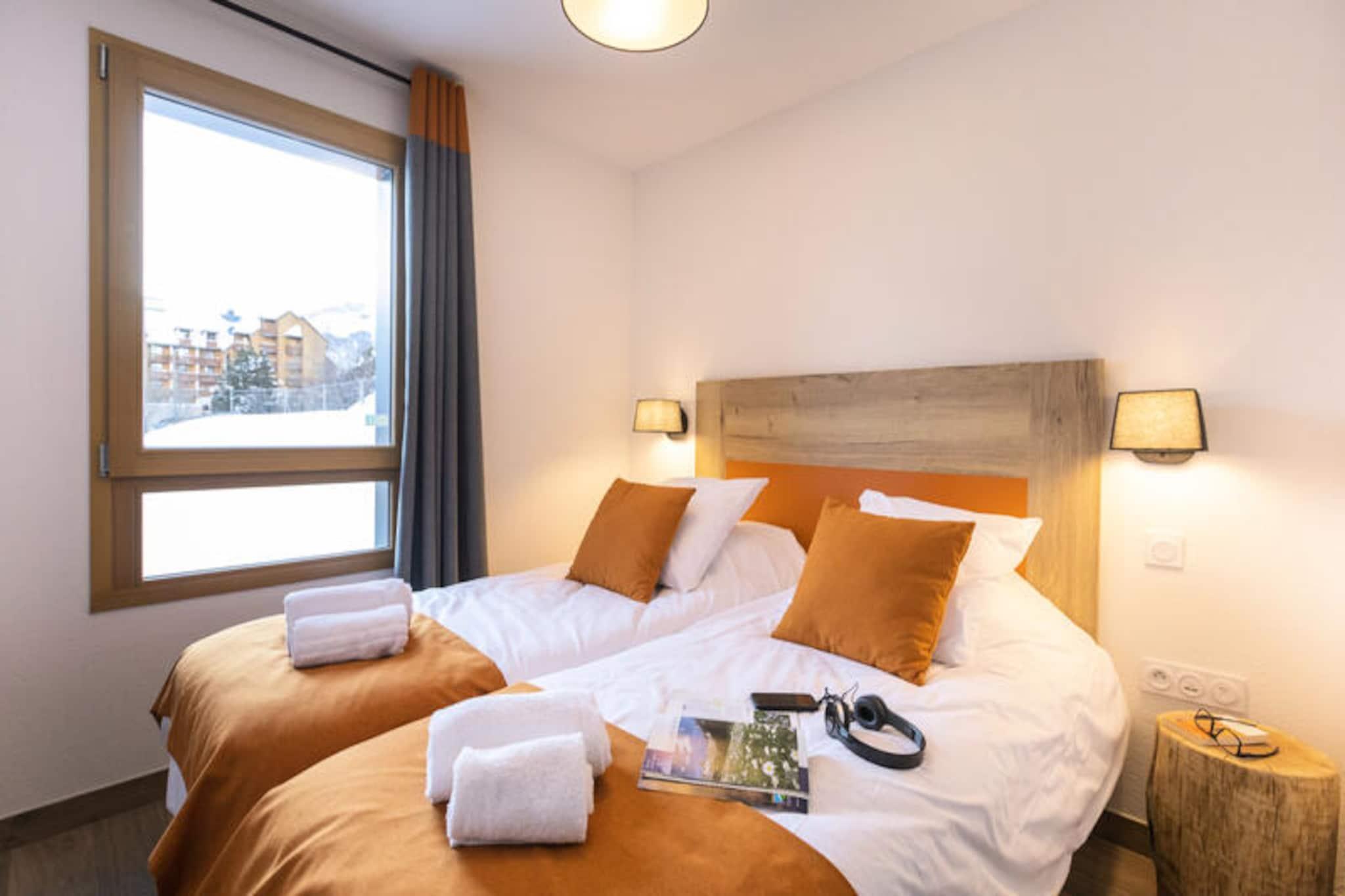 I hjertet af det pulserende Clarines-distrikt i Les Deux Alpes inviterer det helt nye MMV Les Clarines**** Residence Club dig til at opleve en bjergferie som ingen anden. Forestil dig at vågne op til den friske alpeluft, kun få skridt fra pisterne og skilifterne, klar til en dag med spændende eventyr. Denne moderne bolig kombinerer komfort og bekvemmelighed og tilbyder en varm velkomst i sin rummelige lounge med en hyggelig pejs og en stilfuld bar, der åbner ud til en solrig terrasse, perfekt til afslapning efter en dag på pisterne. Uanset om du er her for at stå på ski eller blot for at nyde bjergenes skønhed, er dette din port til uforglemmelige øjeblikke. \n\nResidensen er designet med familier og grupper i tankerne og tilbyder omhyggeligt indrettede boliger. Stuen har en sovesofa til to personer, mens tre soveværelser med justerbare enkeltsenge og et lille soveværelse med køjesenge sikrer afslappende nætter for op til otte gæster. Tre badeværelser, et fuldt udstyret køkken og en balkon eller terrasse bidrager til komforten og gør det nemt at slappe af og lade op. Moderne faciliteter som gratis WiFi, babysæt og ladestationer til elbiler opfylder alle dine behov, mens den indendørs/udendørs swimmingpool, sauna og hammam lover luksuriøs afslapning. \n\nUd over residensen tilbyder Les Deux Alpes uendelige muligheder. Fra spændende skipister til afterski-aktiviteter summer feriestedet af energi. Børneklubber for alderen 18 måneder til 17 år tilbyder engagerende aktiviteter med bjergtema, mens voksne kan nyde underholdningsteamets daglige programmer. For dem, der søger ro, er vandområdet med massagefaciliteter en fredelig oase. Med restauranter, butikker og betagende alpine udsigter i nærheden er hvert øjeblik her en hyldest til bjergene. \n\nVælg MMV Les Clarines**** Residence Club for en ferie fyldt med latter, eventyr og afslapning i et af Frankrigs mest elskede skisportssteder.