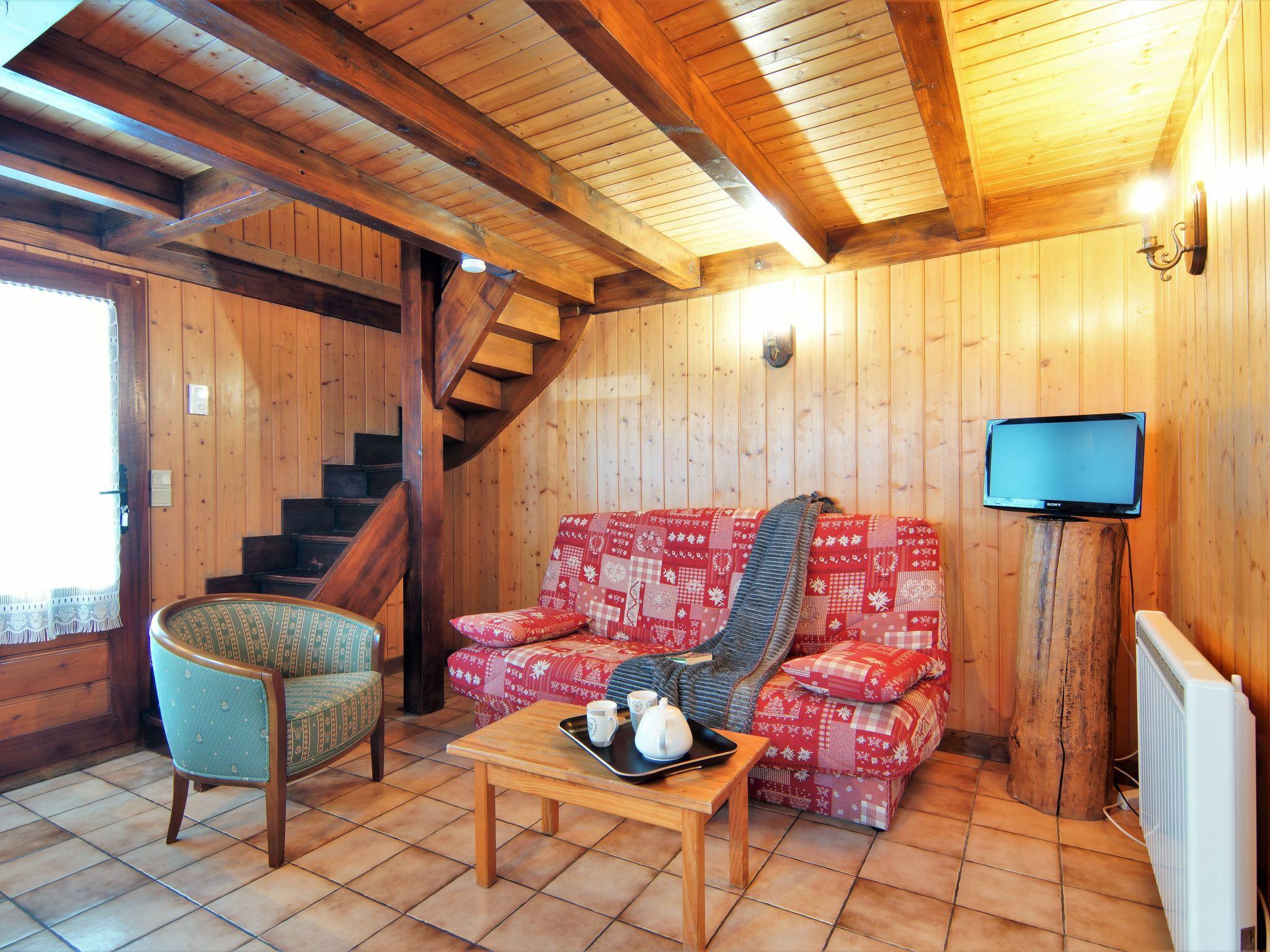 3-room chalet 60 m2 on 2 levels. Very simple and wooden furniture furnishings: living/dining room with 1 double sofabed (130 cm, length 190 cm), TV. Kitchenette (oven, dishwasher, 4 ceramic glass hob hotplates, kettle, electric coffee machine, raclette grill). Shower/WC. Upper floor: 1 room with sloping ceilings, ceiling height 110 - 230 cm with 1 french bed (130 cm, length 190 cm). 1 room with sloping ceilings, ceiling height 110 - 230 cm with 2 beds and electric heating. Balcony, terrace, south-west facing position, garden. View of the mountains. Facilities: washing machine. Internet (WiFi, extra). Please note: TV only FR. Smoke alarm. 741430001464B
