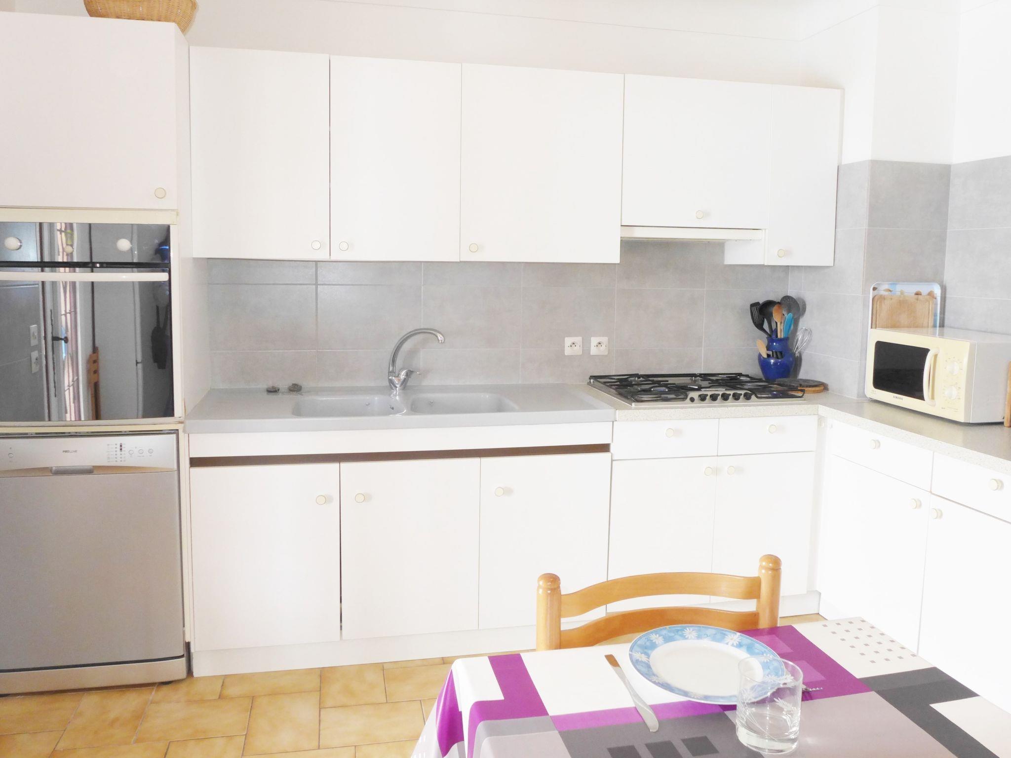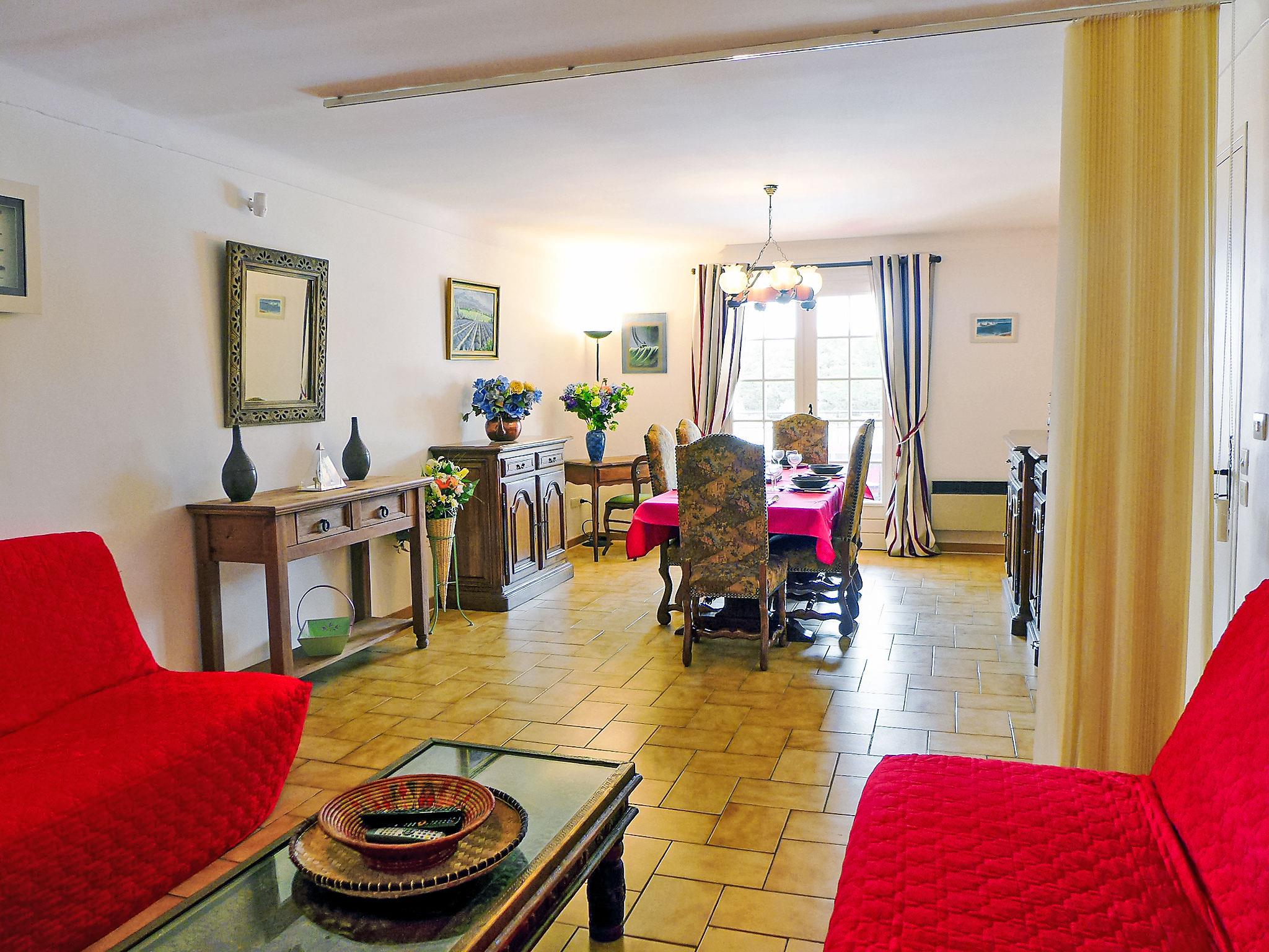 3-room apartment 90 m2, lower ground floor. Comfortable furnishings: living/dining room with 1 double sofabed (1 x 140 cm, length 190 cm), TV (flat screen), air conditioning. Exit to the terrace, to the swimming pool. 1 room with 2 beds (90 cm, length 190 cm), air conditioning. 1 room with 1 french bed (1 x 160 cm, length 200 cm), air conditioning. Open kitchen (5 hot plates, oven, dishwasher, kettle, microwave, freezer, electric coffee machine). 2 baths/WC. Electric heating. Large terrace 20 m2. Electric barbecue, deck chairs. Beautiful view of the sea and the swimming pool. Facilities: washing machine, iron, children's high chair, baby cot, hair dryer. Internet (WiFi, free). Parking. Please note: smoke alarm. 83107000208L3
