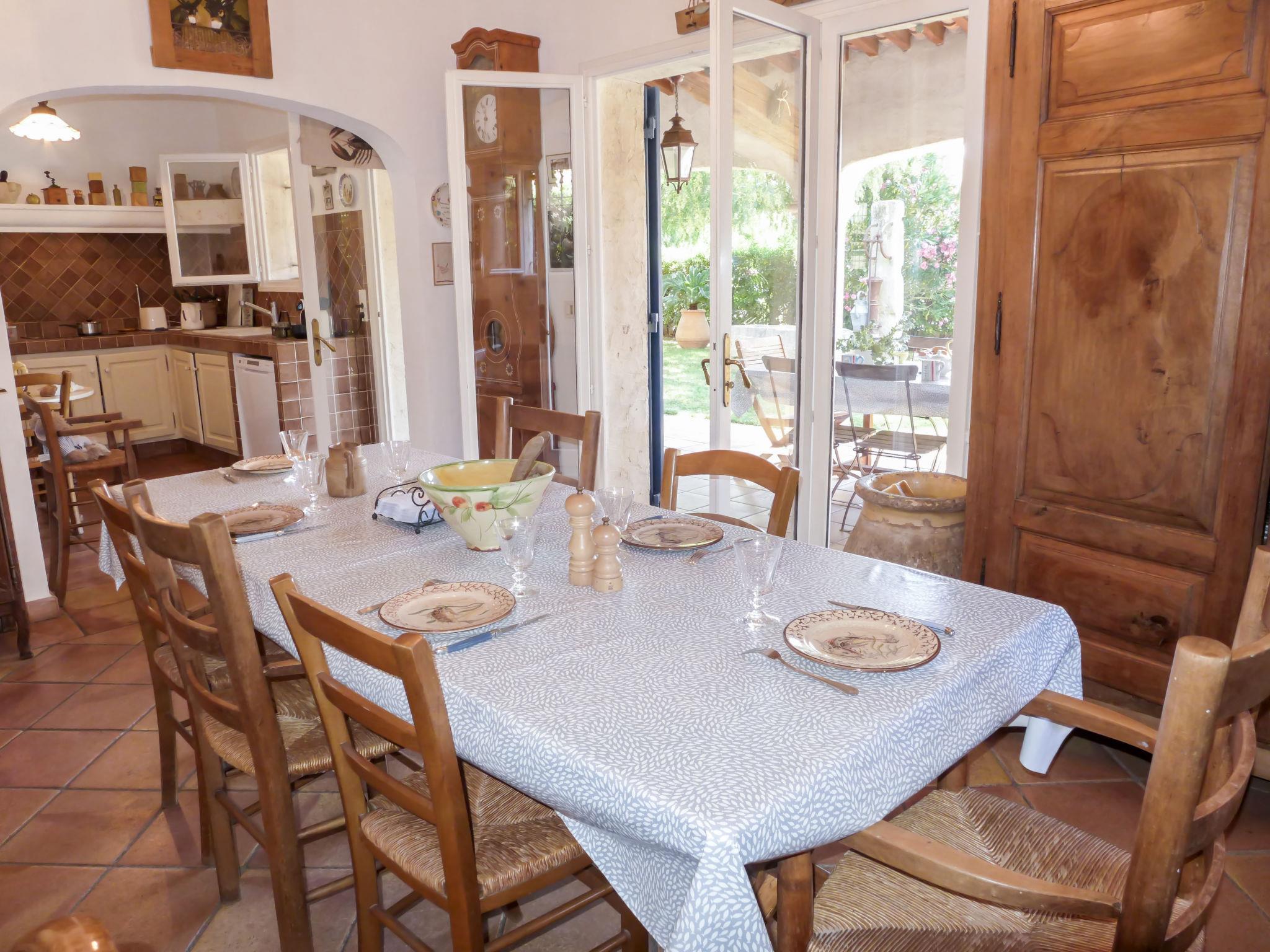 4-room house 130 m2 on 2 levels, south facing position. Beautiful and wooden furniture furnishings: living/dining room with open-hearth fireplace. Exit to the garden, to the terrace. Open kitchen (oven, dishwasher, microwave). Bath/WC. Electric heating. Upper floor: open gallery with TV. 1 room with 2 beds (90 cm, length 190 cm), air conditioning. 1 room with 1 french bed (160 cm, length 200 cm), air conditioning. 1 room with 1 french bed (140 cm, length 190 cm), air conditioning. Shower, sep. WC. Terrace, garden 500 m2, south facing position. Terrace furniture, electric barbecue, deck chairs (4). Facilities: washing machine, children's high chair, baby cot for up to 2 year olds. Internet (WiFi, free). Parking (fenced 2 cars). Please note: smoke alarm. Provencale house with antique furniture. It is forbidden to wear bermuda shorts in the swimming pools. Instead of an enclosed bedroom, some sleeping areas are located in an open-plan area (gallery, alcove, etc.). 83107000230YU